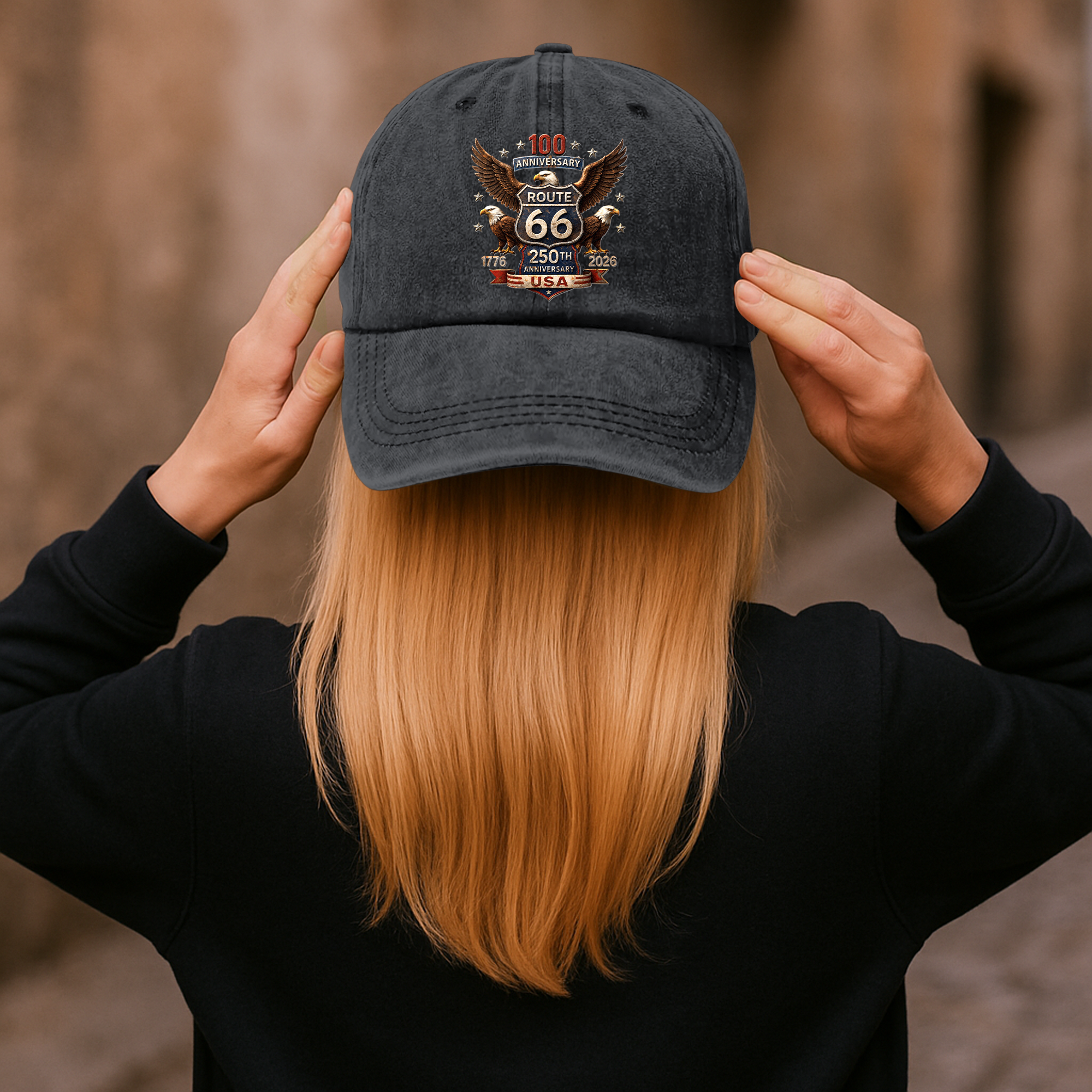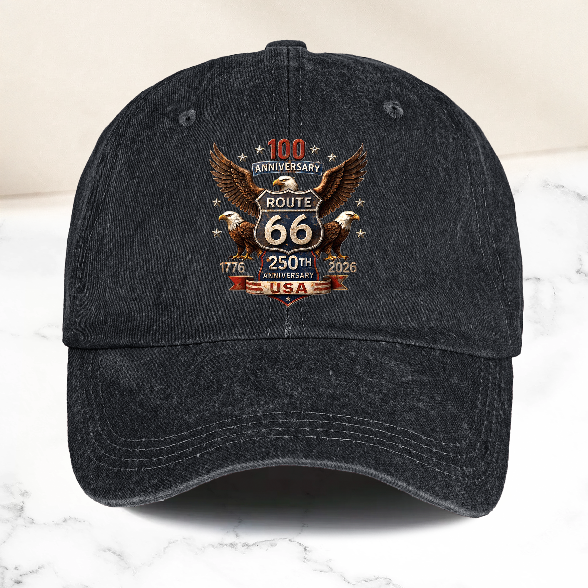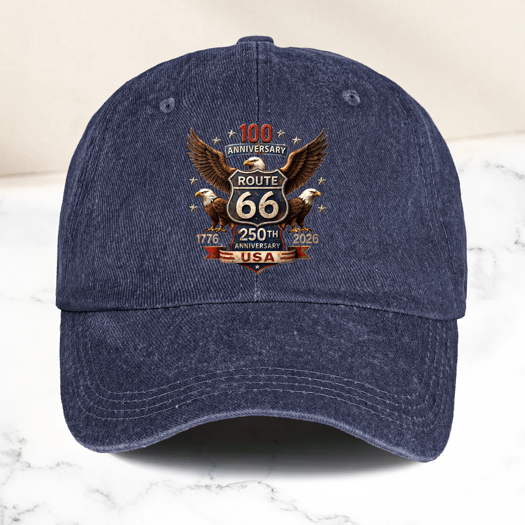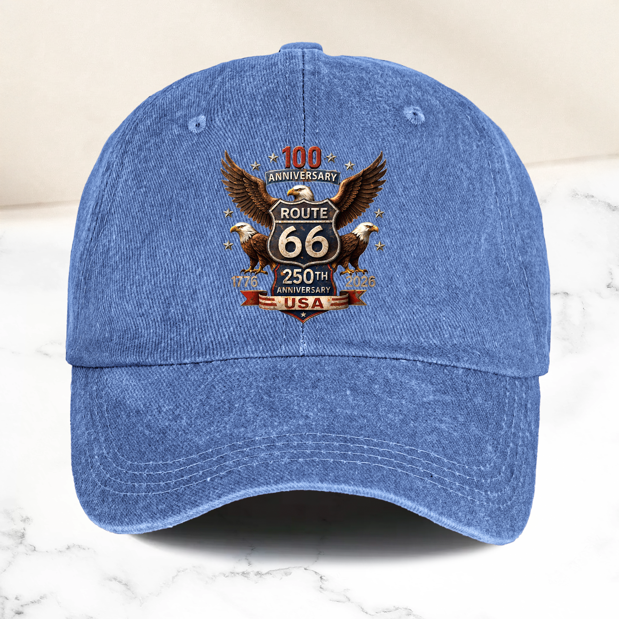 Introducing our 100 Years Route 66 250 Years USA - Personalized Distressed Denim Cap! Crafted with style and sentiment in mind, this cap acts as a symbol of national pride taking you on a route of unique American history. Guaranteed to resonate with those who love travelling and the spirit of freedom, it's a perfect embodiment of camaraderie.