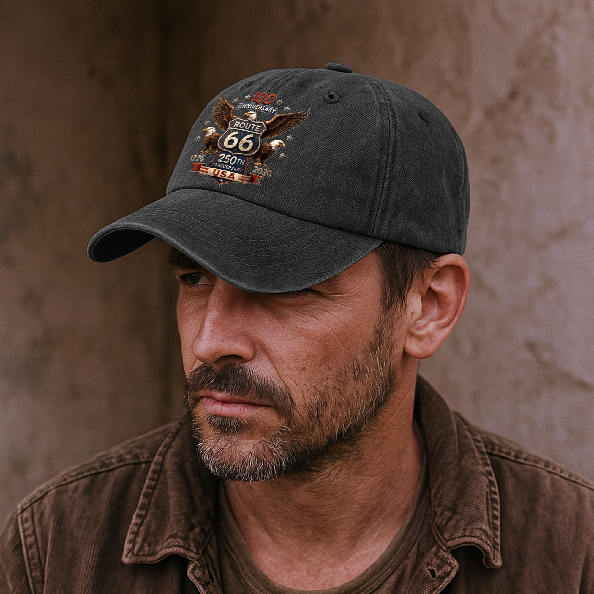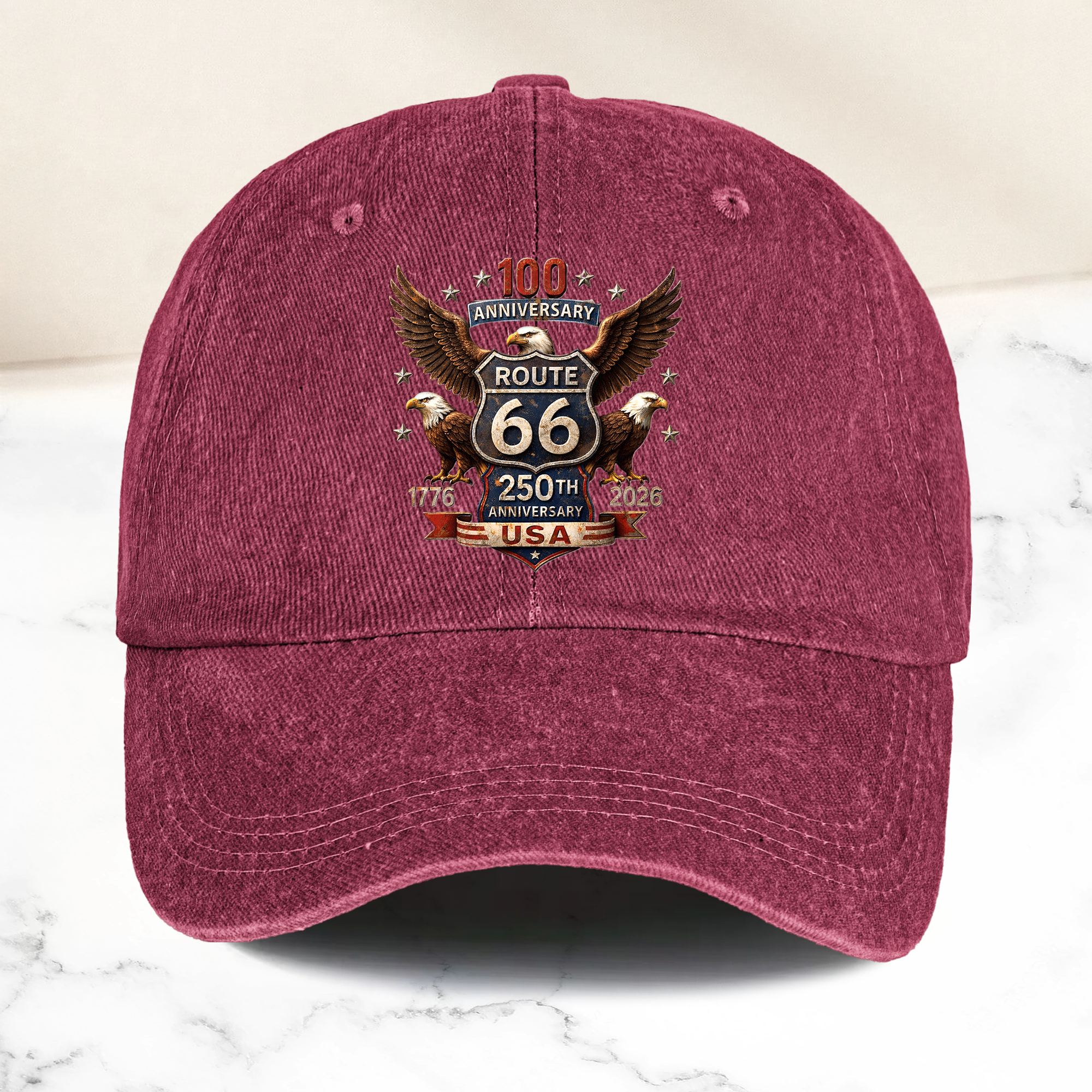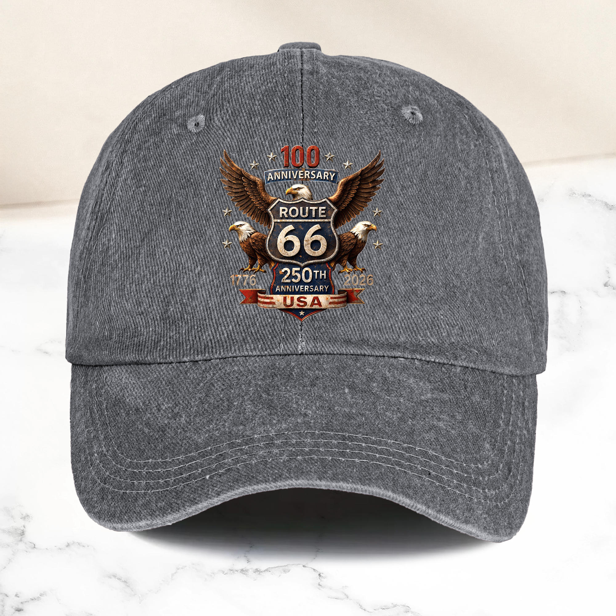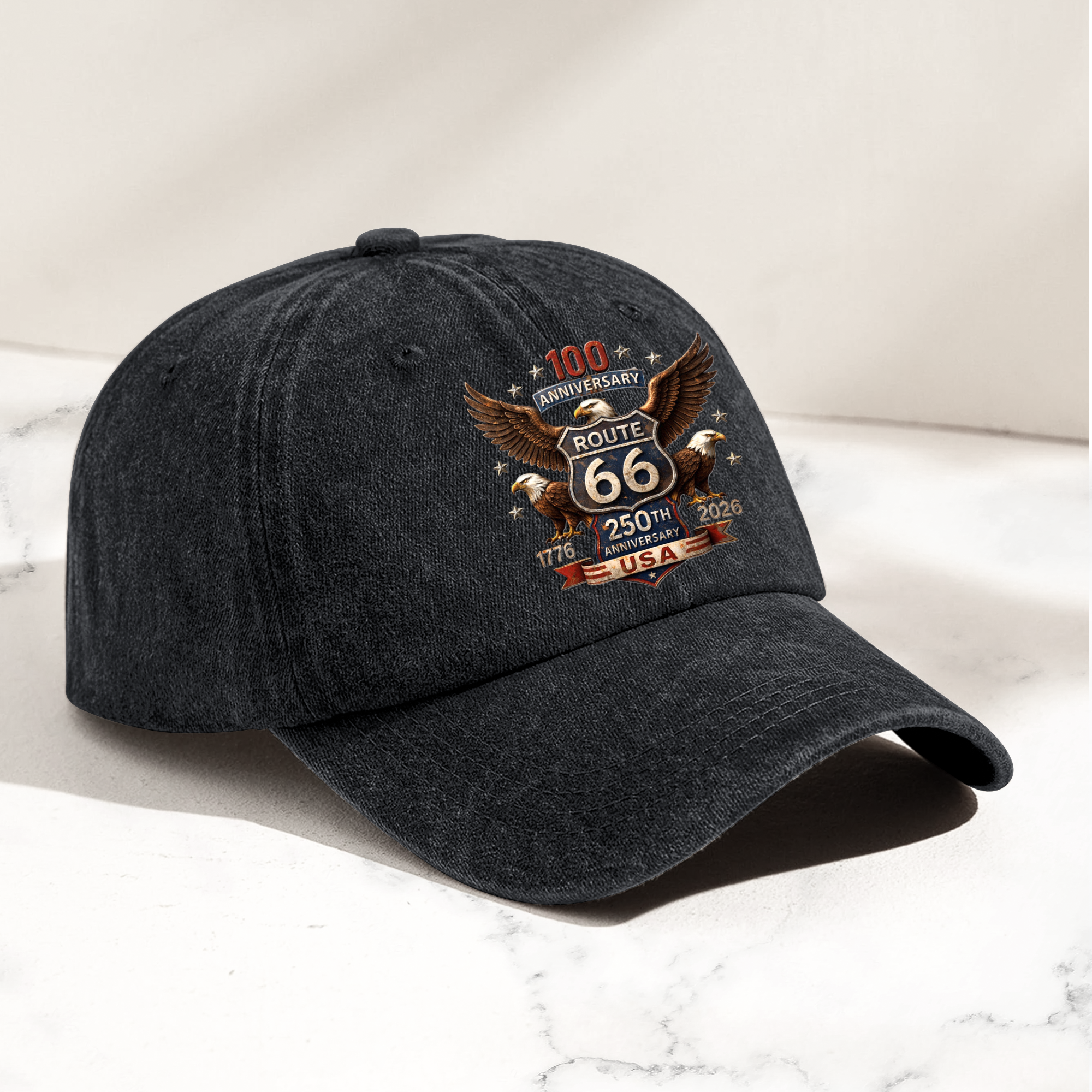 Introducing our 100 Years Route 66 250 Years USA - Personalized Distressed Denim Cap! Crafted with style and sentiment in mind, this cap acts as a symbol of national pride taking you on a route of unique American history. Guaranteed to resonate with those who love travelling and the spirit of freedom, it's a perfect embodiment of camaraderie.