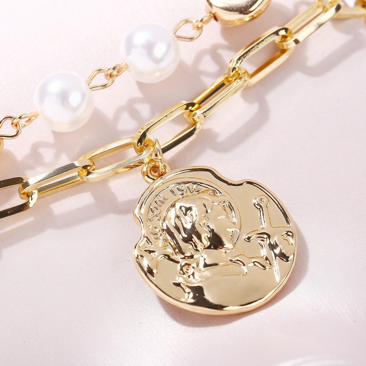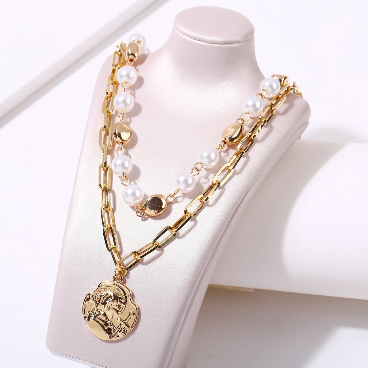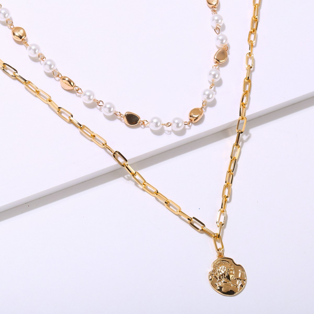 2 Piece Pearl Coin Head Necklace Goldtone Necklace ITALY Design