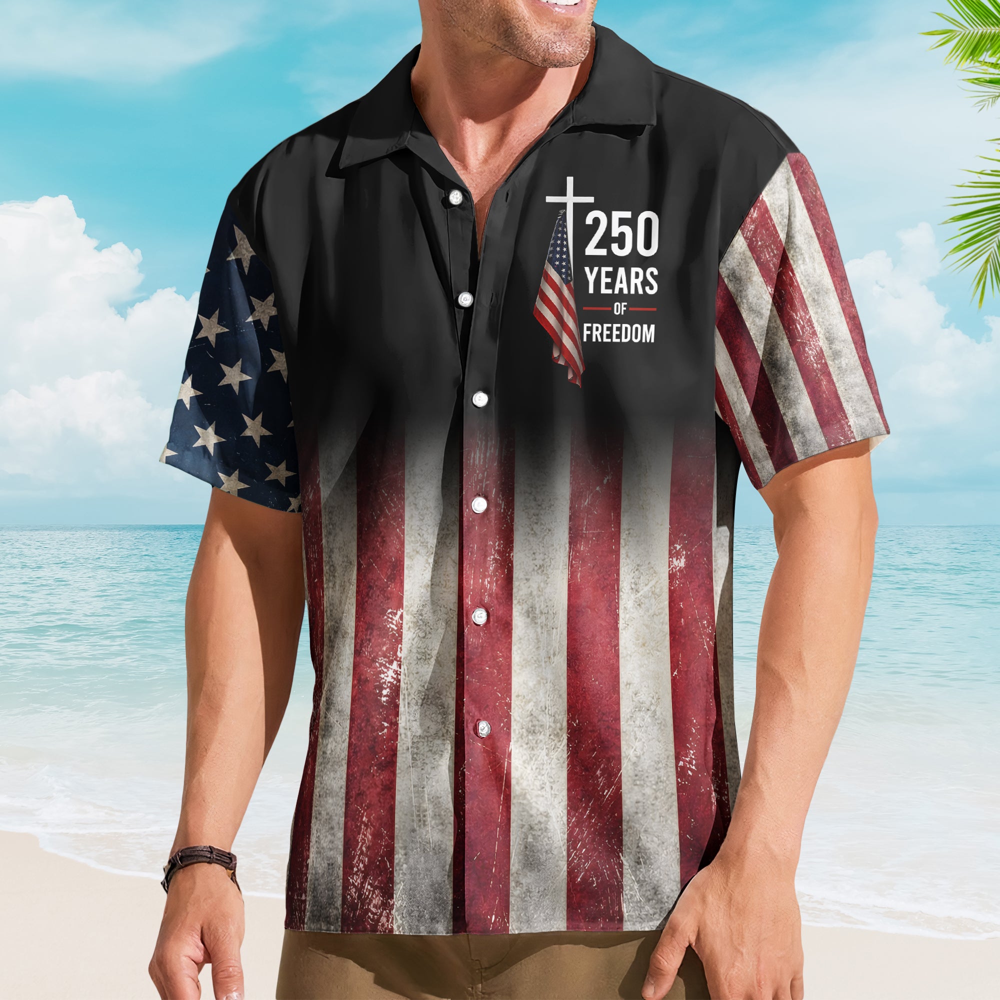 Celebrate your love for the USA with our 250 Years American Flag - Hawaiian Shirt, a trendy clothing item that embodies a spirited style. This Hawaiian shirt, characterized by its vibrant design, pays tribute to two and a half centuries of American history, making it a stylish choice for those who appreciate the richness of America's legacy. Perfect for Independence Day celebrations, birthdays, anniversaries, or any occasion that calls for a burst of patriotic fervor.