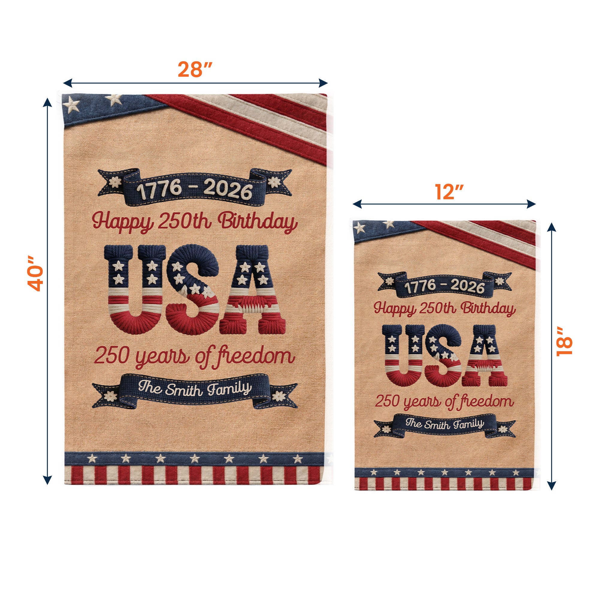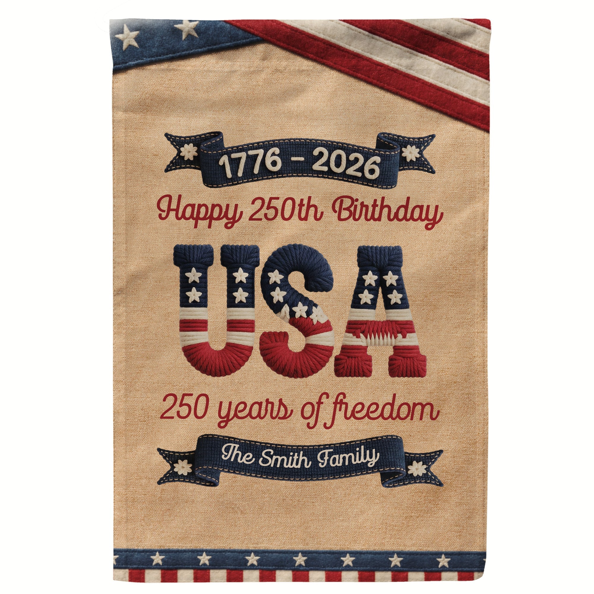 Celebrate the spirit of liberty with our 250 Years Of Freedom USA Birthday Faux Pattern Personalized Flag. This vibrant keepsake not only signifies the essence of freedom that binds us, but also adds a touch of personal charm to your home or garden decor. Bearing the message of 250 Years Of Freedom, it's an impressive reflection of our nation's resilience and unity, making it a truly special gift for your family, or even a treat for yourself!