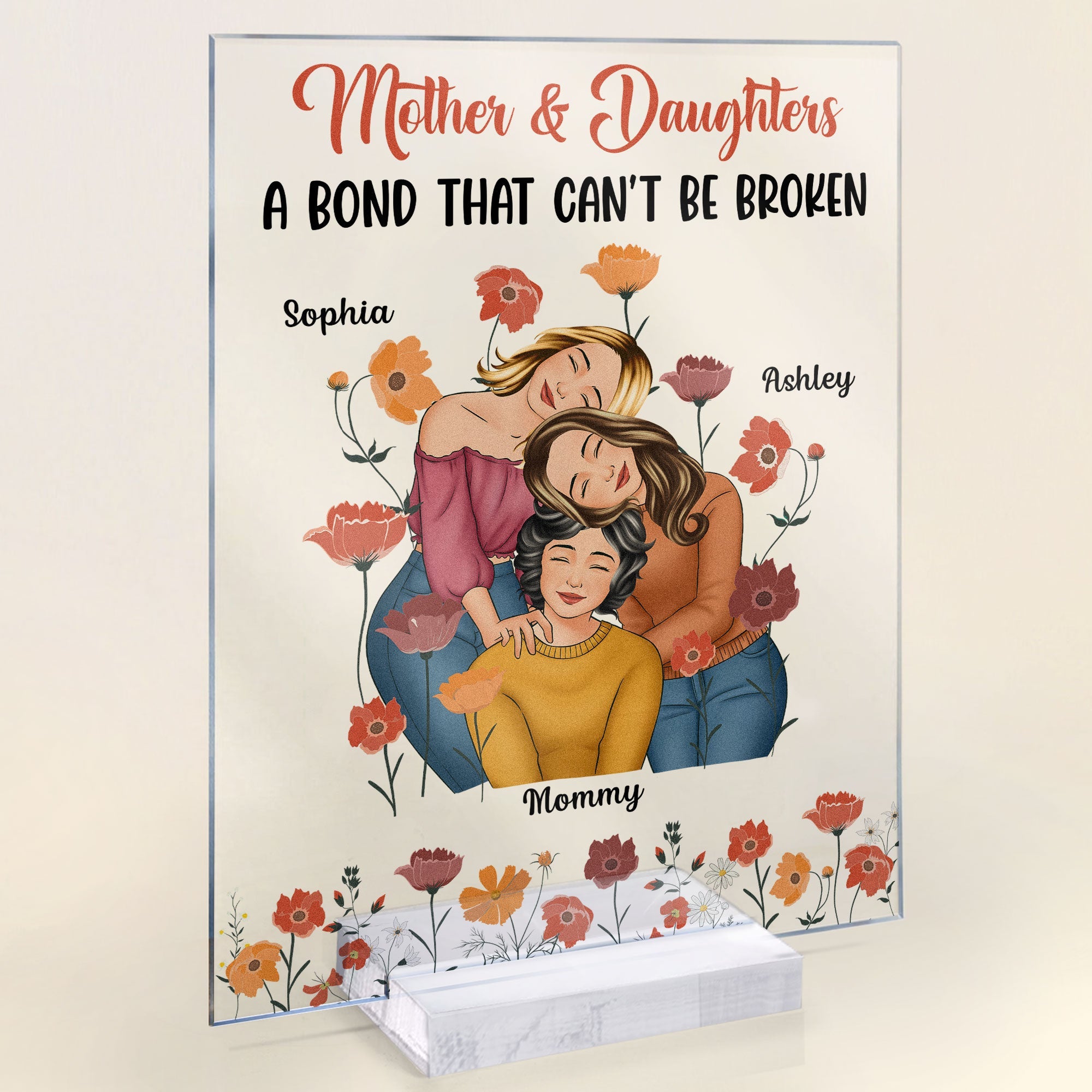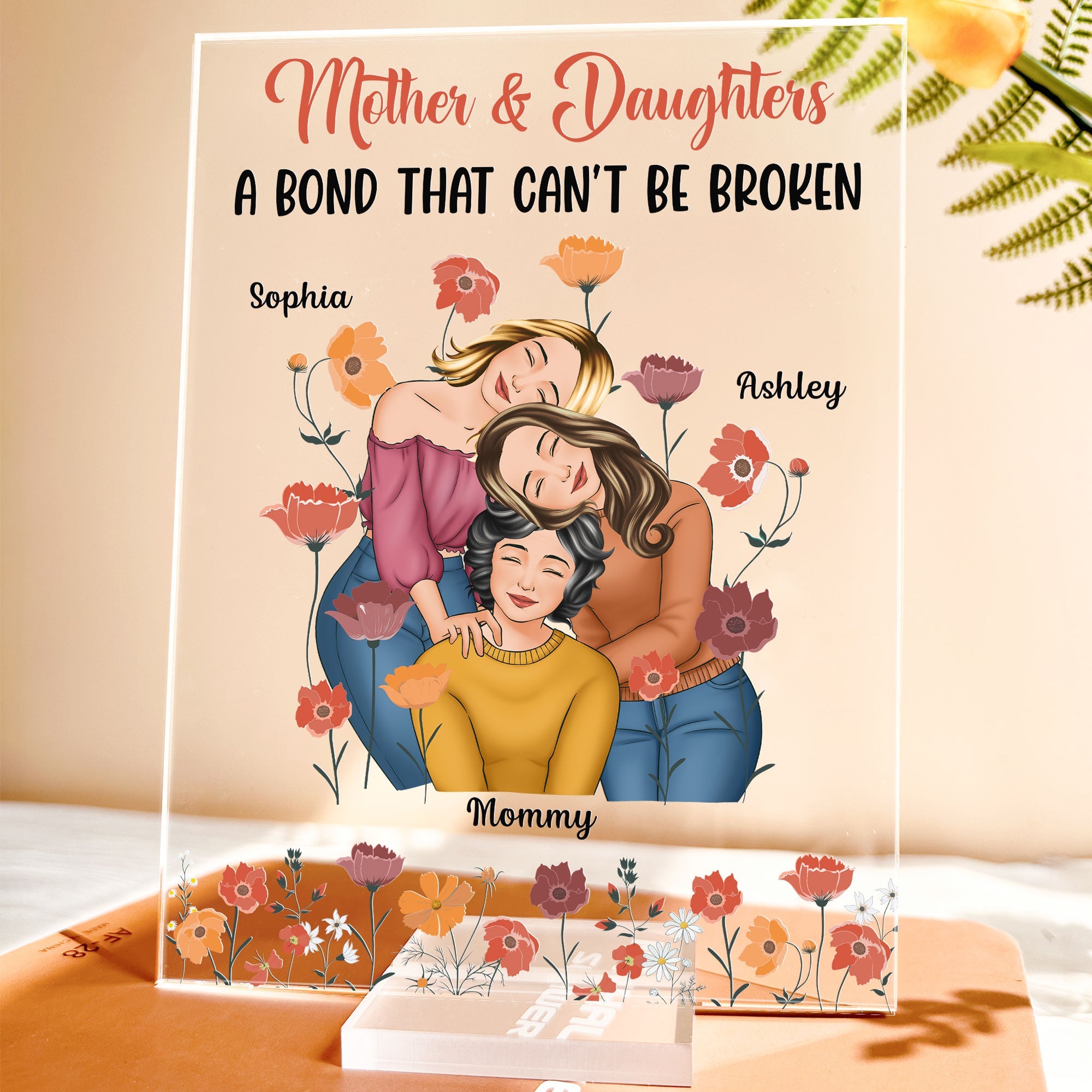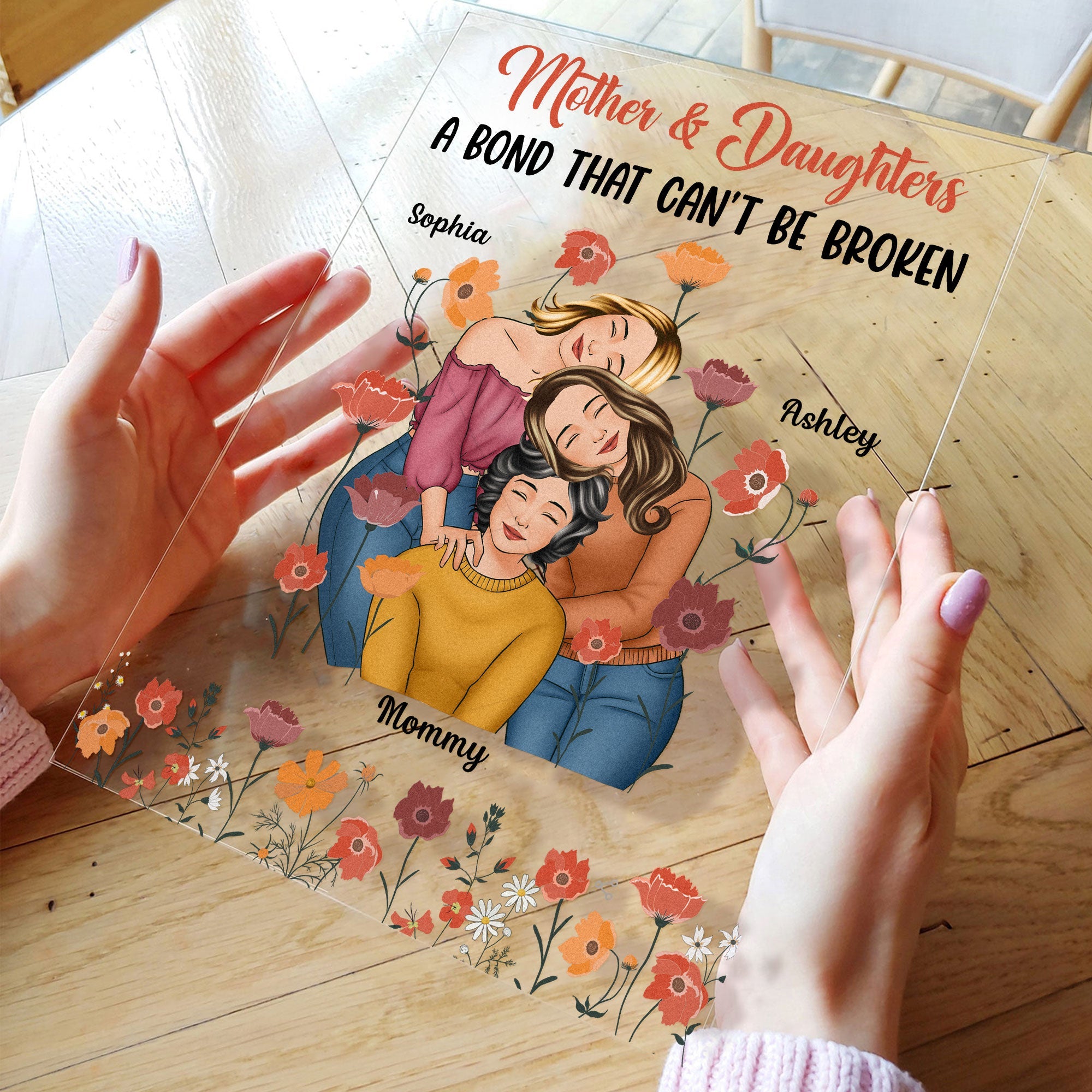 This Mother's Day, celebrate the unbreakable bond between mother and daughters with this beautiful, personalized acrylic plaque. It features a heartwarming design of a mother and her daughters, arm in arm, symbolizing their eternal connection and love. This plaque not only captures the essence of family but also serves as a daily reminder of the love and memories shared. It's more than a gift; it's a keepsake that will be cherished by any mom for years to come, making it the perfect tribute this Mother's Day.