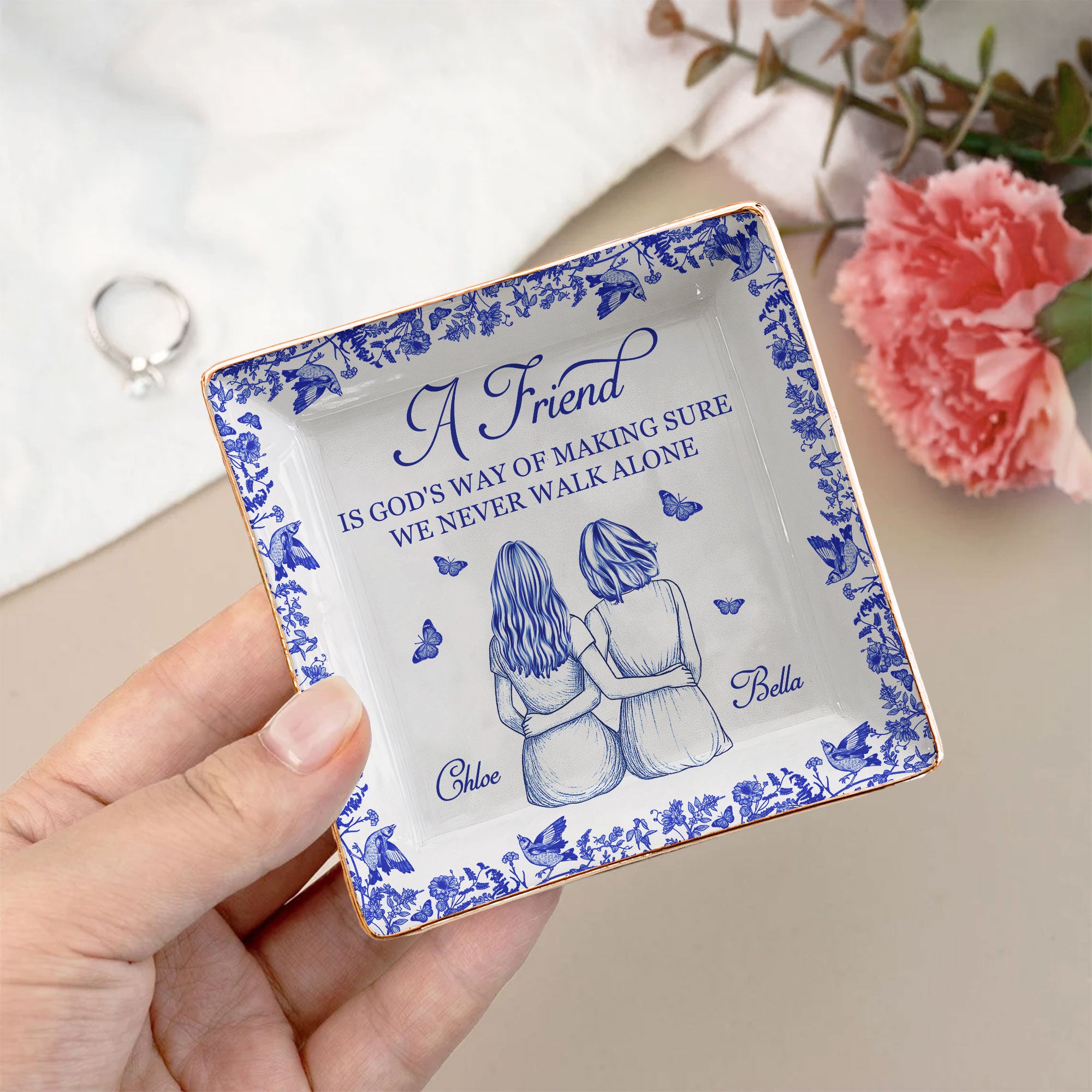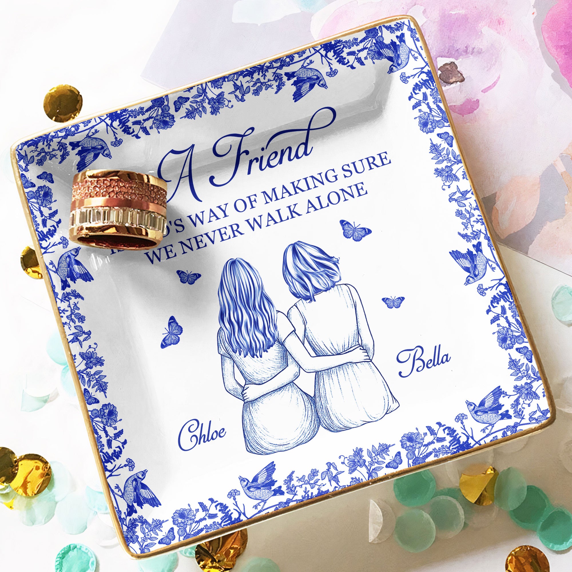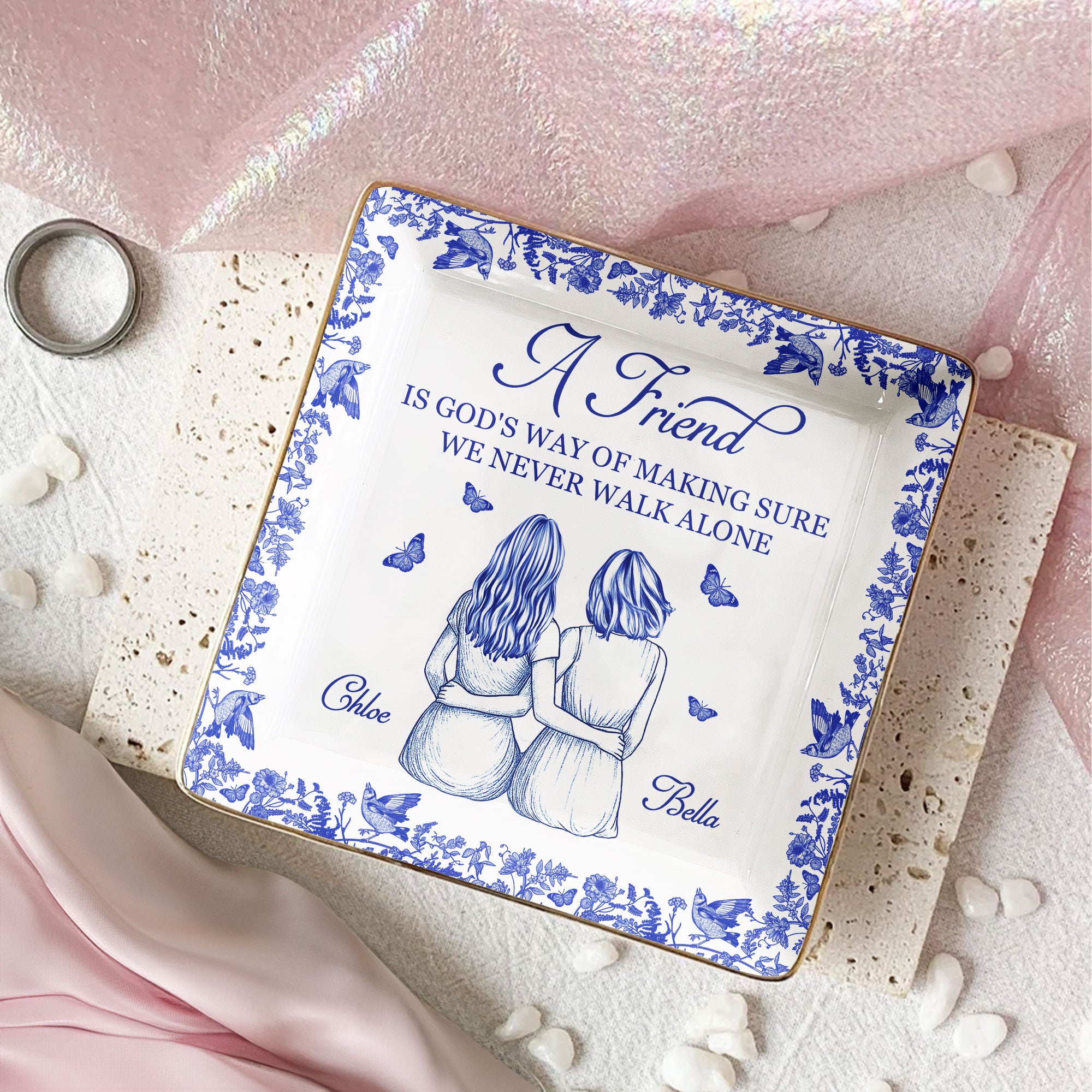 Experience the joy of heartfelt connections with our Square Jewelry Dish, titled "A Friend Is God's Way Of". This piece captures the essence of friendship, manifesting the notion that friendships are divine interventions ensuring we never tread life's path in solitude. It’s a token of our shared existence and wonderful relationships, making it a perfect keepsake for your cherished friend. Ideal for birthdays, anniversaries, or Christmas, it’s a versatile gifting option that translates your feelings into a memorable gesture!