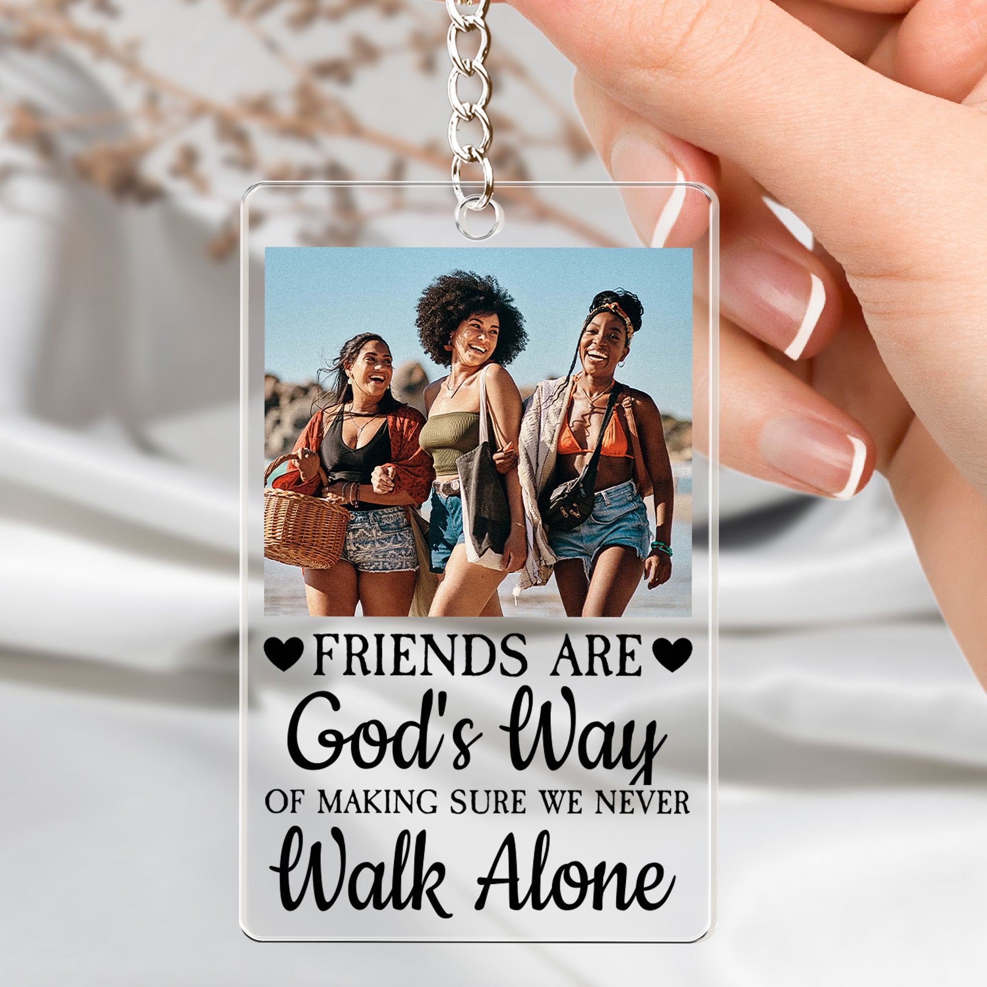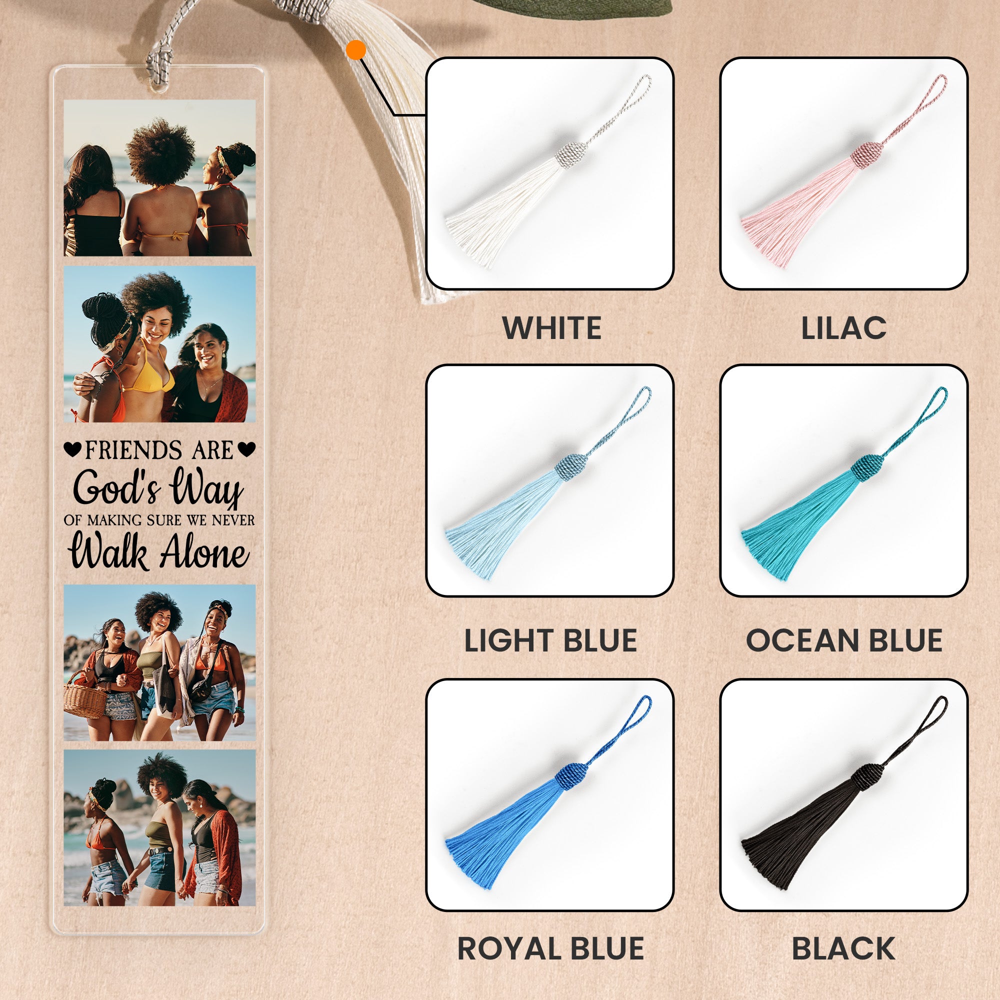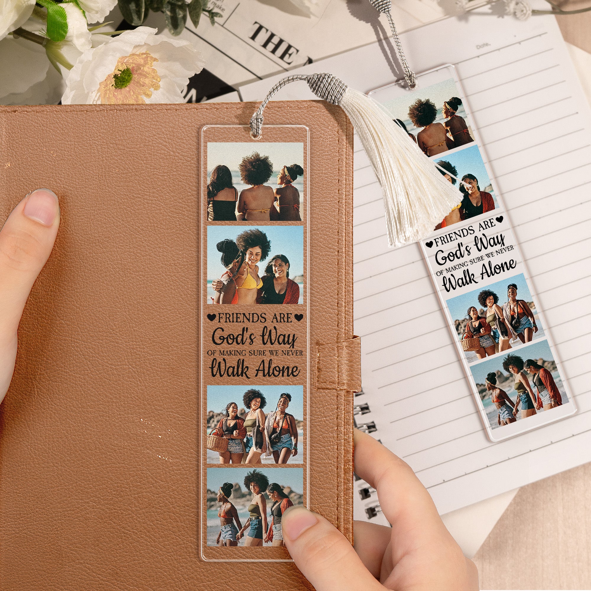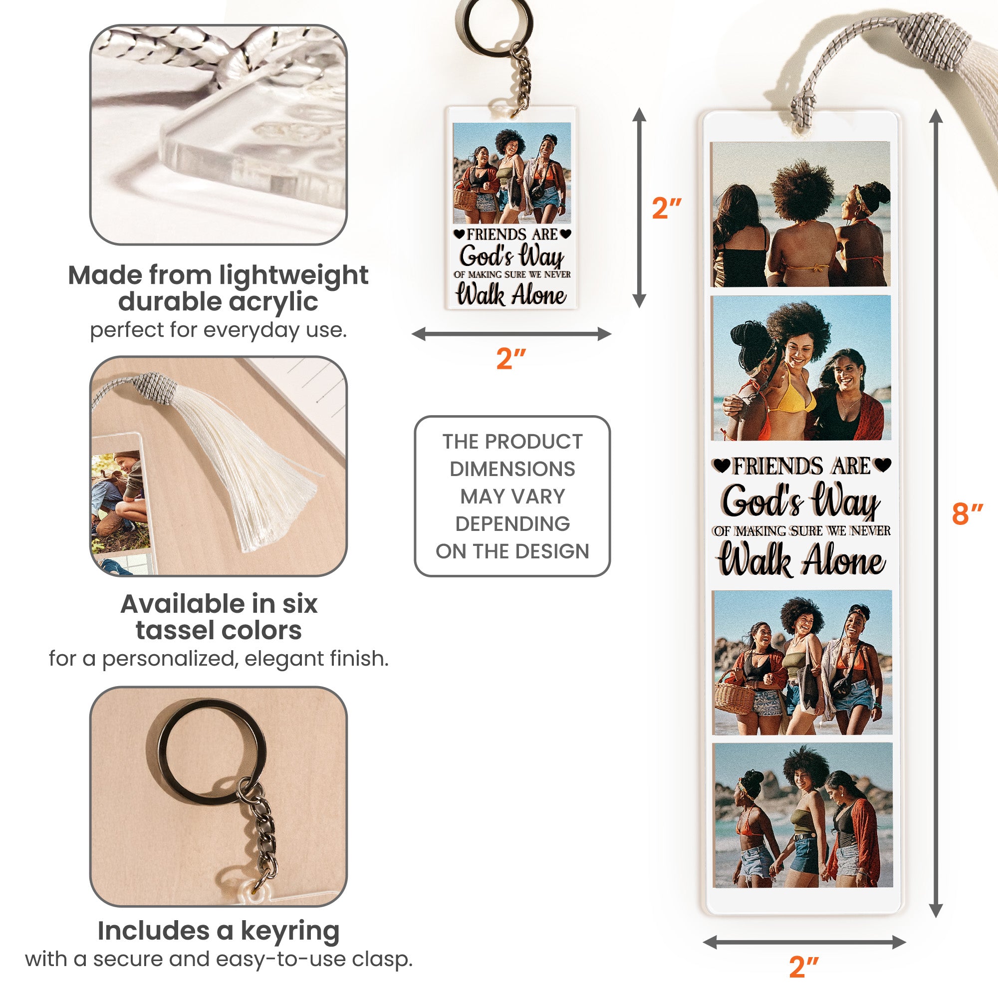Presenting our one-of-a-kind Acrylic Bookmark And Keychain Set, named 'A Friend Is God's Way'. This set is a phenomenal token of friendship and affection. Each piece can be personalized with a unique photo, transforming it into more than just a simple accessory, but a beautiful walking memory. For those who value sentiment and friendship, it's an ideal gift, perfect for birthdays, Christmas, anniversaries, or any occasion. It speaks eloquently without words of the true gift of friendship and the assurance of never walking alone.