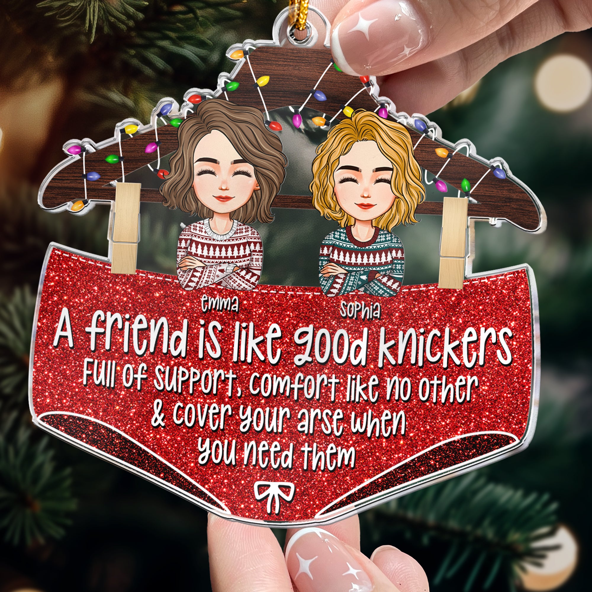 Bring humor and heart to your holiday season with the "A Friend Is Like Good Knickers" Personalized Acrylic Ornament! This funny and charming Friend Christmas Ornament is the perfect Best Friend Christmas Gift for her. Whether it's for a close friend, sister, or bestie, this ornament will remind her that a good friend offers support and comfort—just like a good bra or underwear! Ideal for Christmas Gifts for Best Friends, Birthday Gifts, or as a fun Christmas Ornament for your sister, this personalized ornament is sure to bring laughter and joy to your holiday celebrations!