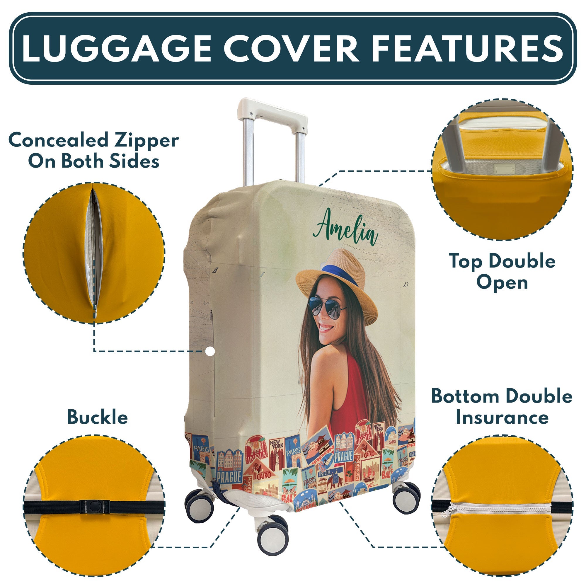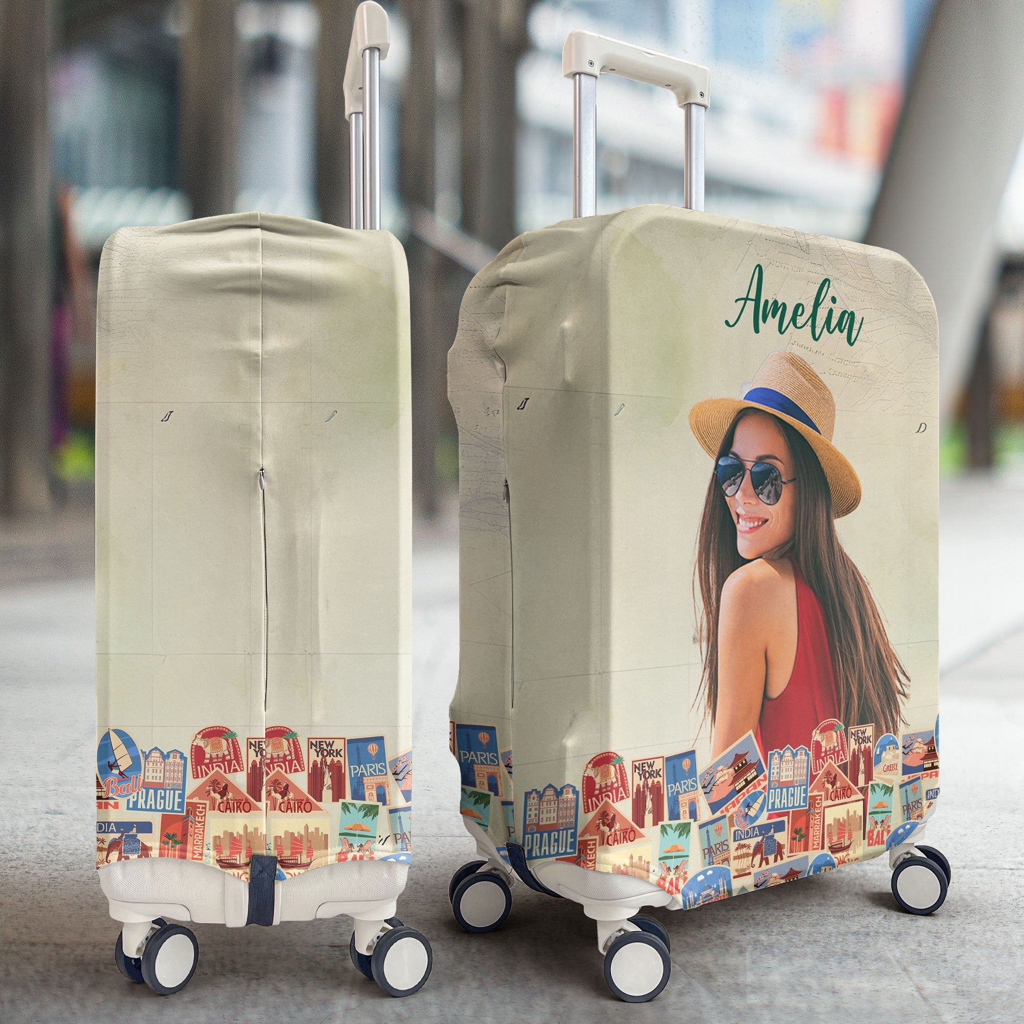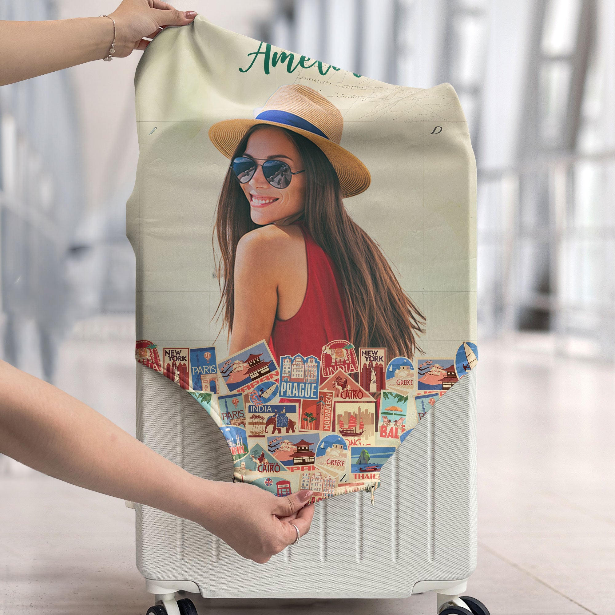 Add some humor and personality to your travels with our Personalized Luggage Cover. Perfect for the girl who really loves traveling around a lot, this cover features a fun story that sums up your wanderlust in the most charming way. You can customize it with your photo, making it a unique and personal accessory for every adventure. Ideal for friends and besties, it’s a great funny gift for birthdays or any special occasion. Whether you're gearing up for a vacation, road trip, or summer getaway, this matching luggage cover not only protects your luggage but also stands out at the baggage claim. Travel in style and let everyone know that your journey is just beginning with this delightful and practical cover.