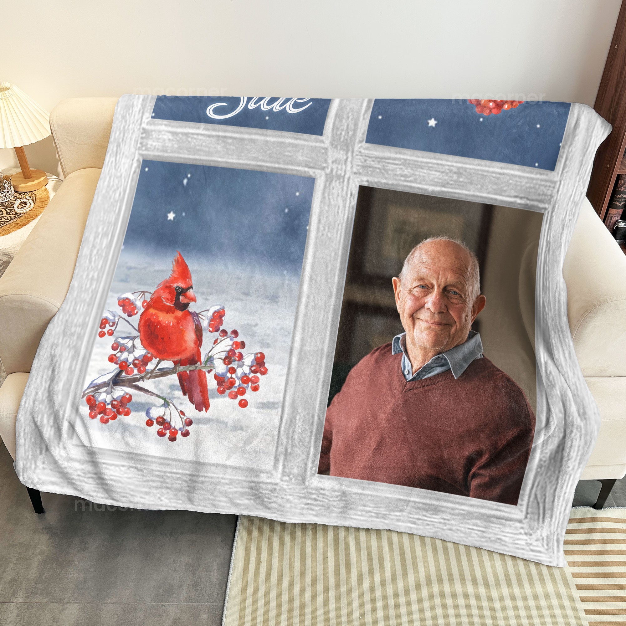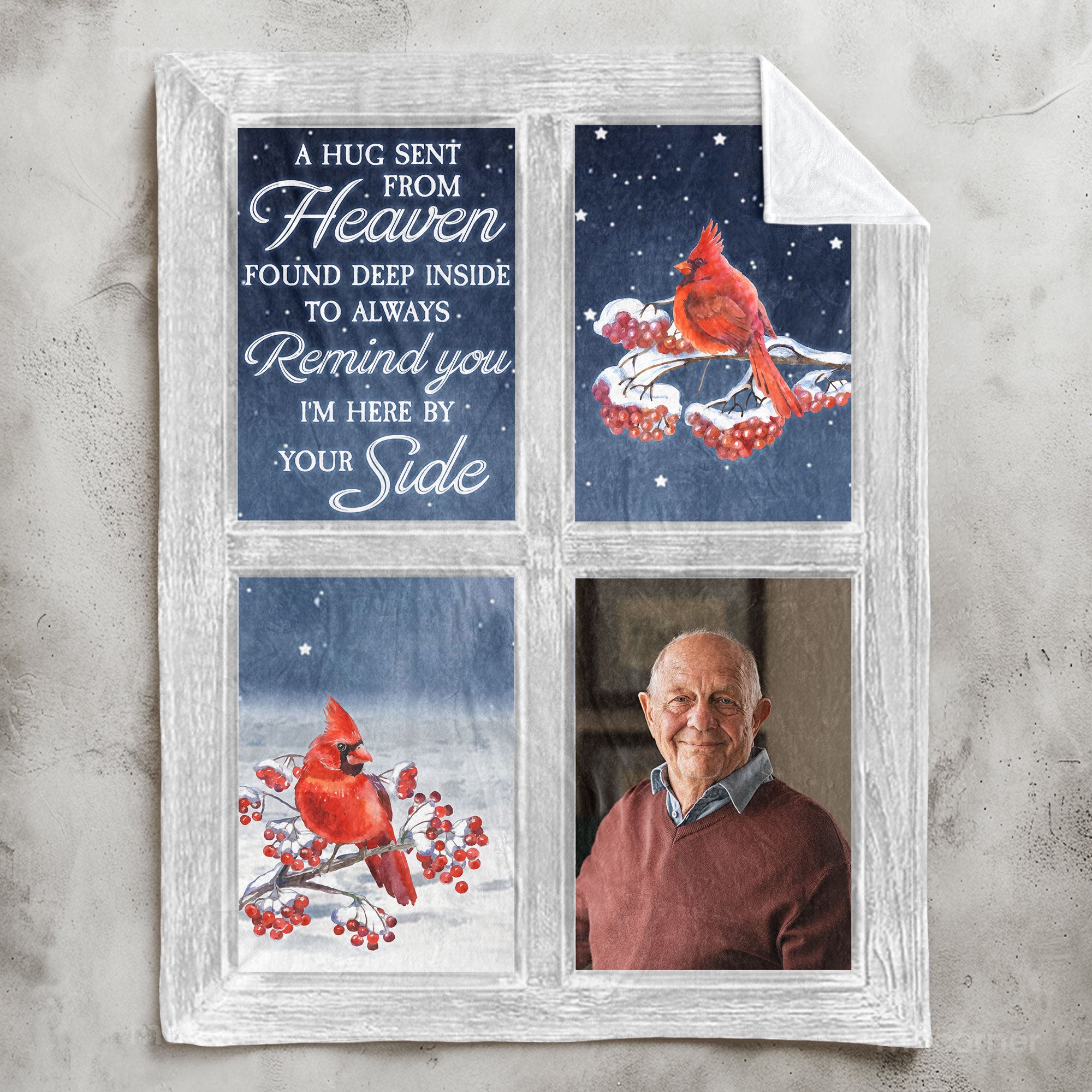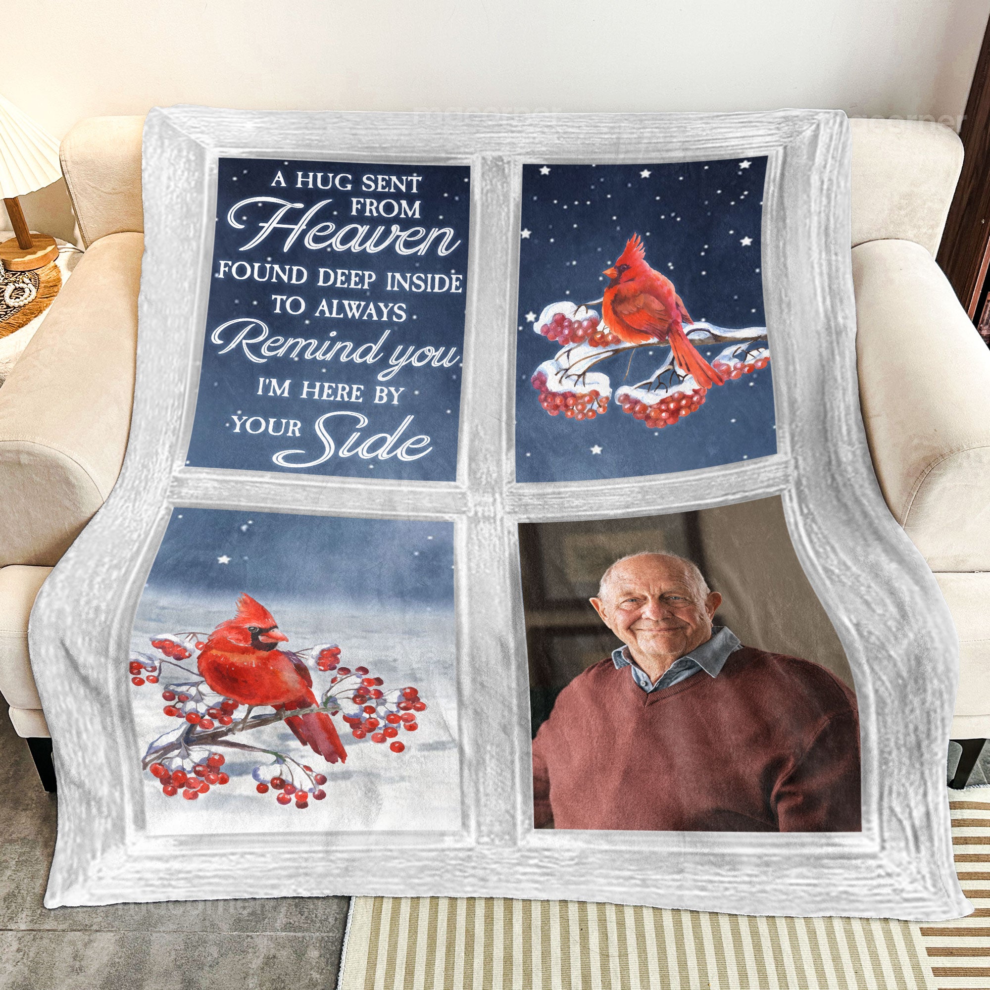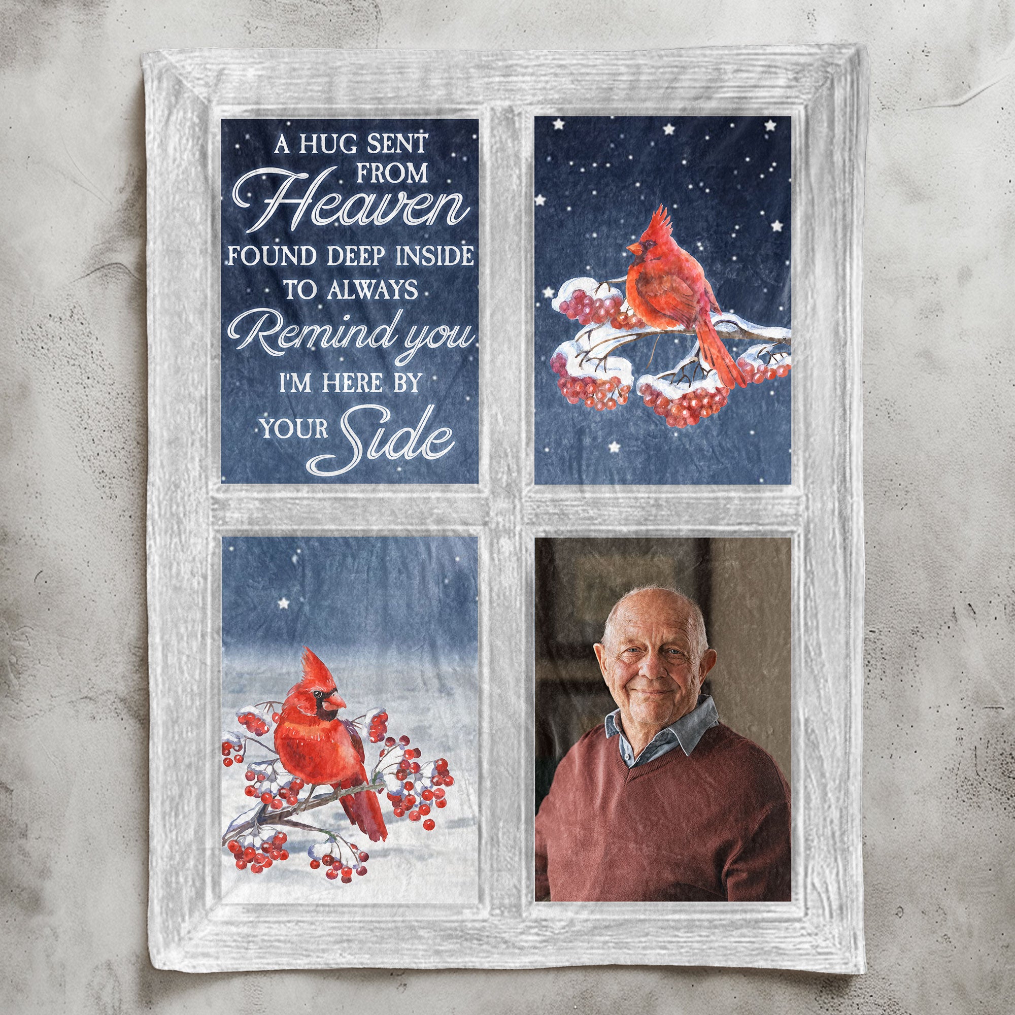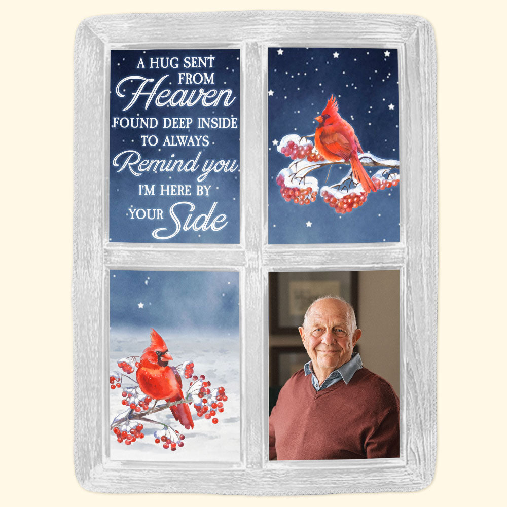 Wrap your loved ones in warmth and cherished memories with our Personalized Photo Blanket featuring a beautiful cardinal window design. This heartfelt memorial keepsake is perfect for family members who have lost a loved one, offering comfort during difficult times.