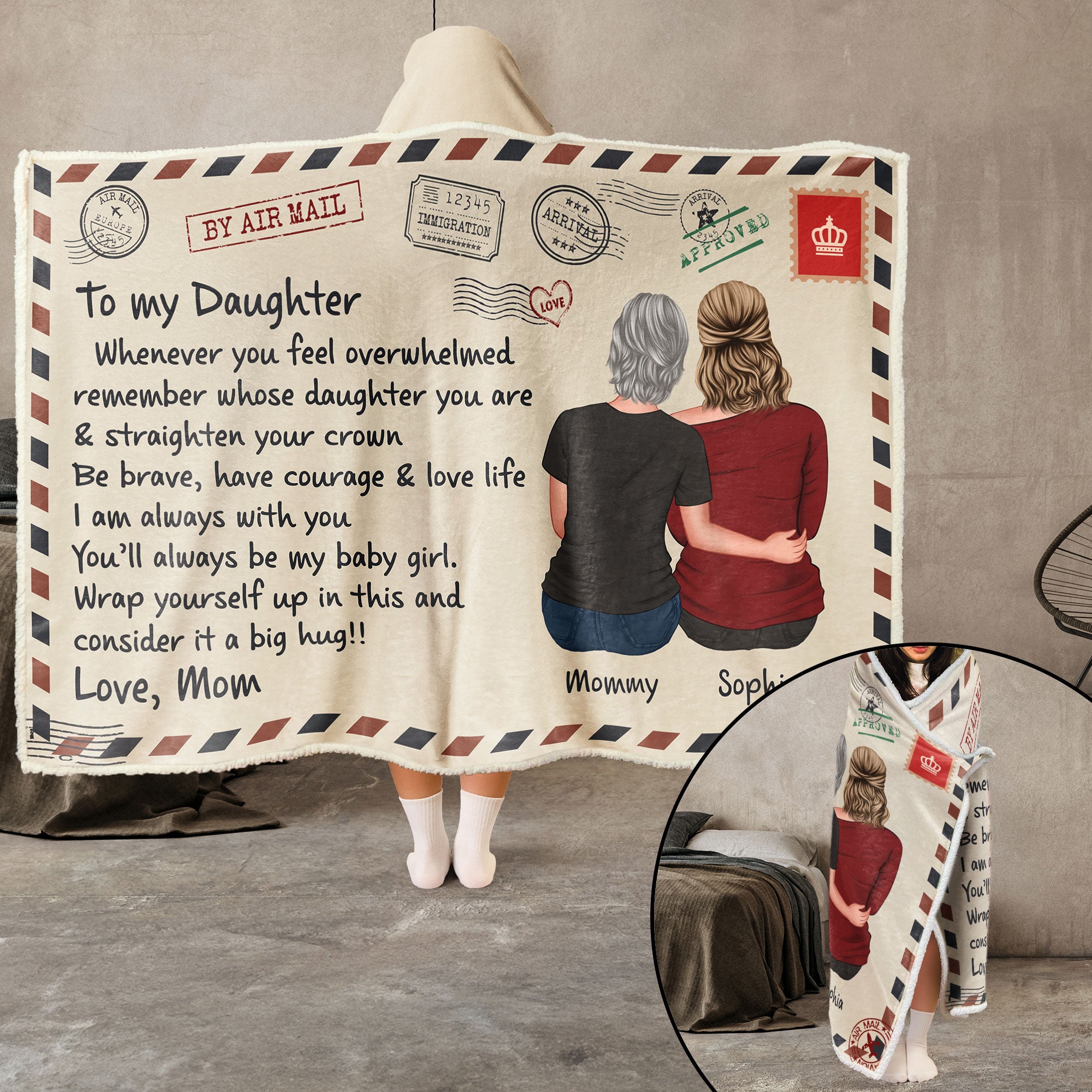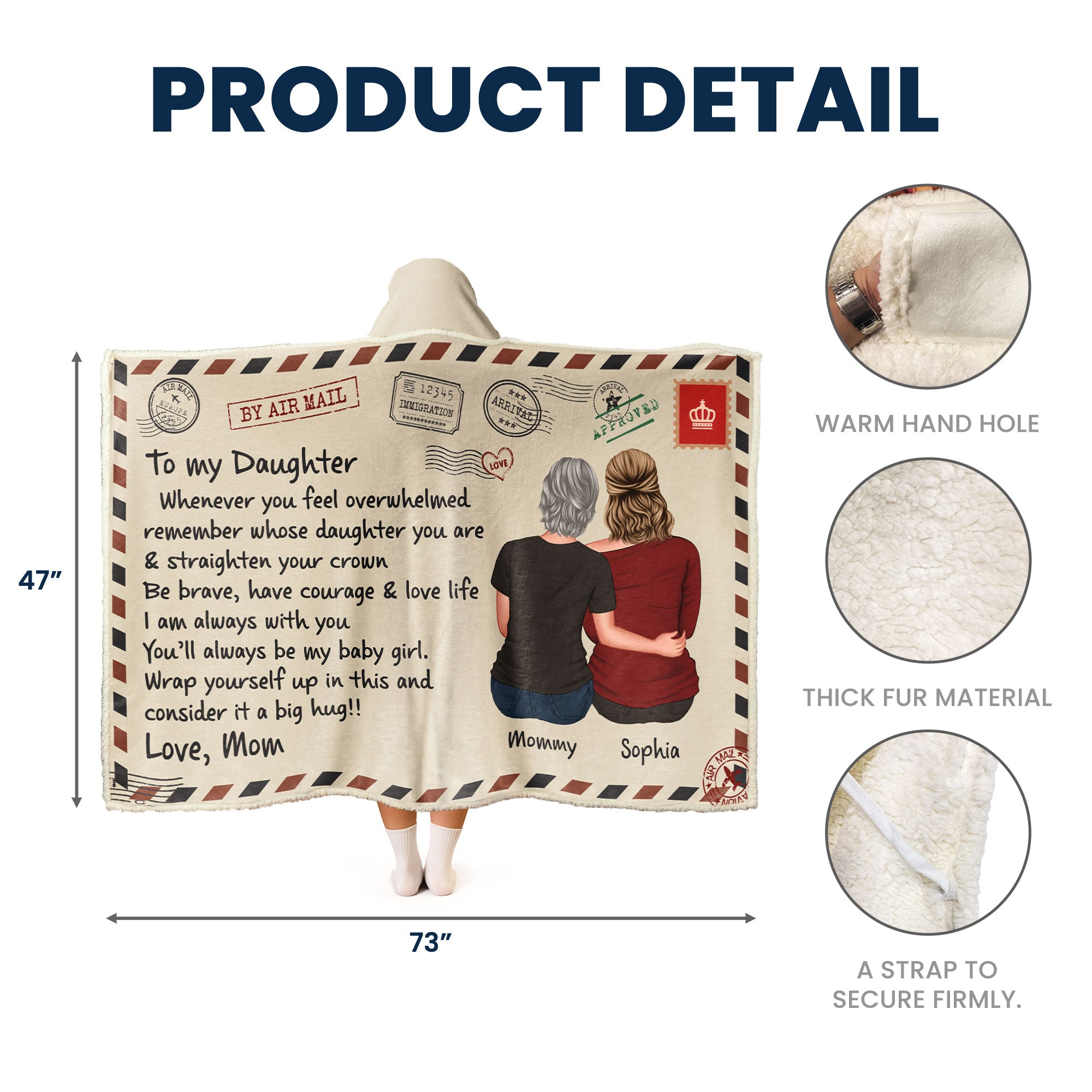 Wrap your daughter in love and warmth with this beautifully designed Wearable Hooded Blanket. Featuring a heartfelt message from Mom, this blanket is the perfect gift to remind her of your unconditional love, even when you're far apart. The cozy, soft fabric offers comfort and a sense of security, while the attached hood adds an extra layer of warmth.
