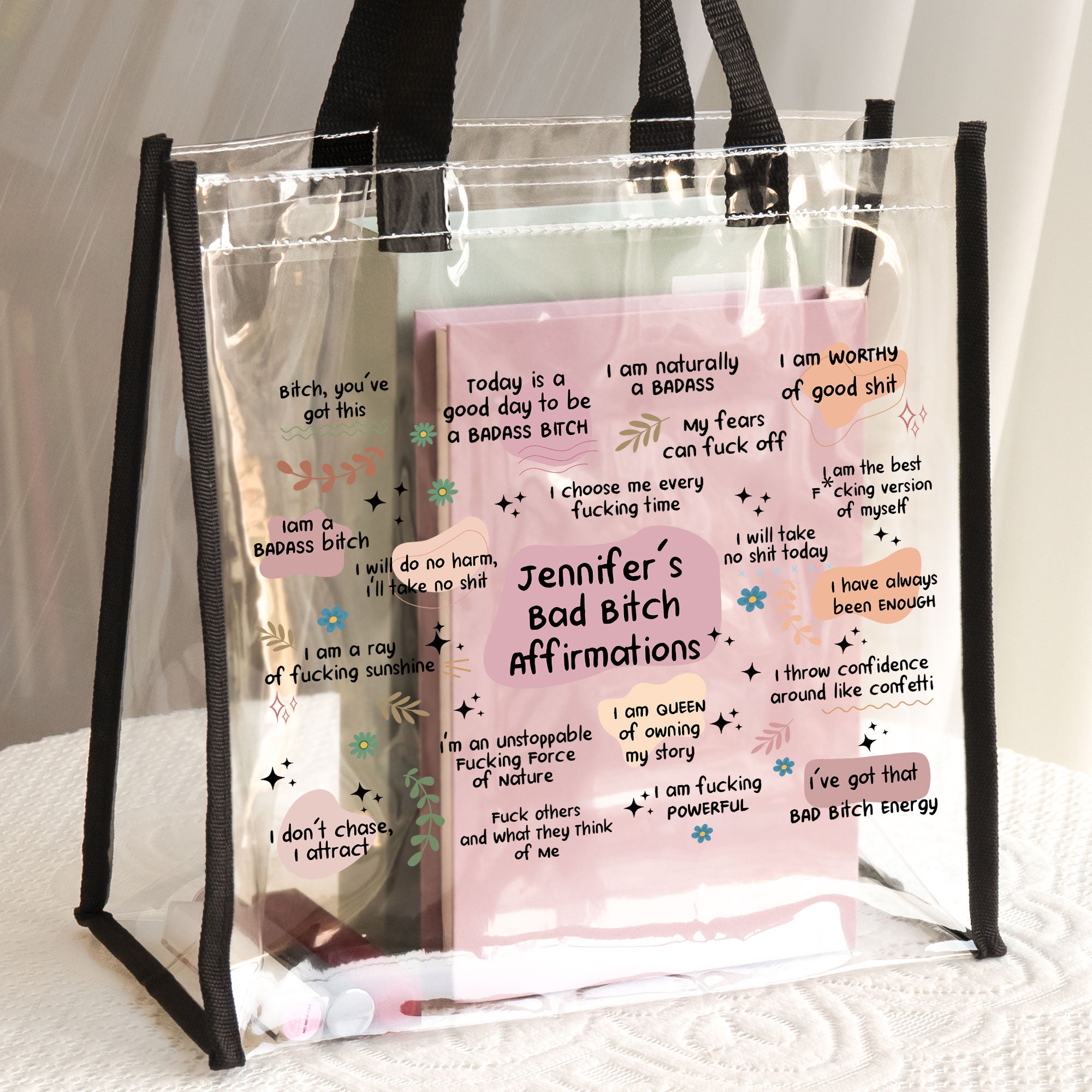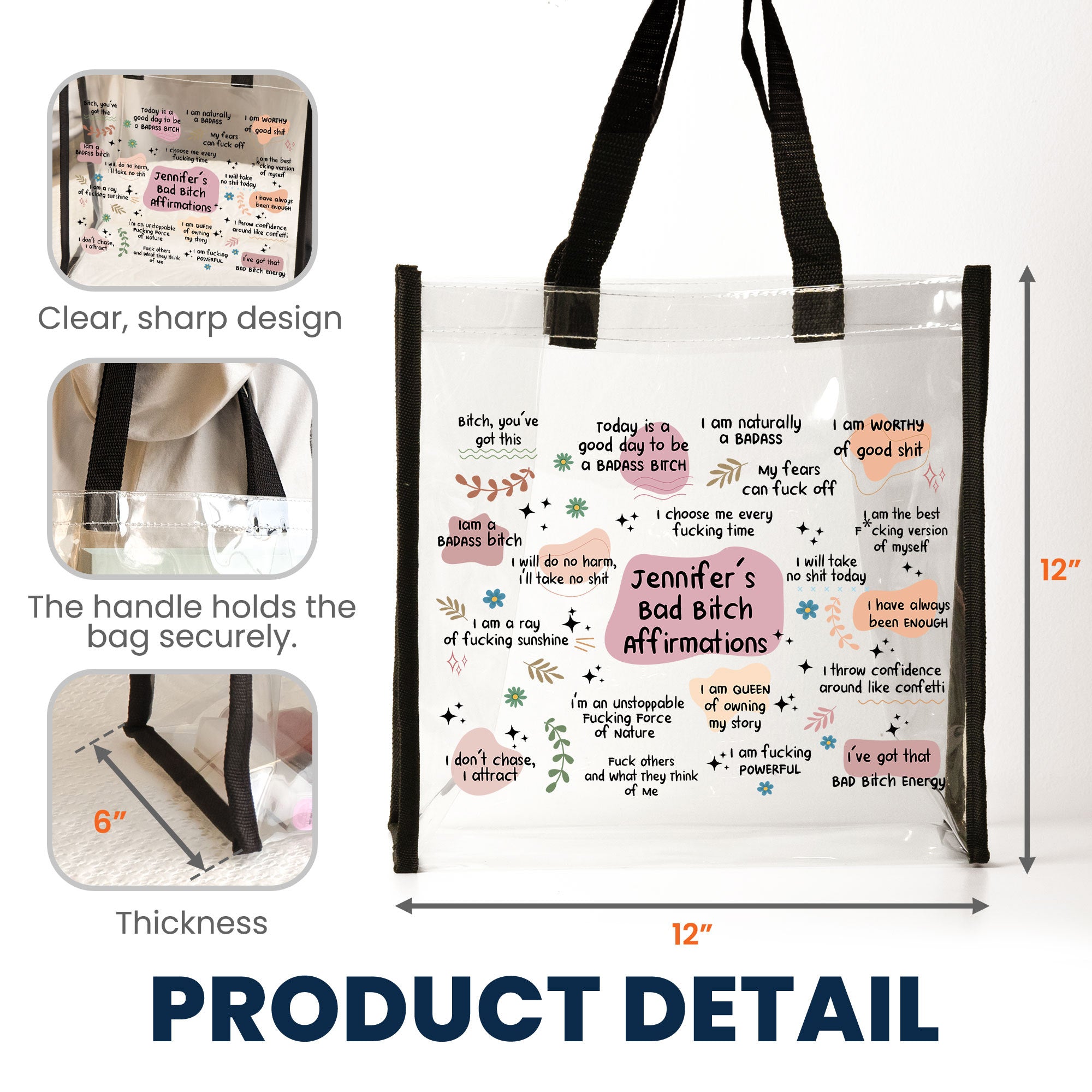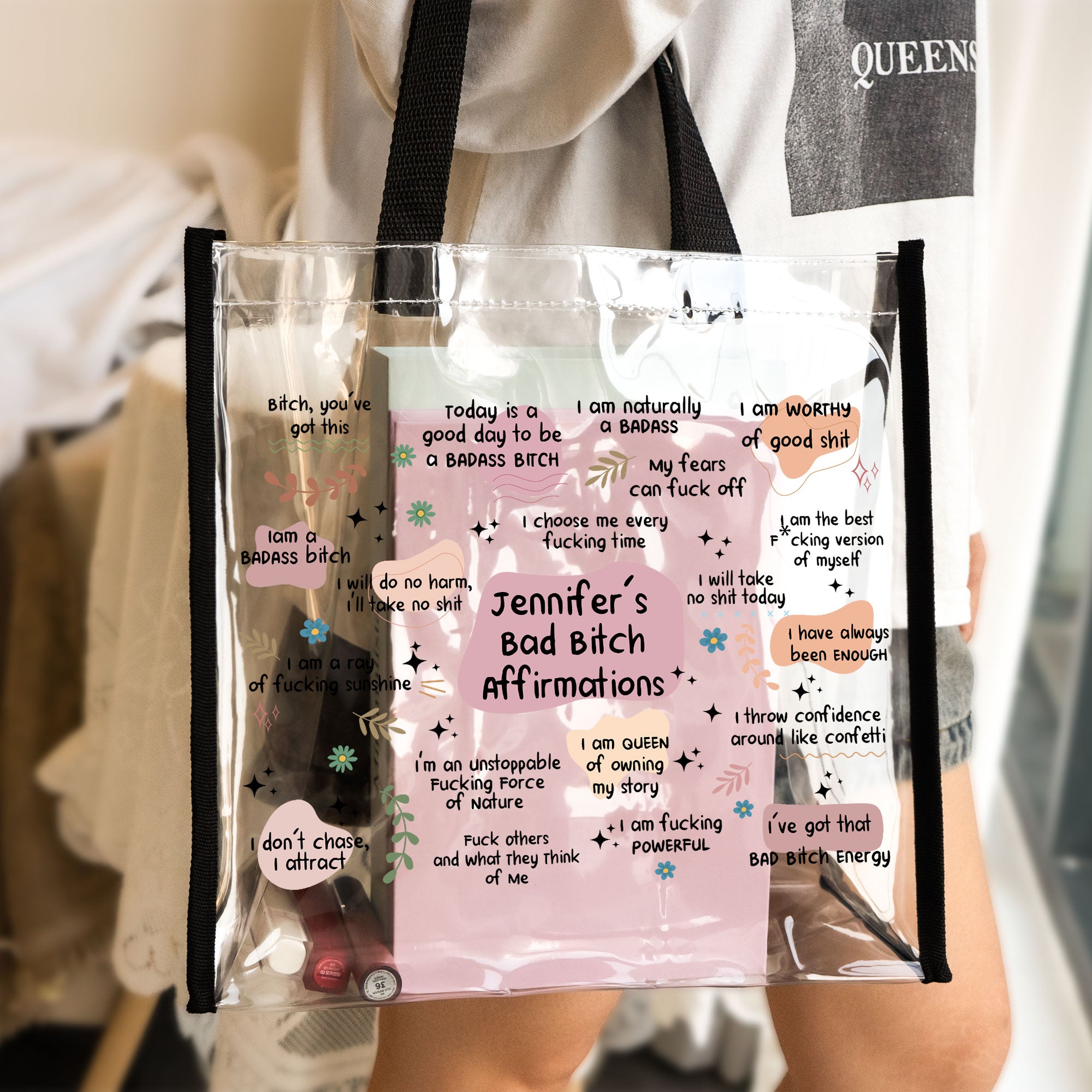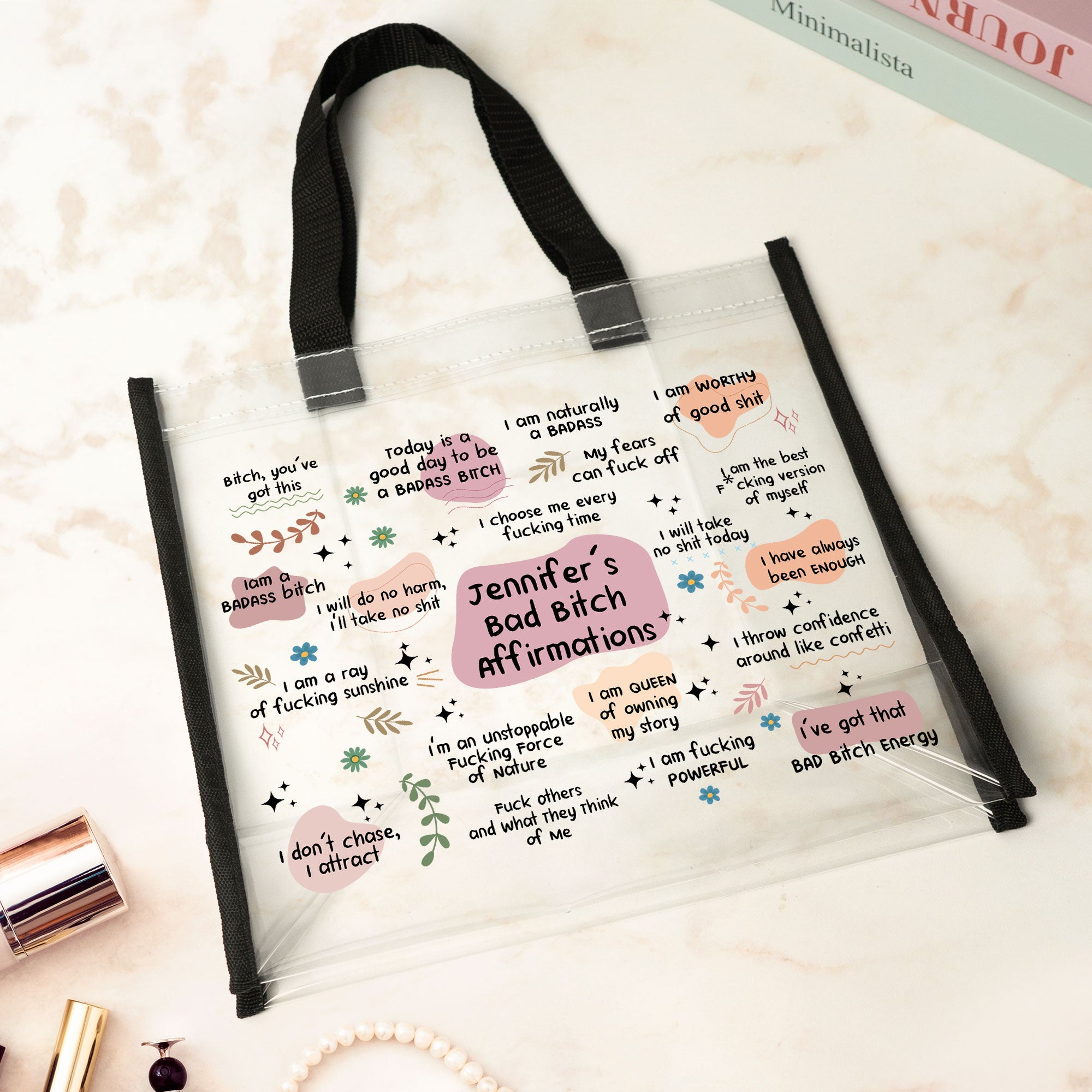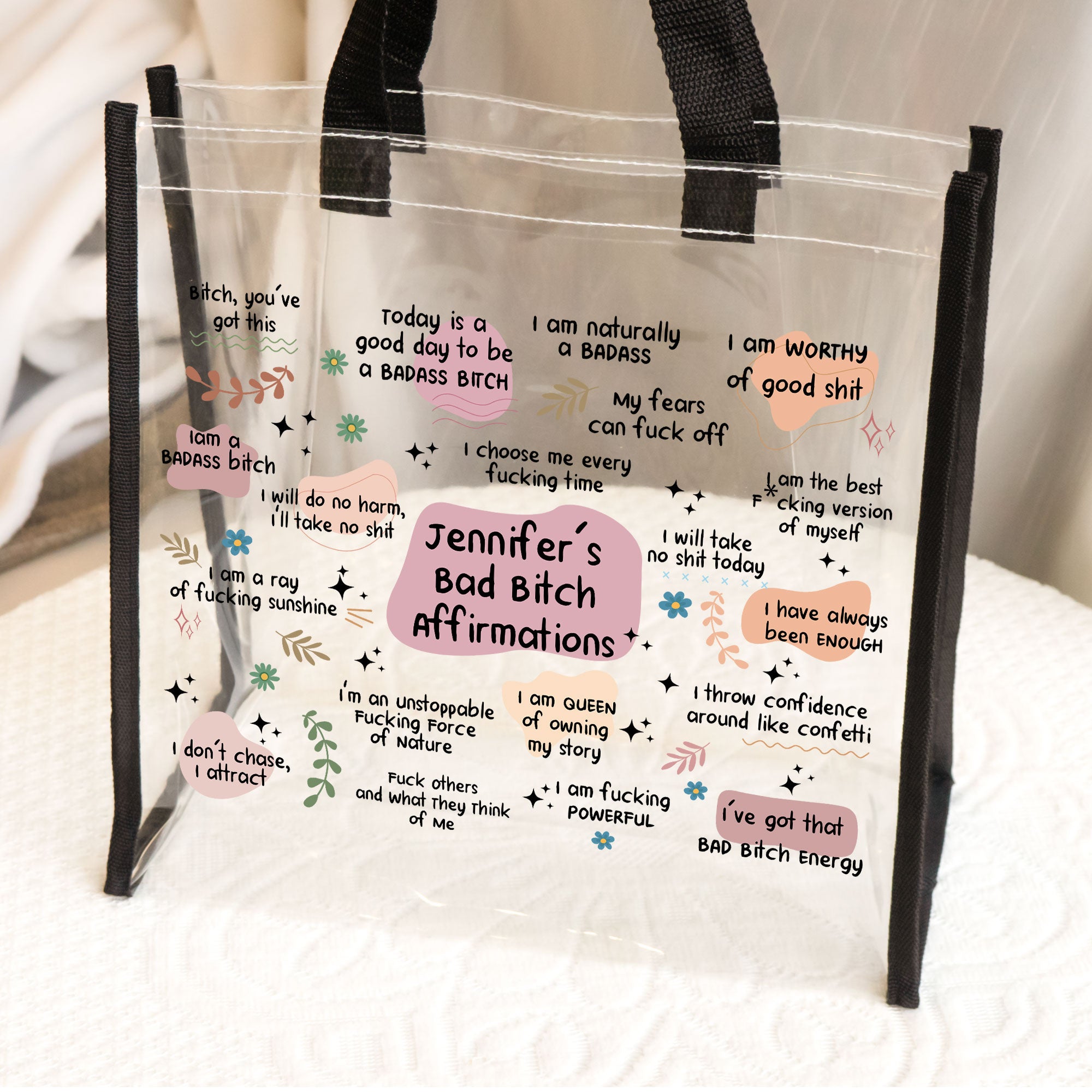 Boost confidence and make a statement with the Bad B*tch Affirmations Custom Clear Tote Bag! Perfect for coworkers, friends, or yourself, this funny and stylish tote is adorned with sassy affirmations to brighten any day. Ideal for work, the gym, or errands, it’s a versatile and unique gift for bold, fearless personalities. Great for Christmas, birthdays, or just because – this tote is both functional and full of attitude!
