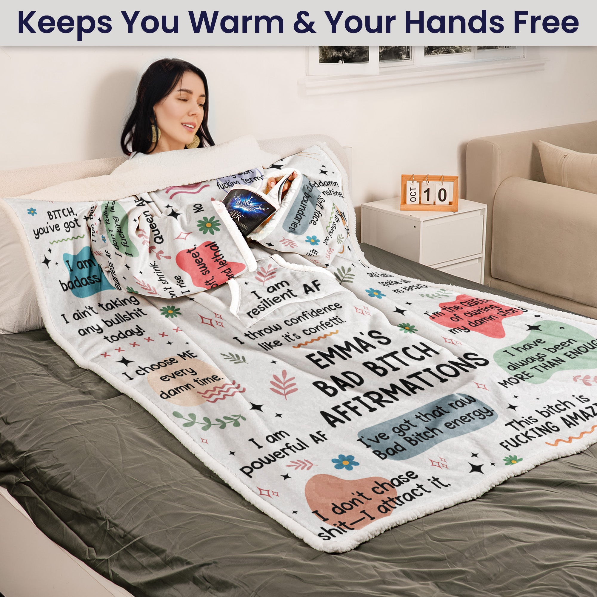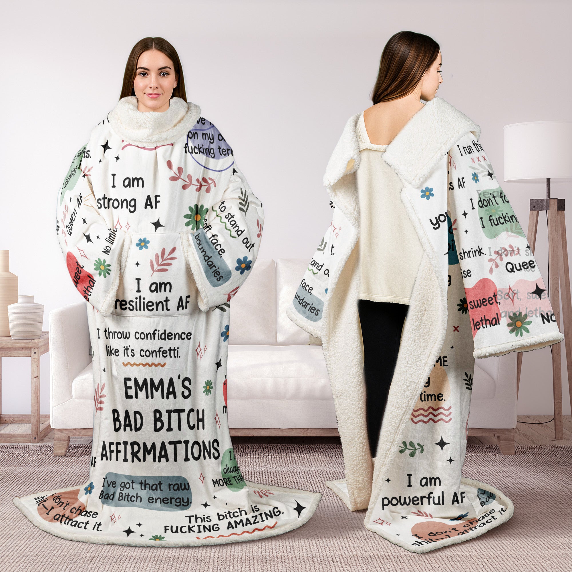Meet our Bad B!tch Affirmations Wearable Blanket with Sleeves - an ideal representation of power and confidence, perfect for self-gifting or for your loved ones who embrace their inner strength. It is great for Christmas, birthdays, anniversaries, or any occasion that calls for a distinctive and empowering gift. The blanket carries an undertone of affirmation, amplifying one's self-belief and individuality while offering ultimate comfort and warmth.