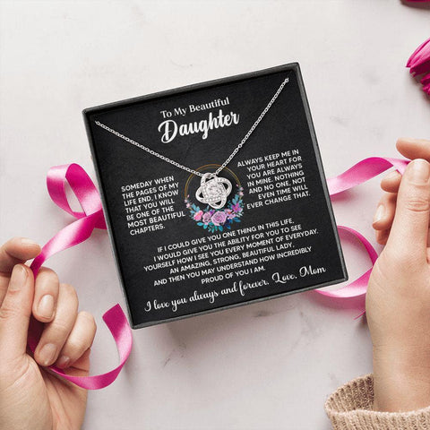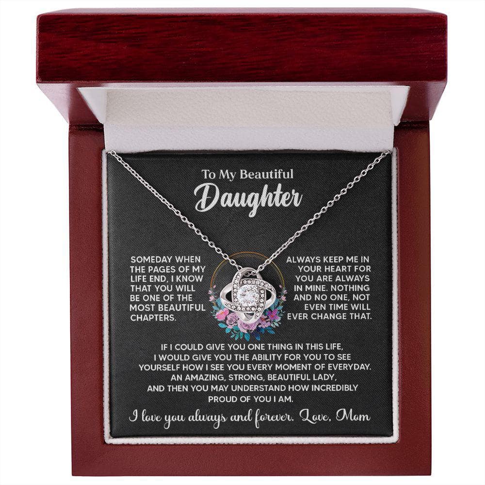 TO MY BEAUTIFUL DAUGHTER, SOMEDAY WHEN THE PAGES OF MY LIFE END, I KNOW THAT YOU WILL BE ONE OF THE MOST BEAUTIFUL CHAPTERS. ALWAYS KEEP ME IN YOUR HEART FOR YOU ARE ALWAYS IN MINE. NOTHING AND NO ONE, NOT EVEN TIME WILL EVER CHANGE THAT. IF I COULD GIVE YOU ONE THING IN THIS LIFE, I WOULD GIVE YOU THE ABILITY FOR YOU TO SEE YOURSELF HOW I SEE YOU EVERY MOMENT OF EVERY DAY. AN AMAZING, STRONG, BEAUTIFUL LADY, AND THEN YOU MAY UNDERSTAND HOW INCREDIBLY PROUD OF YOU I AM. I LOVE YOU ALWAYS AND FOREVER, LOVE MOM