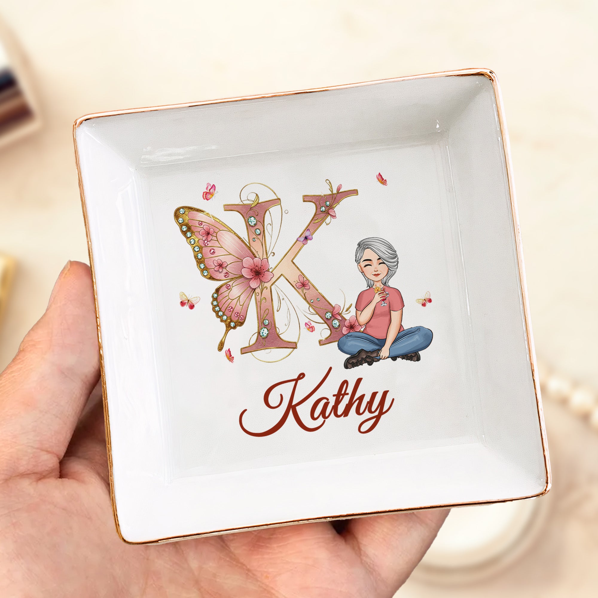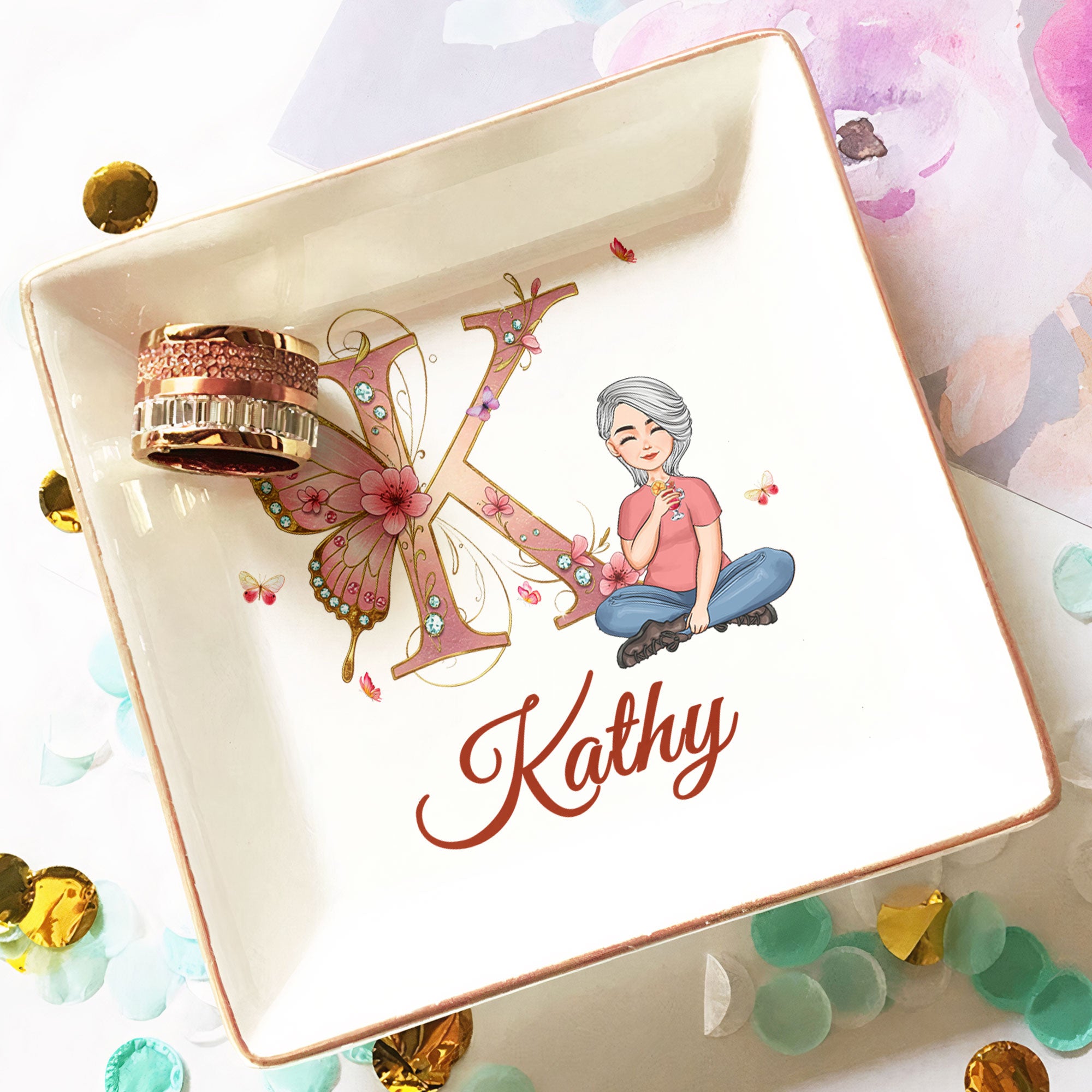 This custom jewelry dish features a beautifully designed monogrammed letter adorned with delicate pink butterflies and sparkling accents. Below the letter, the name is elegantly written in a stylish, flowing font. The design also includes a charming, hand-drawn cartoon character sitting gracefully, adding a personal touch that makes this item truly unique.