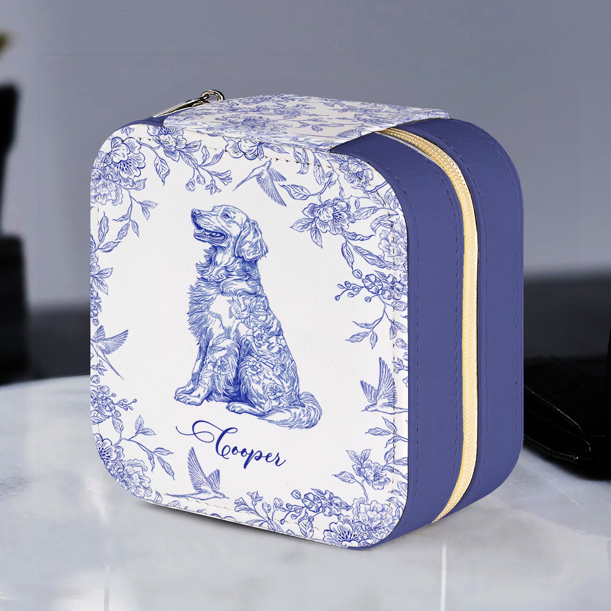 Introducing our Floral Dog Custom Breeds Toile De Jouy Style Chinoiserie - a personalized Jewelry Box that is perfect for dog and pet lovers. This unique jewelry box is an excellent way to honor and celebrate your love for your furry friend. It makes a fantastic present for birthdays, Christmas, anniversaries, or any occasion where a special, thoughtful gift is needed.