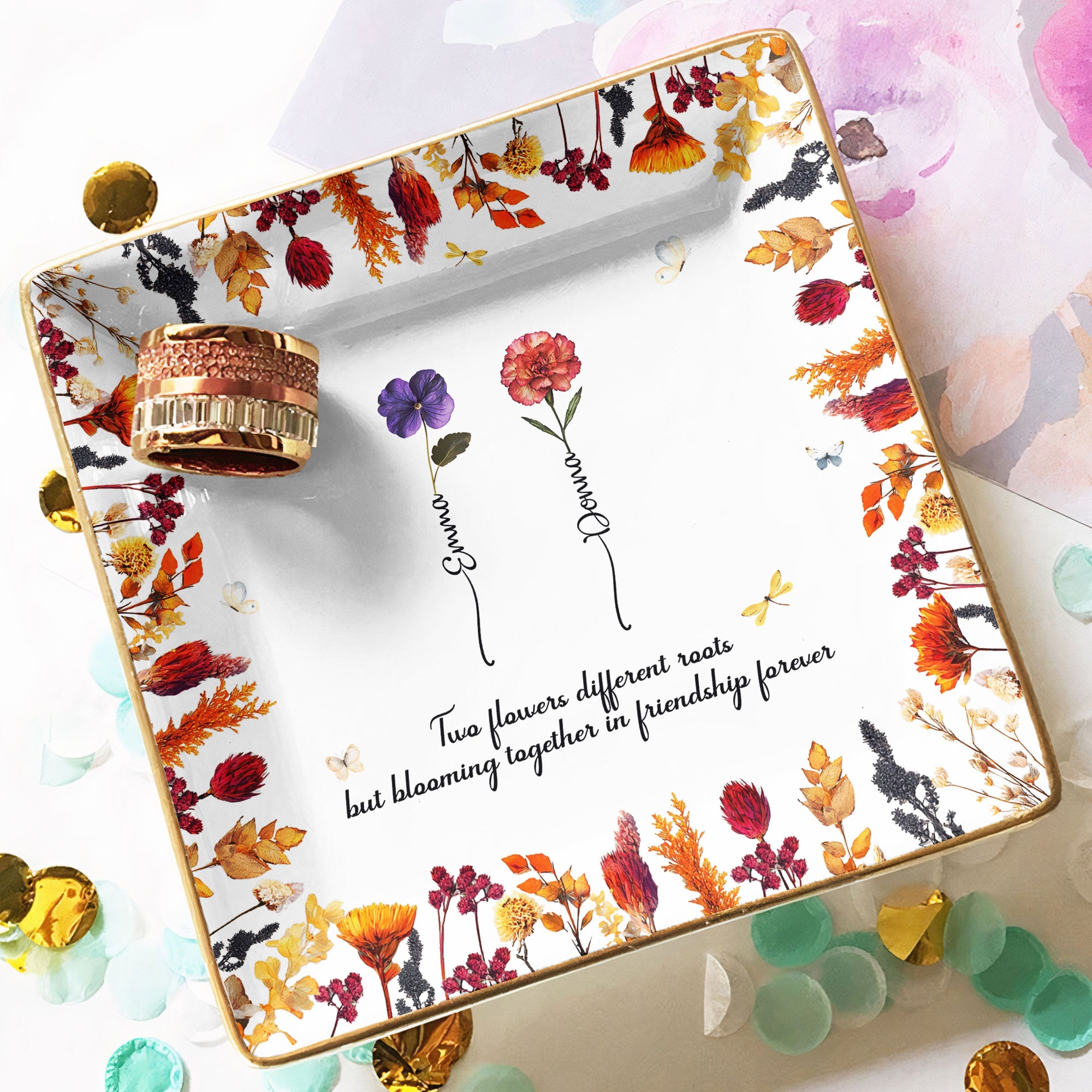The Square Jewelry Dish serves as a kinship token that holds your friend's precious pieces, serving as a daily reminder of your friendship. It's perfect for birthdays, Christmas, and anniversaries, or for any occasion where words fall short to express the depth of your bond. By marrying aesthetics with utility, this dish succinctly communicates the message of flowers blooming together in friendship forever, without digressing into redundancies. Don't miss out on the opportunity to gift this unique symbol of your bond, because friendships are as rare as the flowers that bloom together, and equally beautiful.