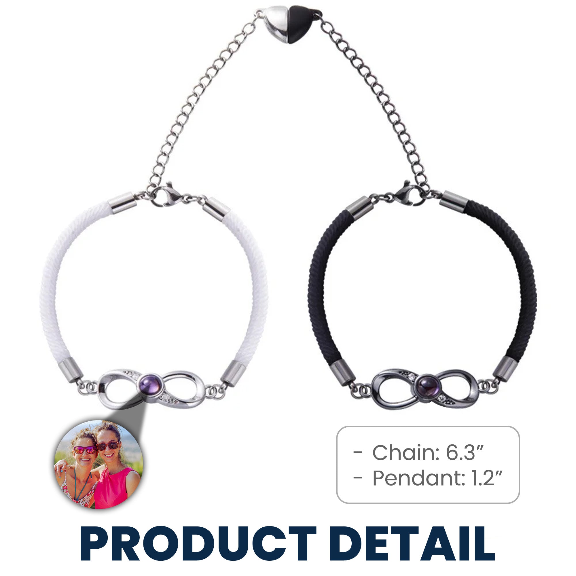 This set includes two customizable bracelets designed to hold and project photos of your choice. Each bracelet features half of a magnetic heart pendant, which combines into a full heart when brought together, symbolizing love and connection. -