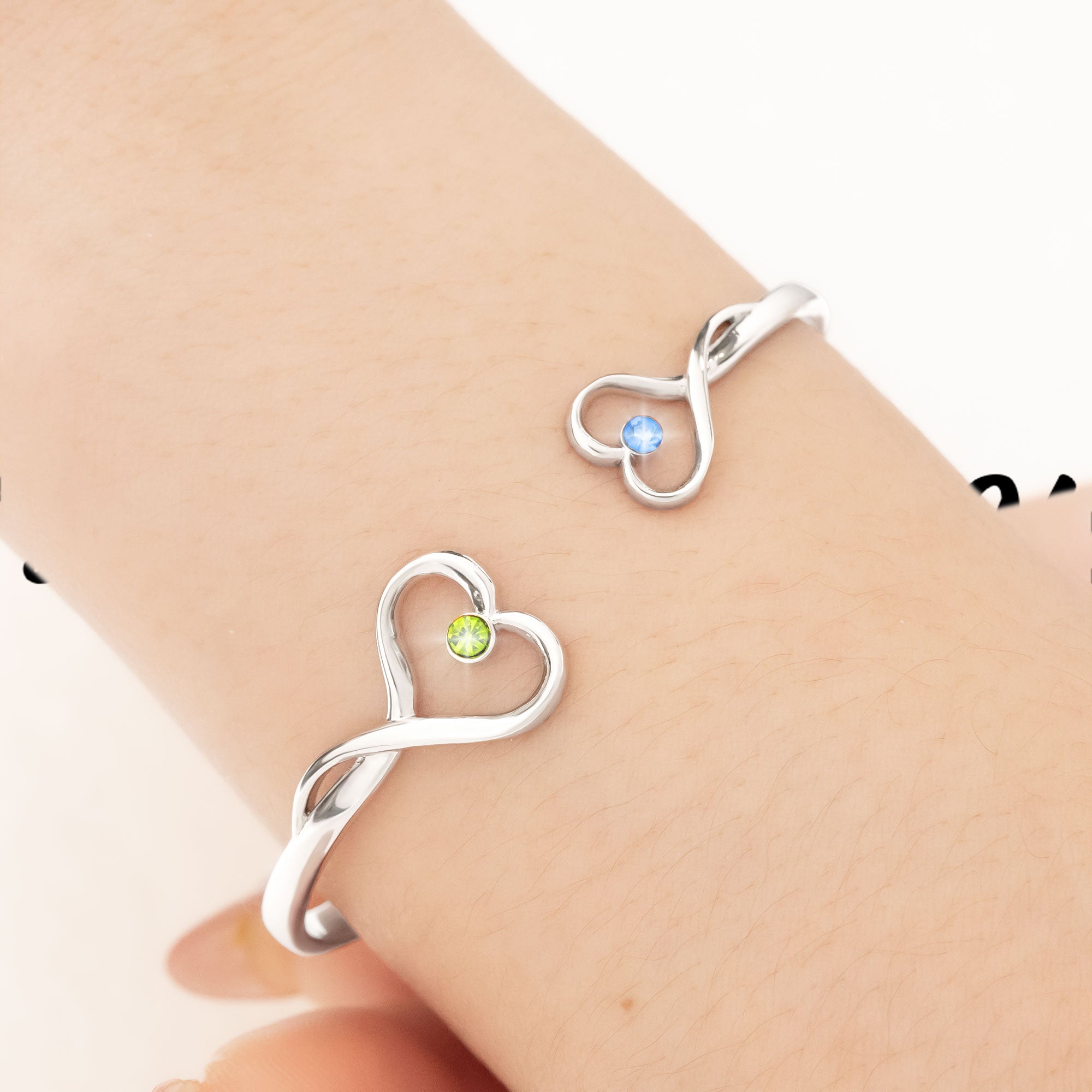 + Features two heart-shaped accents, each adorned with a sparkling birthstone of your choice.