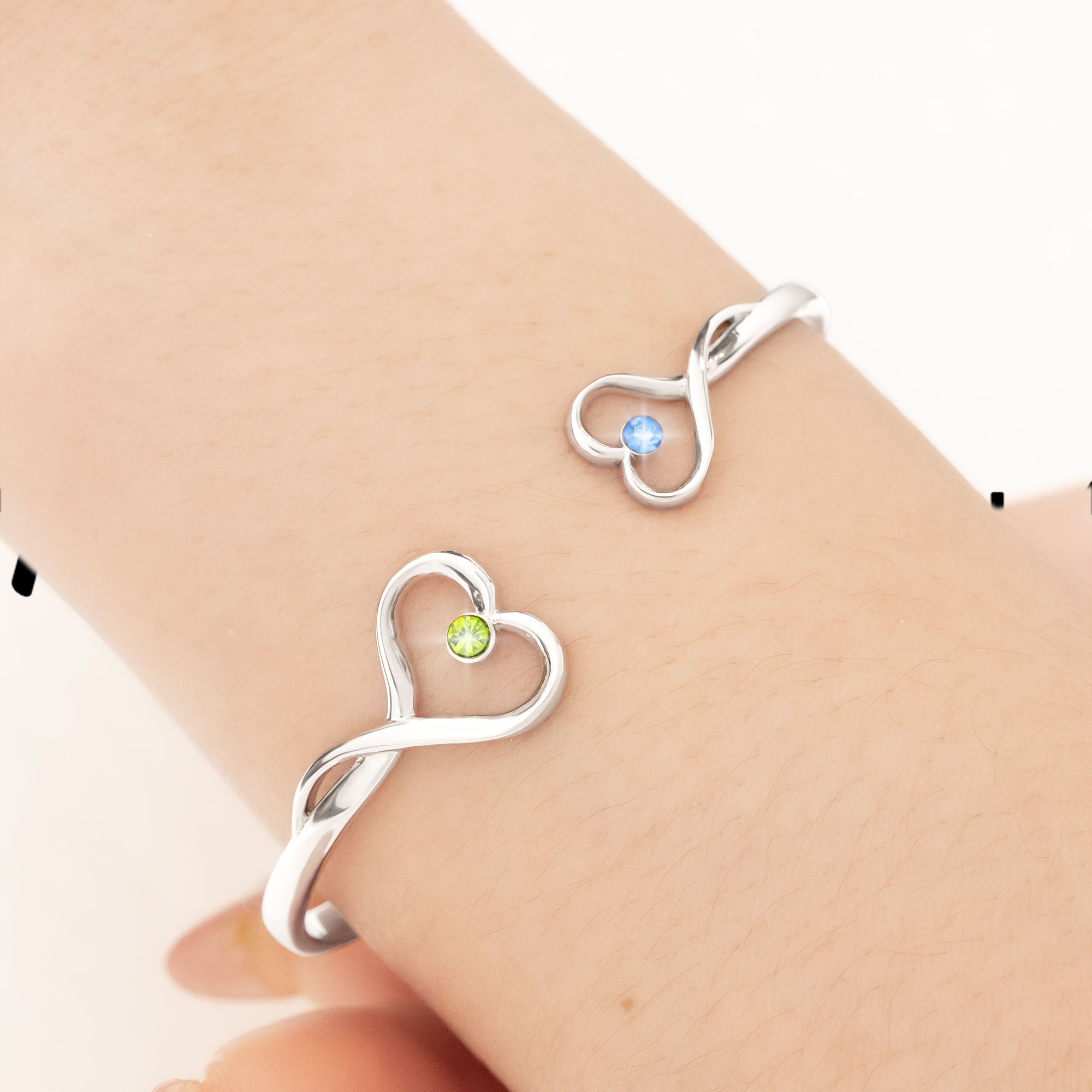 + Features two heart-shaped accents, each adorned with a sparkling birthstone of your choice.