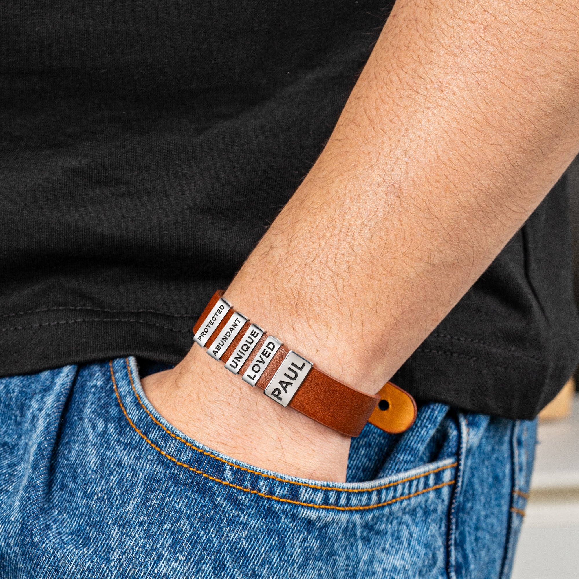 Express faith and identity with our God Say I Am Leather Bracelet. This personalized men's bracelet features engraved name beads, making it a meaningful gift. Crafted from genuine leather, it offers a rugged yet stylish look. Each bead can be customized with names, words, or affirmations, reminding him of his strength and faith. A perfect Christian gift for birthdays, anniversaries, or special occasions. Adjustable for comfort and durability.