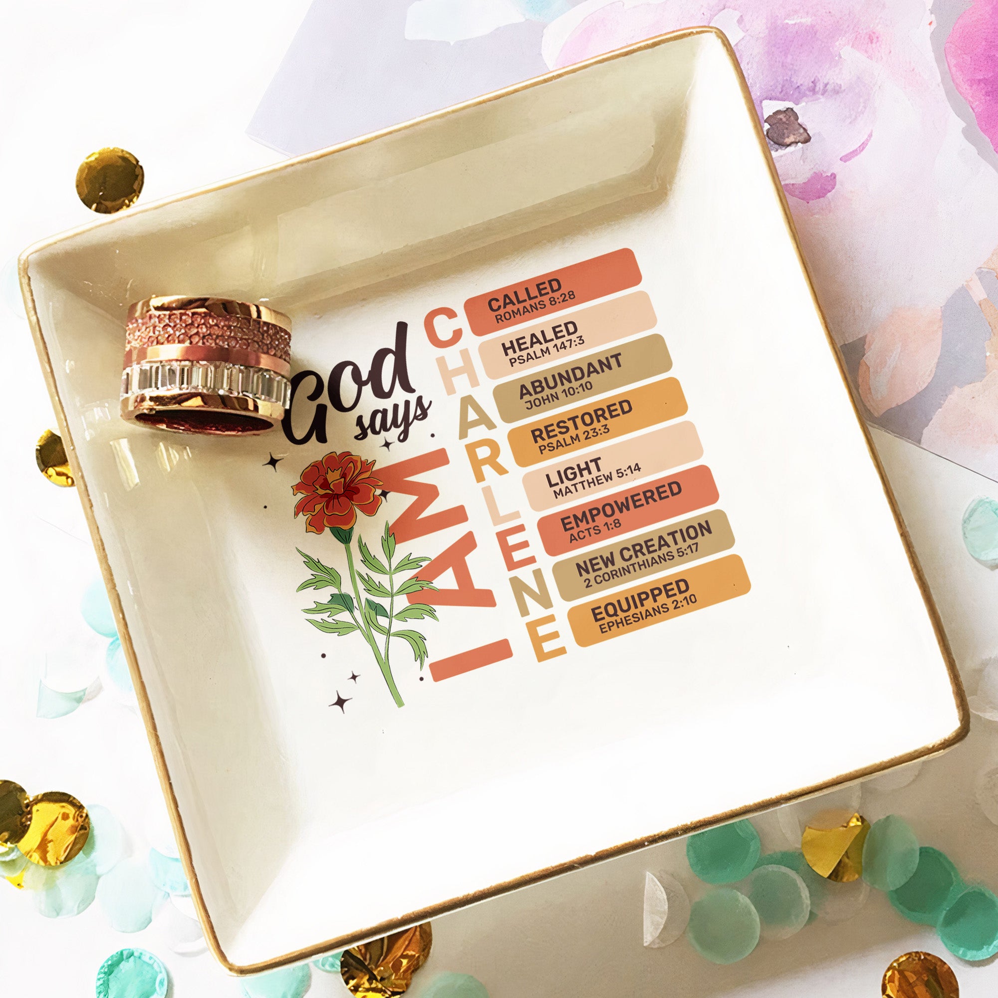 Introducing our God Say I Am With Birth Flower And Bible Verses - Personalized Jewelry Dish. This square jewelry dish makes for the perfect heartfelt gift designed especially for those who hold their Christian faith dear or simply wish to treat themselves. The dish brings a unique blend of faith and beauty into any space, sharing God's message in a way that’s meaningful and stylish. The verse from the Bible quietly whispers reassurance of God’s presence, forming a bond and a reminder of divine love.
