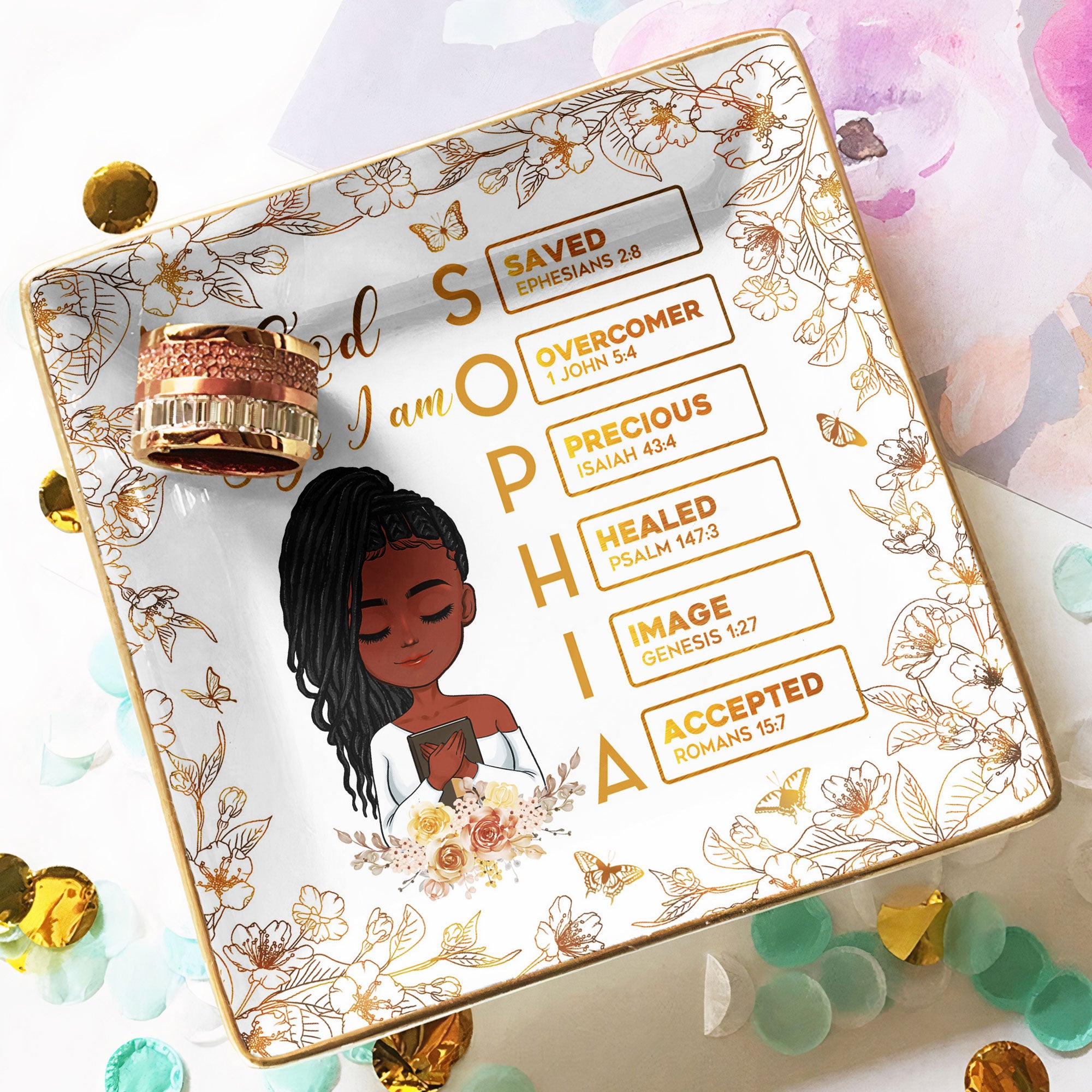 Brighten your day or someone else's with the God Says I Am Name Letter In Bible - Golden Version - Personalized Jewelry Dish. This square jewelry dish is a tangible reminder of faith, making a wonderful self-gift or a meaningful present for any Christian in your life. The shiny gold lettering adds an elegant touch, while the personalization makes it one-of-a-kind. It's more than just a dish - it's a celebration of identity and faith. Perfect for any occasion - birthdays, Christmas, anniversaries, or just because - this item serves a dual purpose as a décor piece and a safe spot for your precious trinkets.