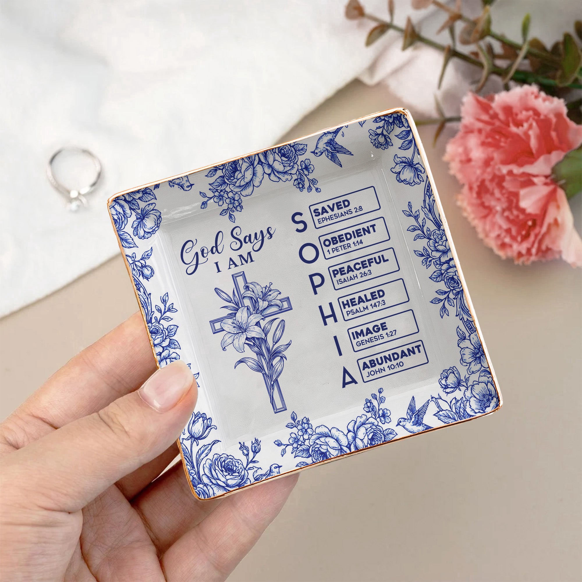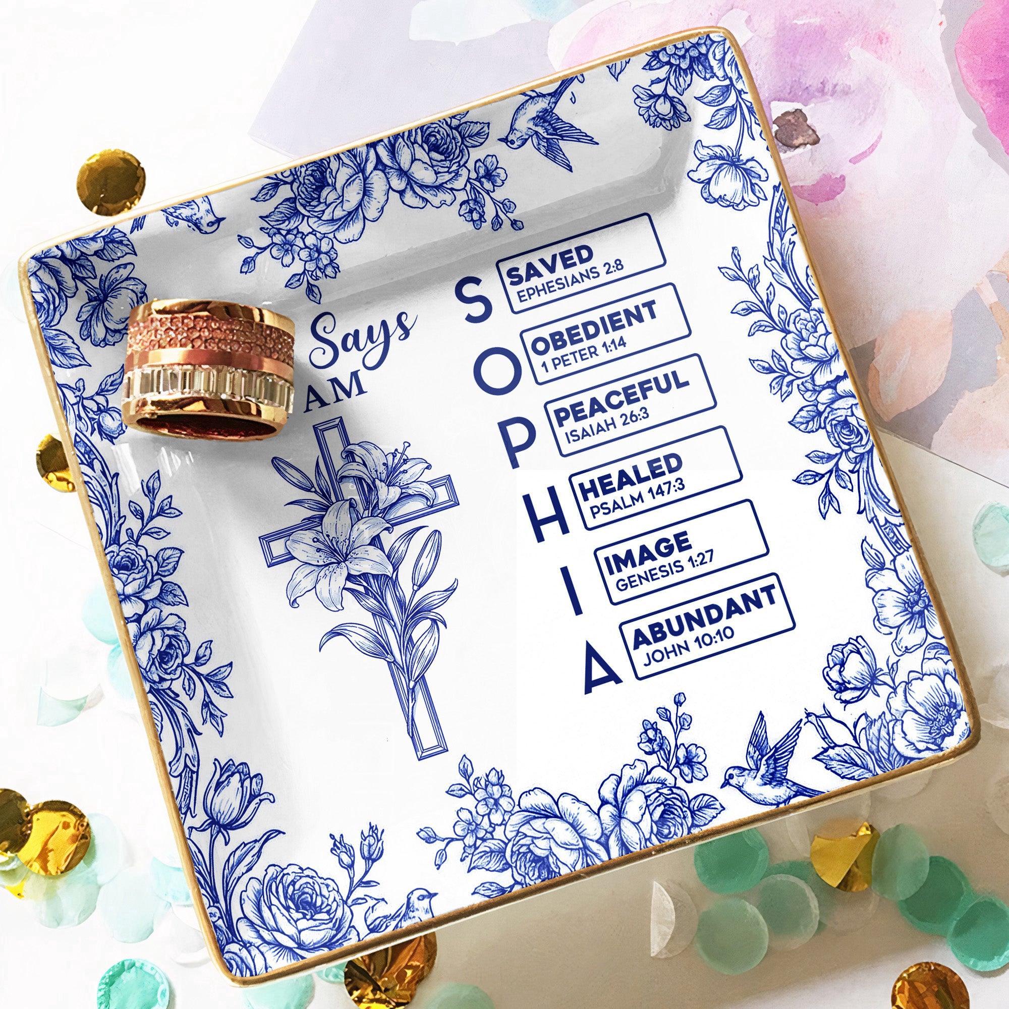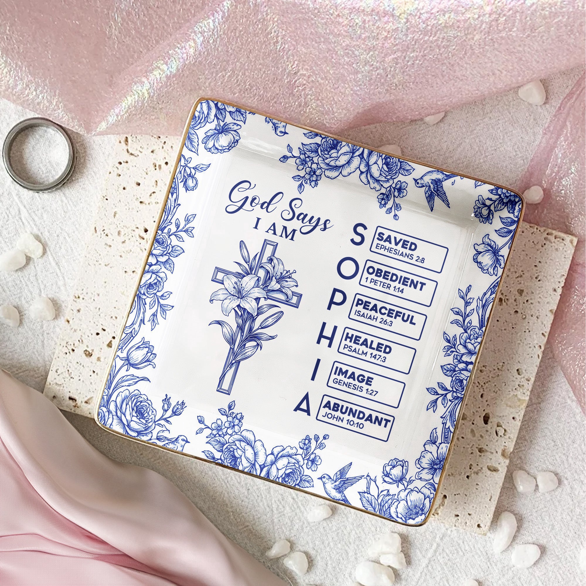 Create an intimate bond with this beautifully designed God Says I Am Name Letter In Bible Toile De Jouy With Faith Symbol - Personalized Jewelry Dish. This unique keepsake is perfect for anyone who holds Christian faith dear to their heart. The intricate toile de Jouy pattern resonates with classic elegance while the personalized feature makes it a perfect memento. It’s not just a jewelry dish, but a piece that symbolizes faith and personal connection. This must-have item is perfect for birthdays, Christmas, anniversaries, or any occasion where you want to express your care and respect.