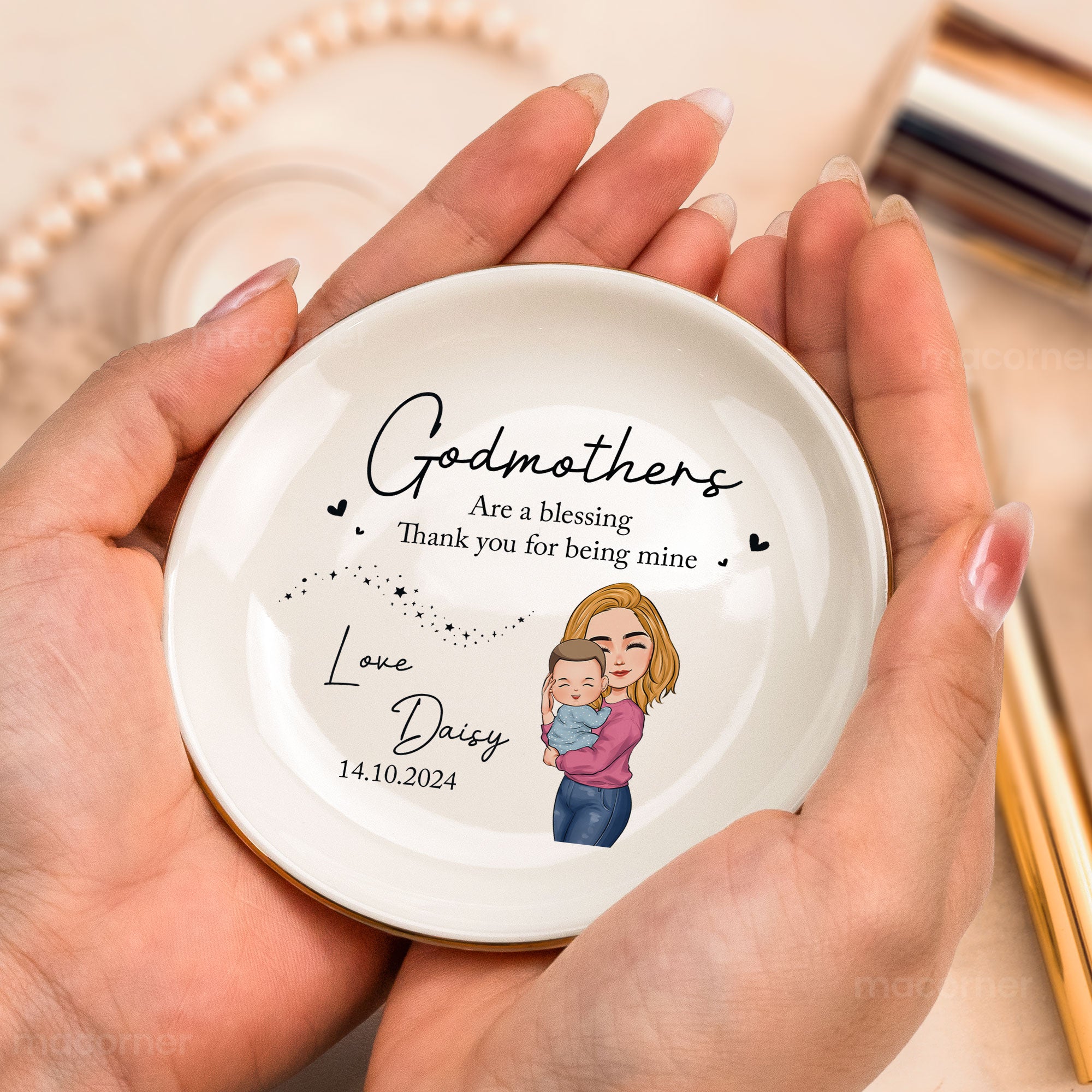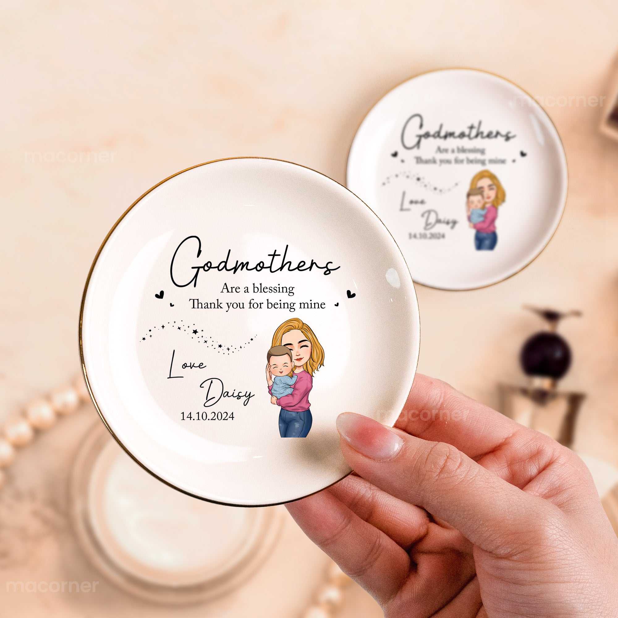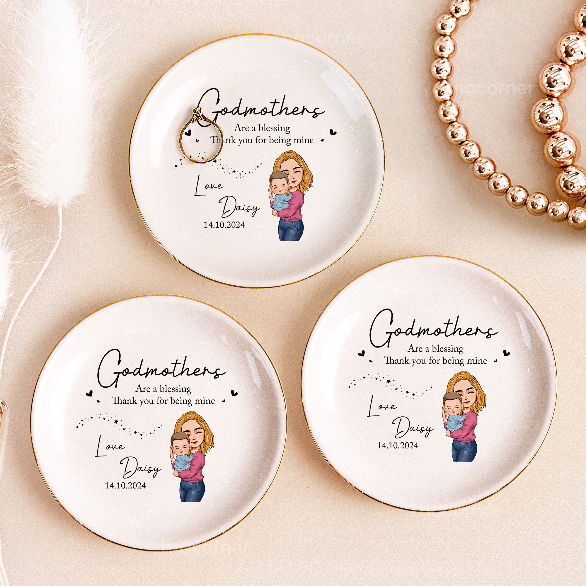 The "Godmothers Are A Blessing Thank You For Being Mine" Personalized Jewelry Dish is a heartfelt baptism gift for the special godmother in your child's life. This meaningful keepsake is designed to celebrate the important role a godmother plays on baptism day and beyond, making it the perfect expression of gratitude and love. It beautifully captures the bond between the godmother and child, serving as a lasting reminder of their spiritual connection. Ideal for Catholic and Christian families, this jewelry dish is a thoughtful and elegant gift to honor the godmother's role in your family.