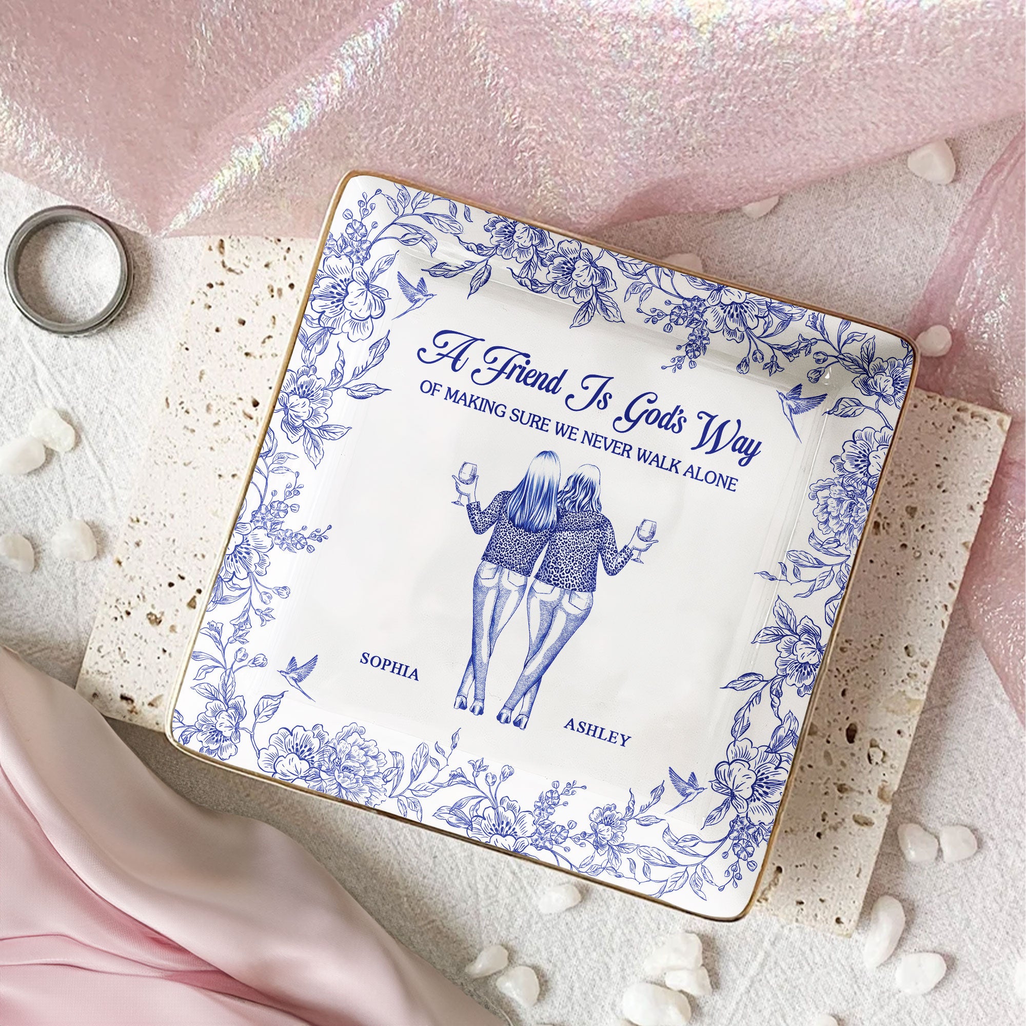 Featuring a touching quote – "A Friend Is God's Way of Making Sure We Never Walk Alone" – and an elegant blue floral border, this dish is more than just a place to keep rings or earrings. It’s a daily reminder of love, laughter, and shared memories.