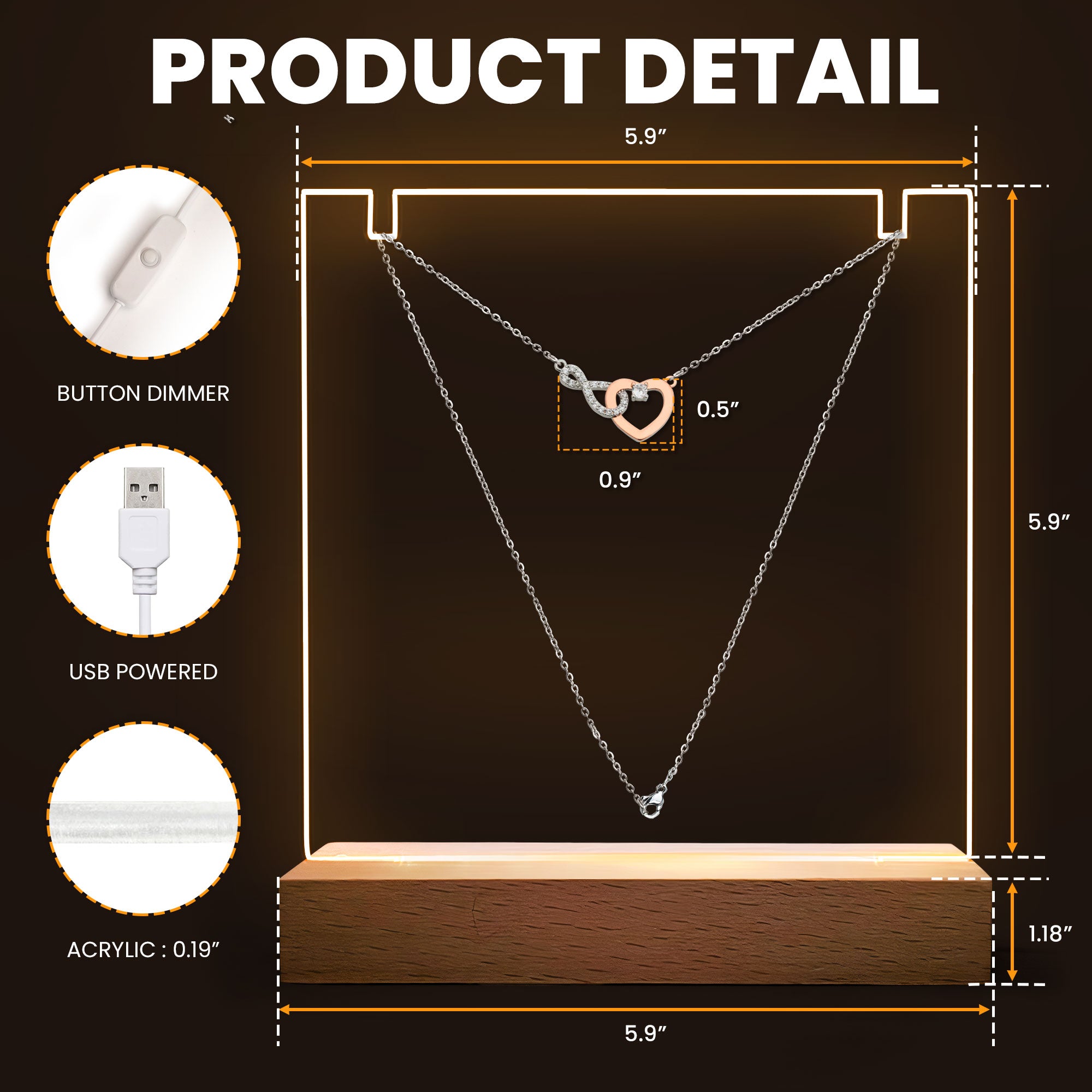 + Wooden base: 5.9 x 1.18 in ( ~ 15 x 3 cm). - Color: Seven light colors adjustment.