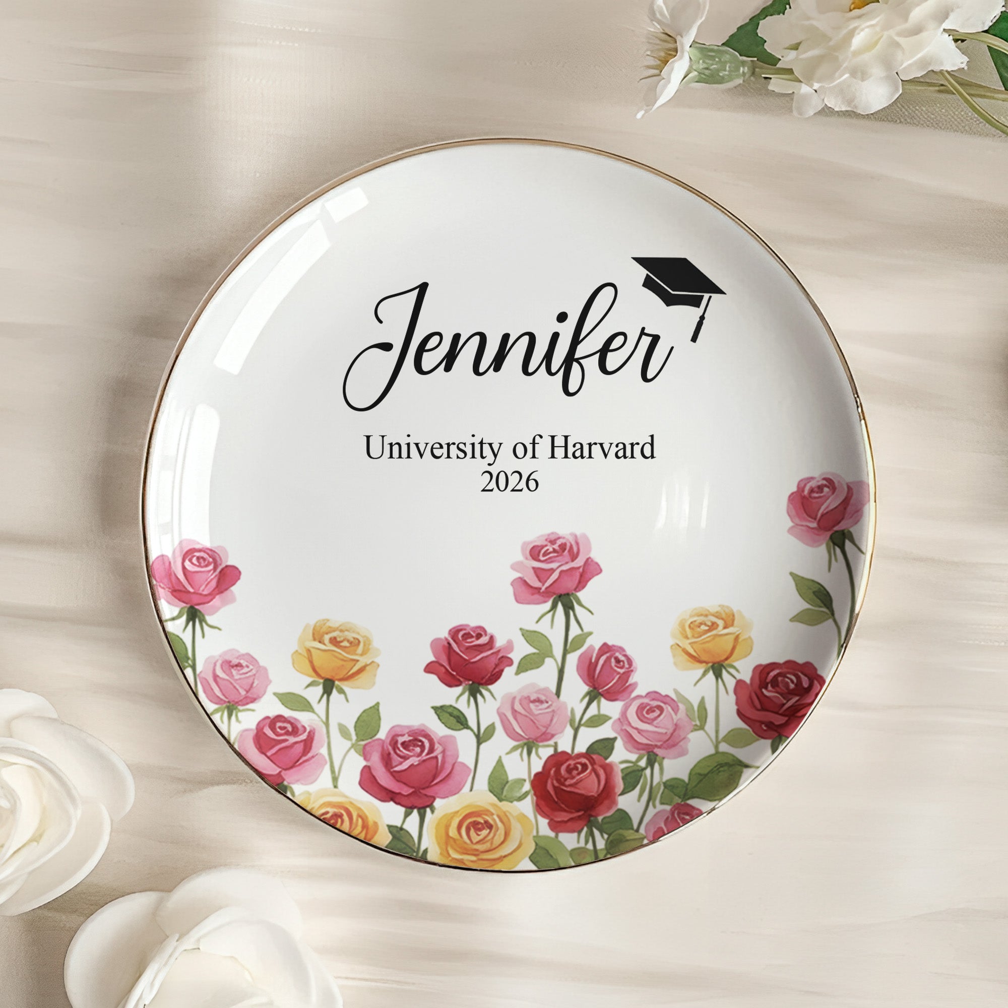 Perfect for graduations, birthdays, Christmas, anniversaries, or any special occasion, this Jewelry Dish makes a statement by itself. It's not just functional, but it also stands as a symbol of love and recognition towards the recipient's hard work and perseverance. This product is more than its use; it represents a journey and becomes an integral part of the recipient’s daily routine, ultimately brightening up their day. So why wait? Show your love today with this personalized Graduation Jewelry Dish and celebrate life's beautiful moments!