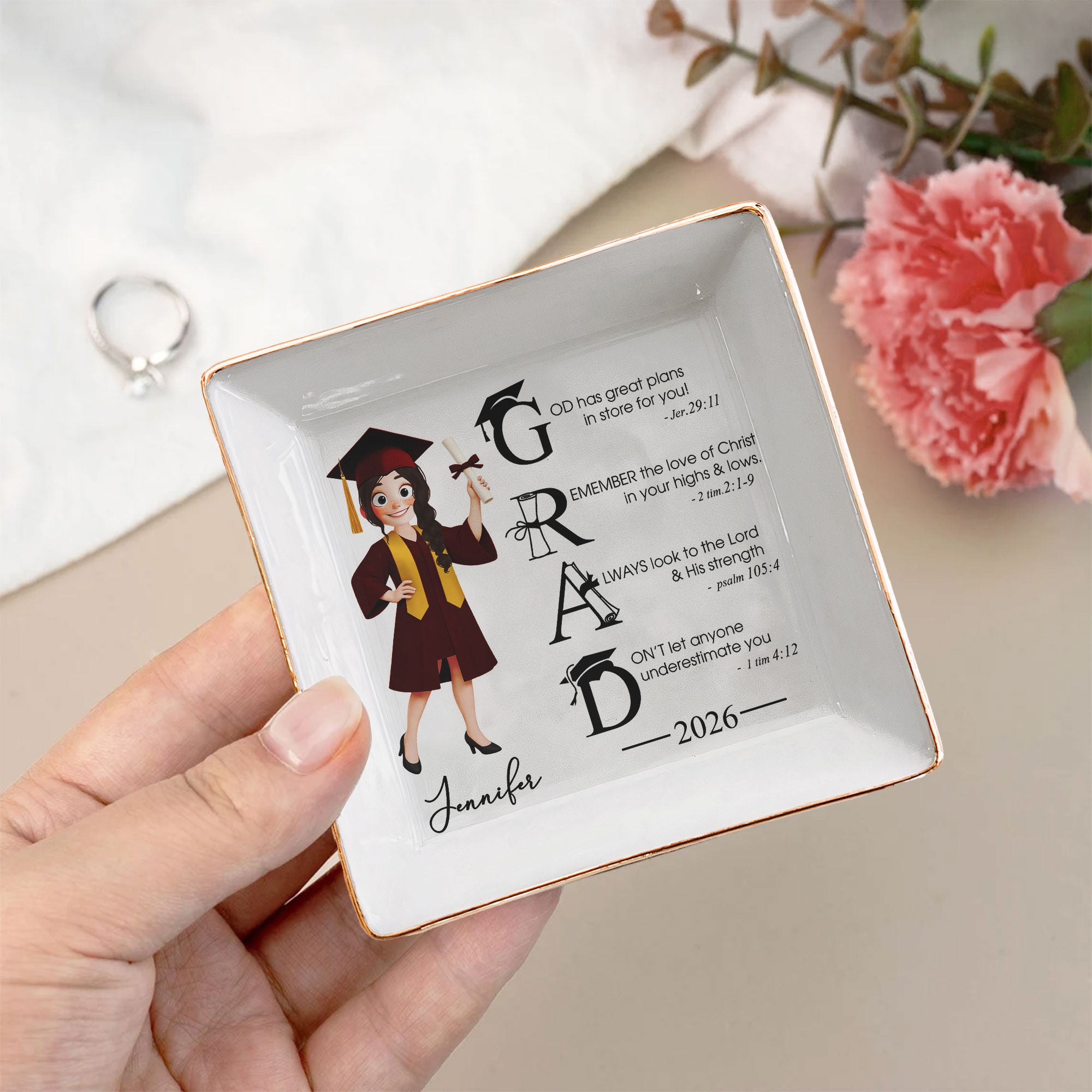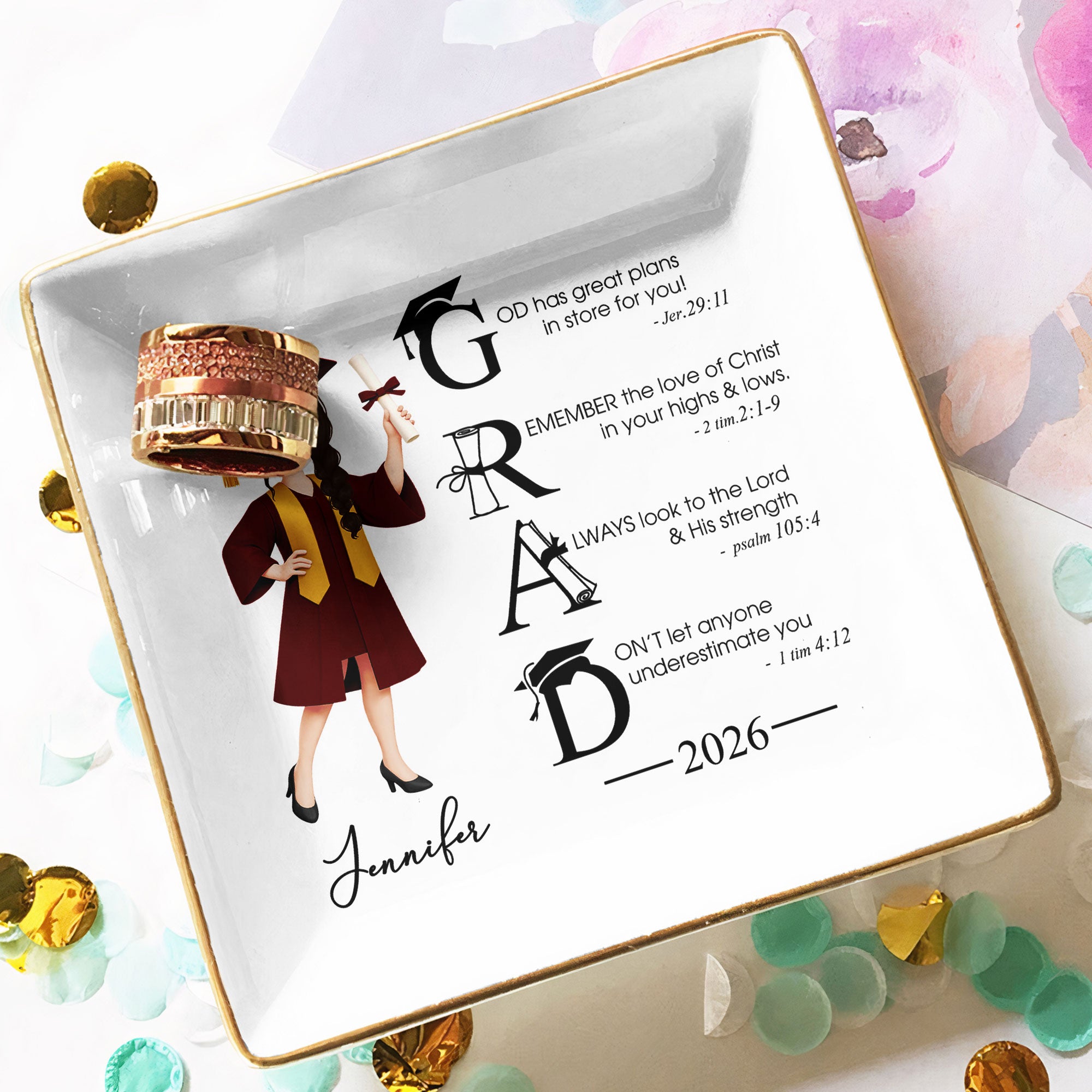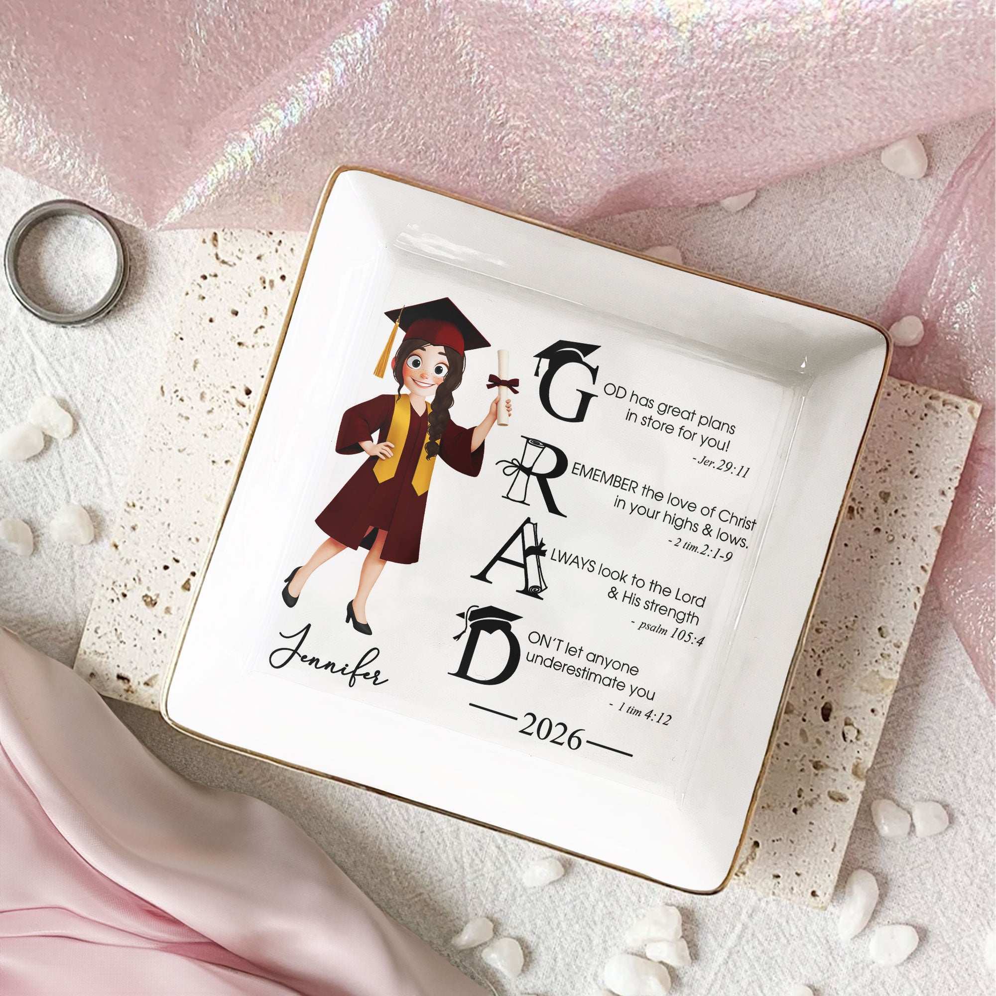 Celebrate life's significant milestones with our Graduation Motivation Personalized Square Jewelry Dish—a perfect memento for the recent graduate. Themed around the notion of bonding and resemblance, this dish serves as a humble reminder of the great plans the universe has in store for the recipient. It reinforces the importance of seeking strength from within and standing tall in the face of adversity. Perfect for graduations, birthdays, Christmas, anniversaries, or any occasion that warrants a special keepsake.