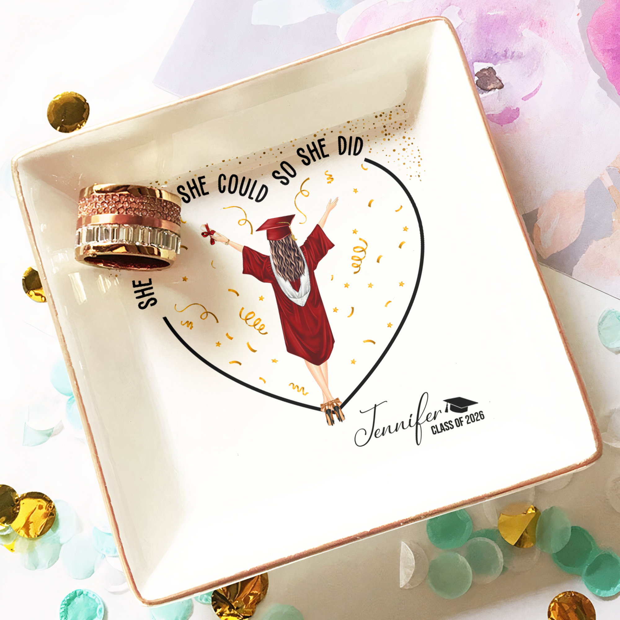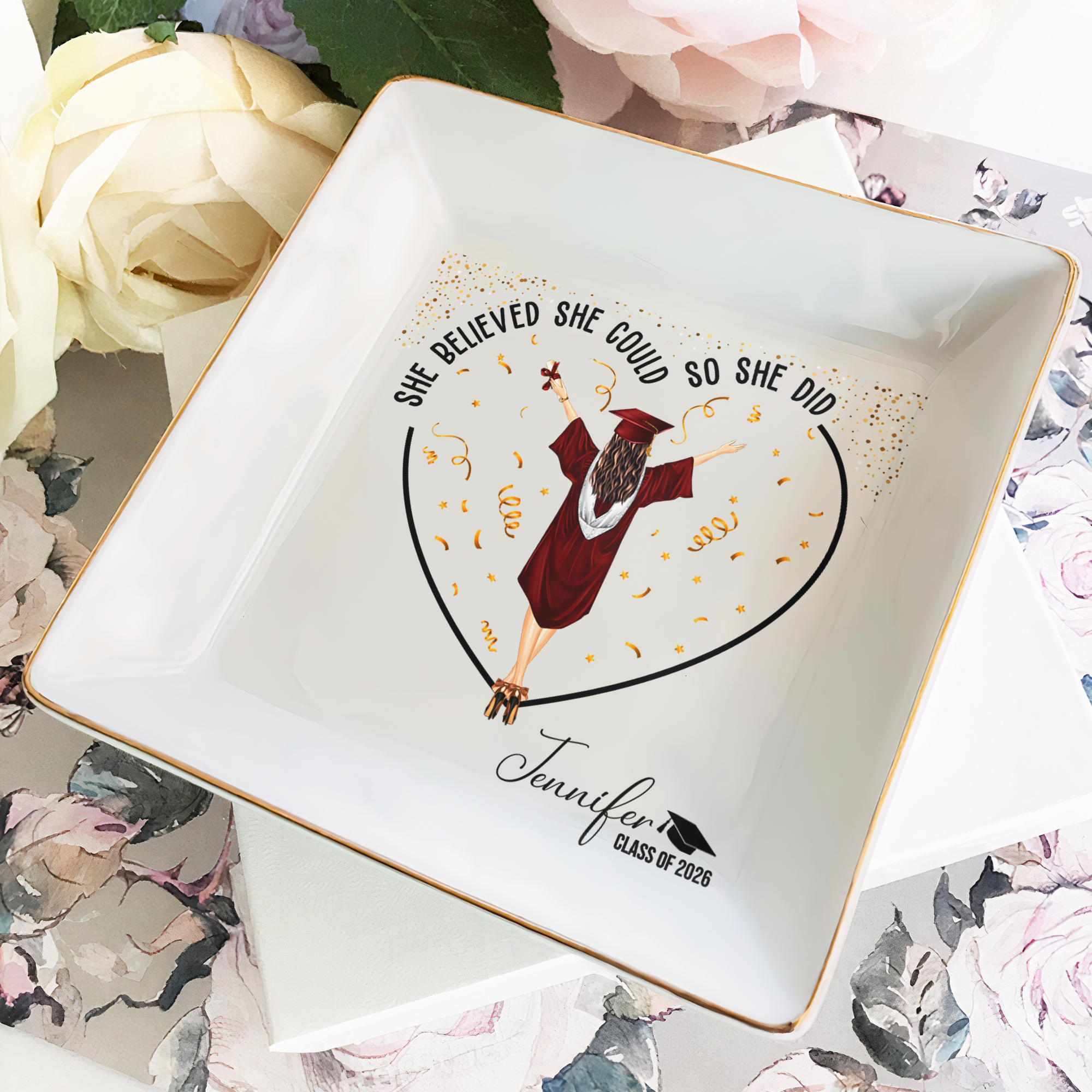 Our Personalized Jewelry Dish She Believed She Could So She Did is a thoughtful and heartfelt choice. Whether it's for a friend, sibling, child, or grandchild, this personalized keepsake is sure to be treasured as a symbol of their achievement and the exciting journey ahead.