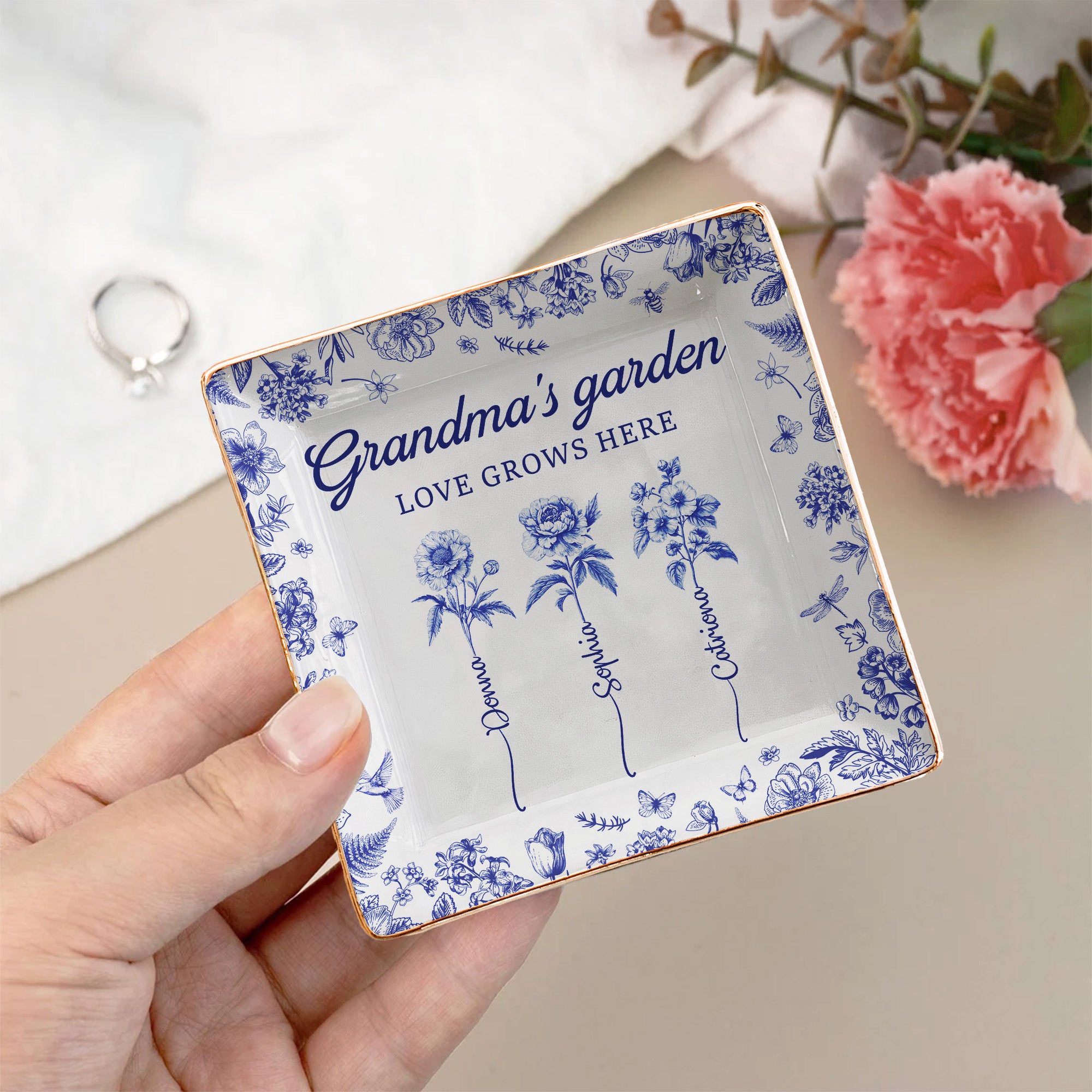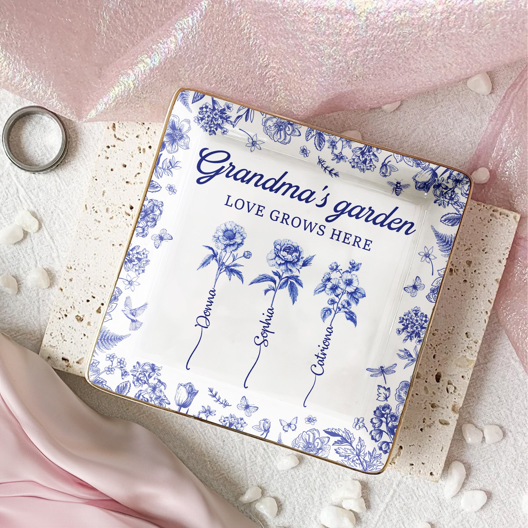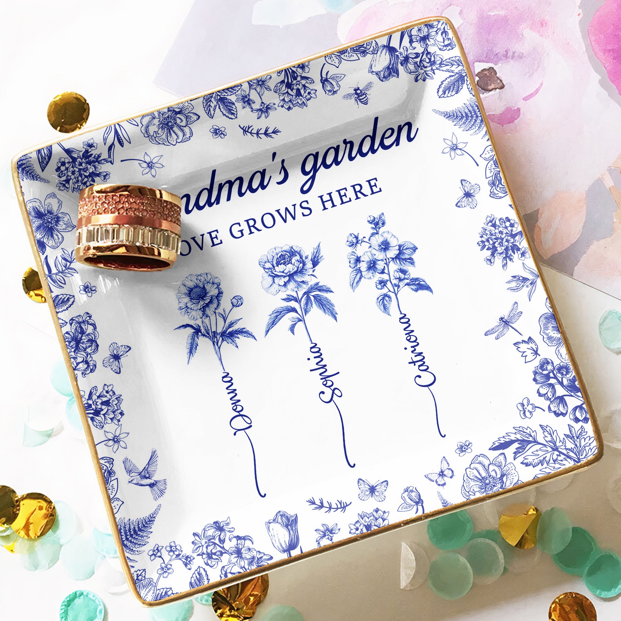Indulge your beloved grandma with a token of affection and family bond. Our Square Jewelry Dish, aptly titled "Grandma's Garden", is the ideal present that reflects love and the ties that connect us. Inspired by the gardens grandmas love, this vibrant dish carries the ever blooming love found in every corner of Grandma's botanical paradise. Perfect for Mother's Day, birthdays, or any special occasion where a heartfelt gesture needs to be expressed. This piece reminds us how much her love grows in us.