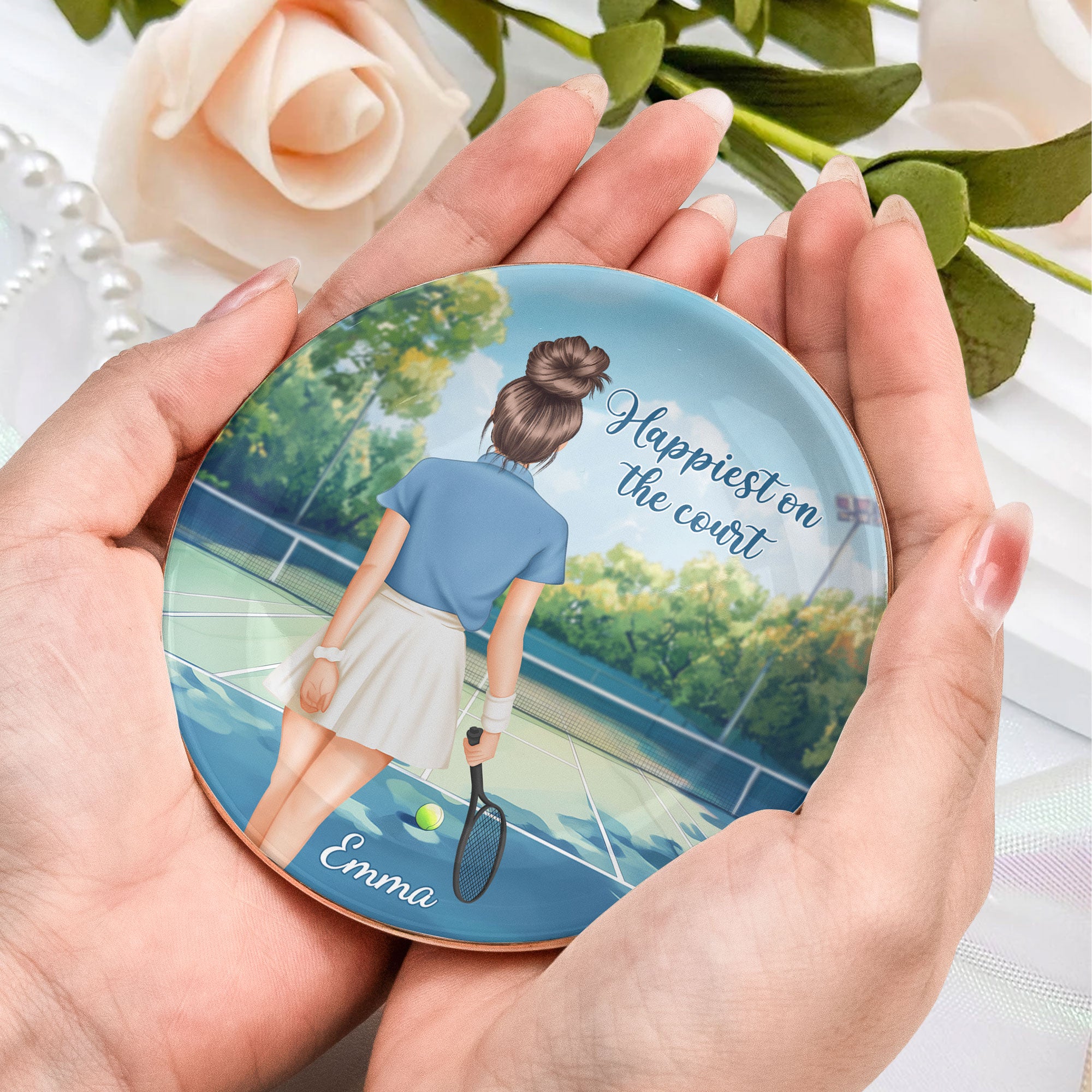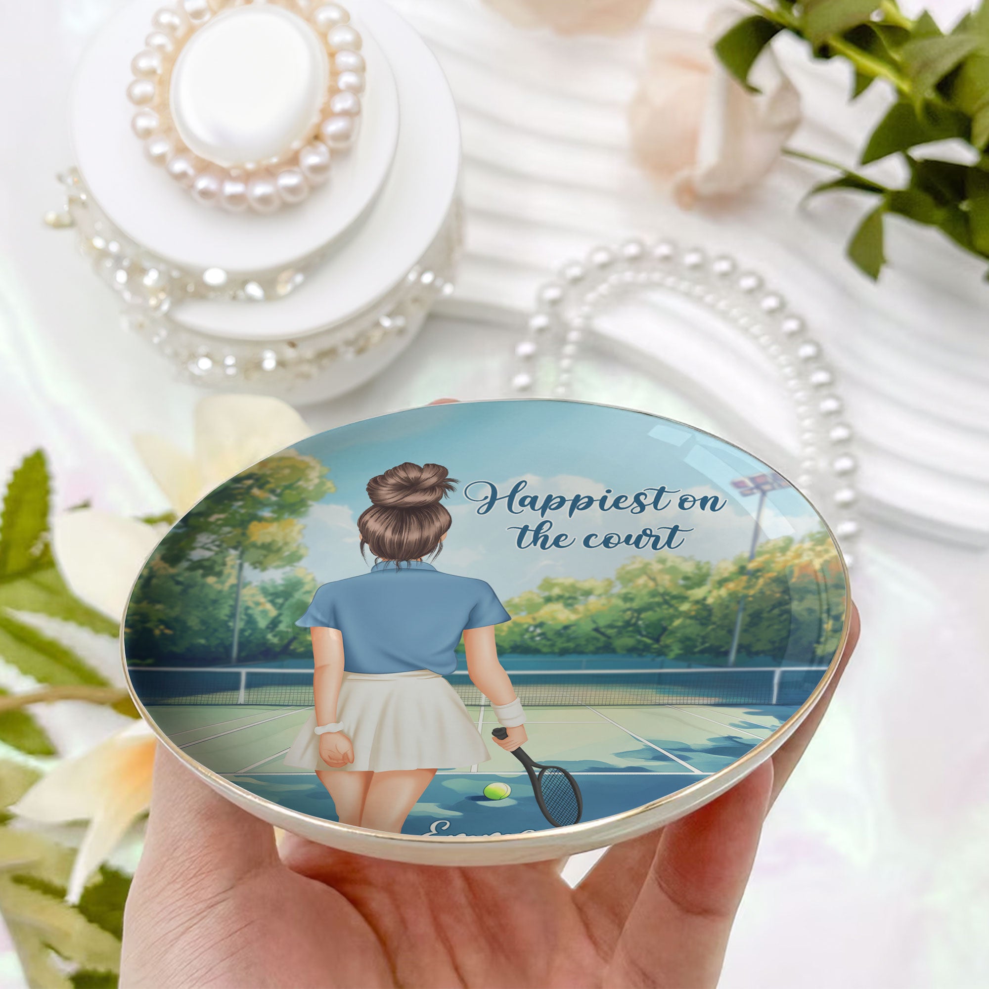 This beautifully designed jewelry dish is the perfect keepsake for any tennis lover. Featuring a stylish illustration of a player on the court, it captures the joy of the game with the quote "Happiest on the court." Personalize it with a custom name, outfit, hairstyle, and skin tone to make it truly unique. Made from high-quality ceramic with a smooth, glossy finish, it’s perfect for holding rings, earrings, and small accessories. A thoughtful gift for tennis enthusiasts who want to keep their passion close, even off the court!