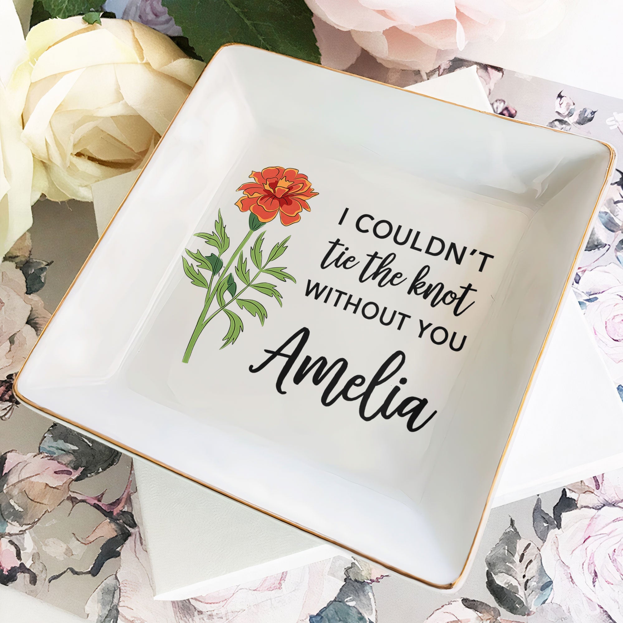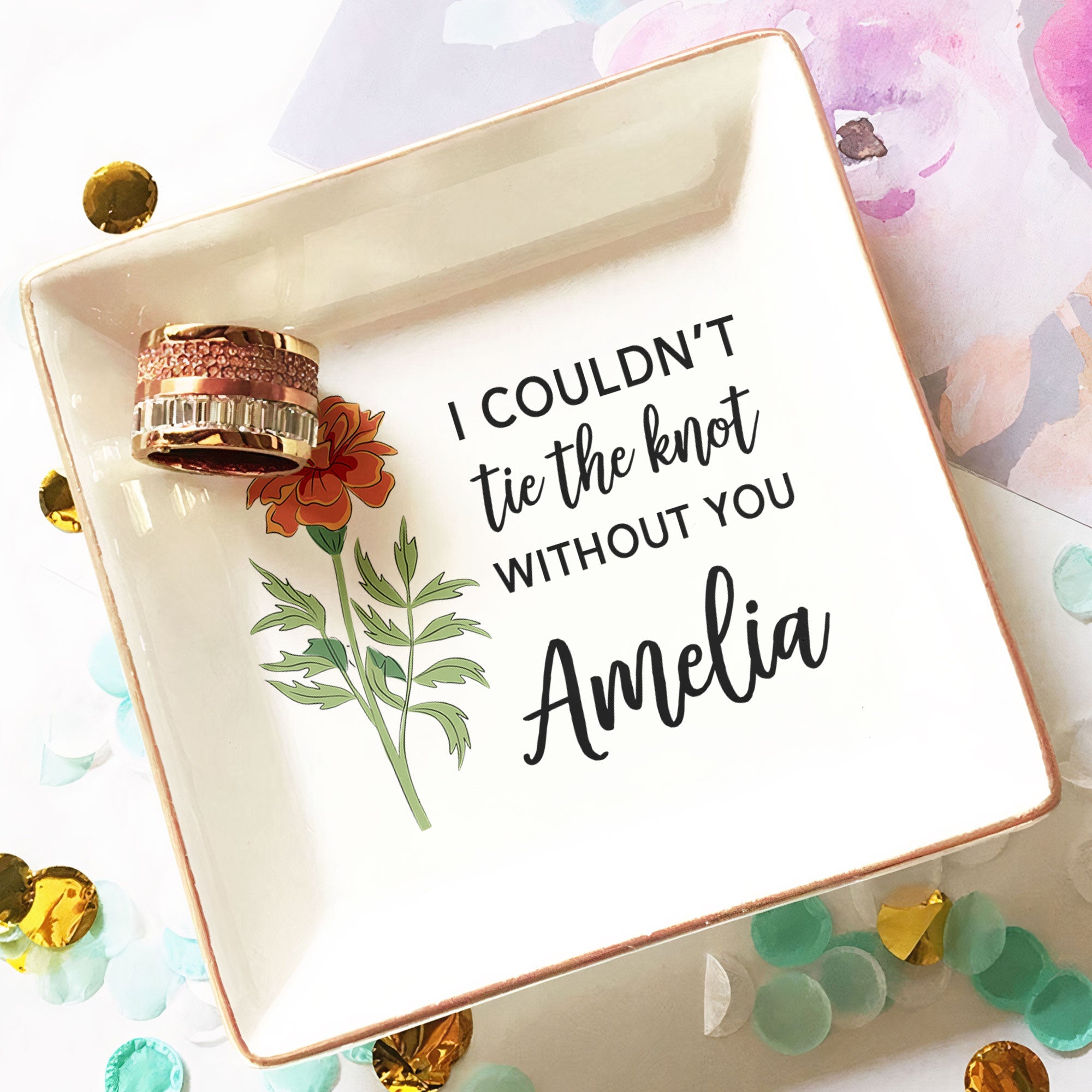 The jewelry dish can be customized with the bridesmaid's name and birth month flower.