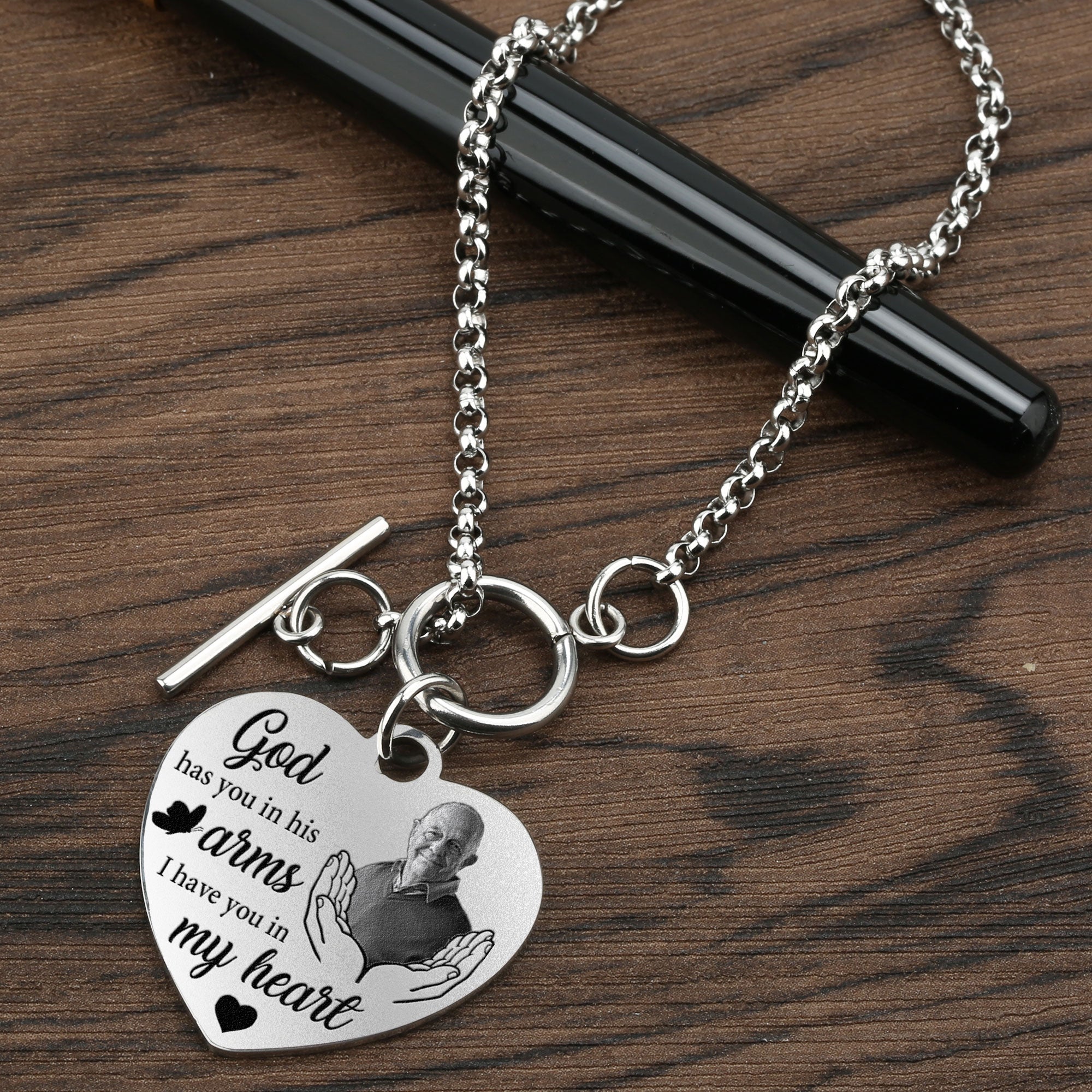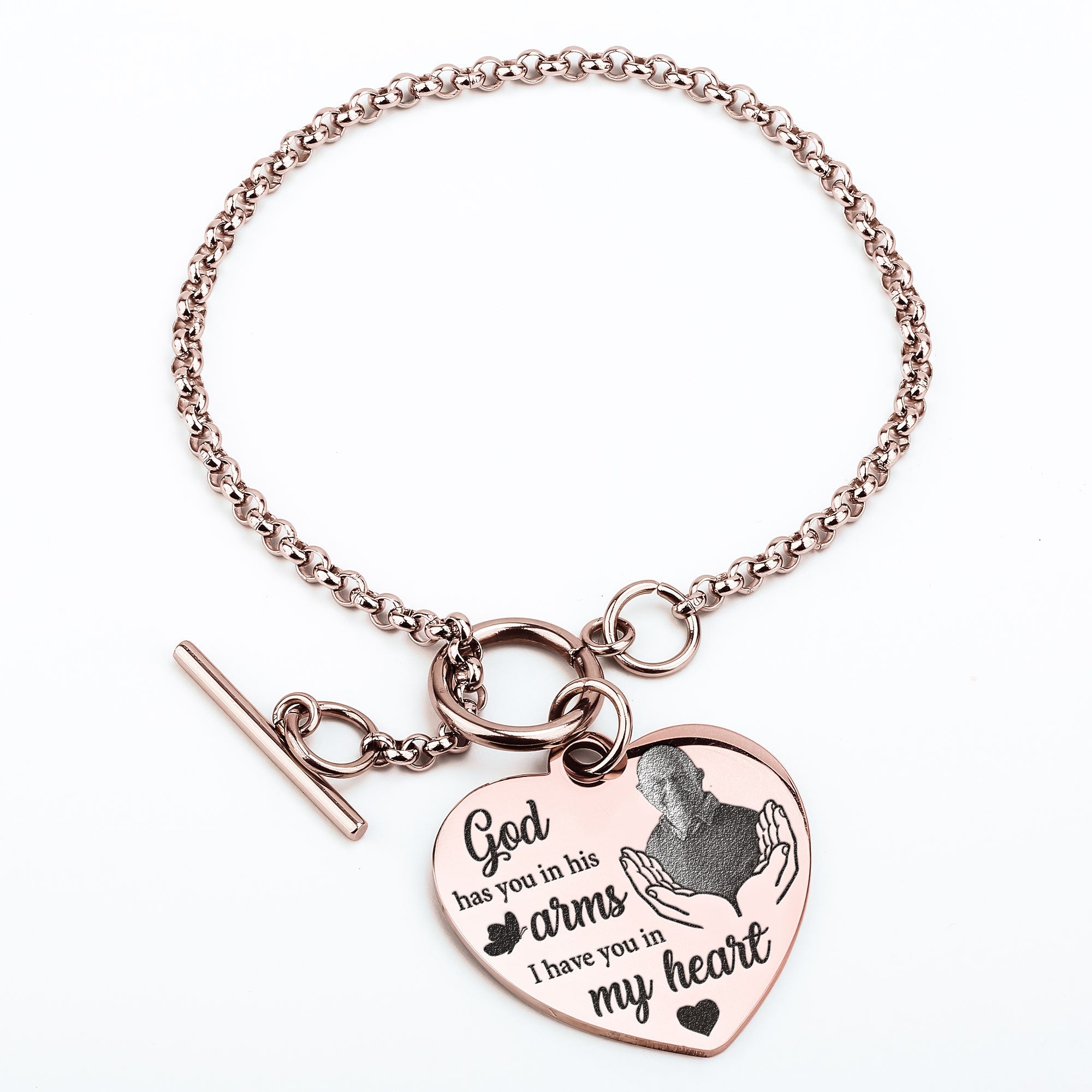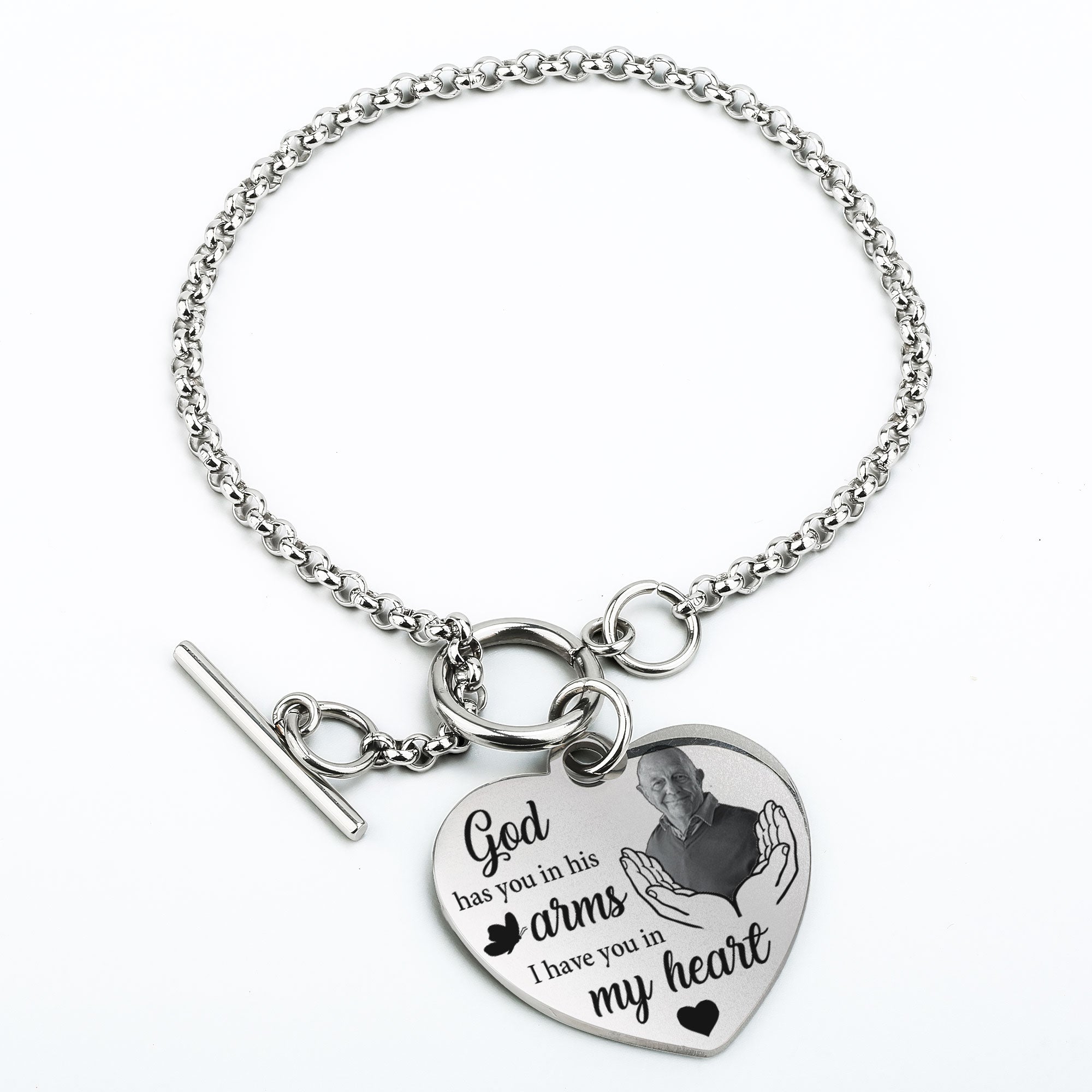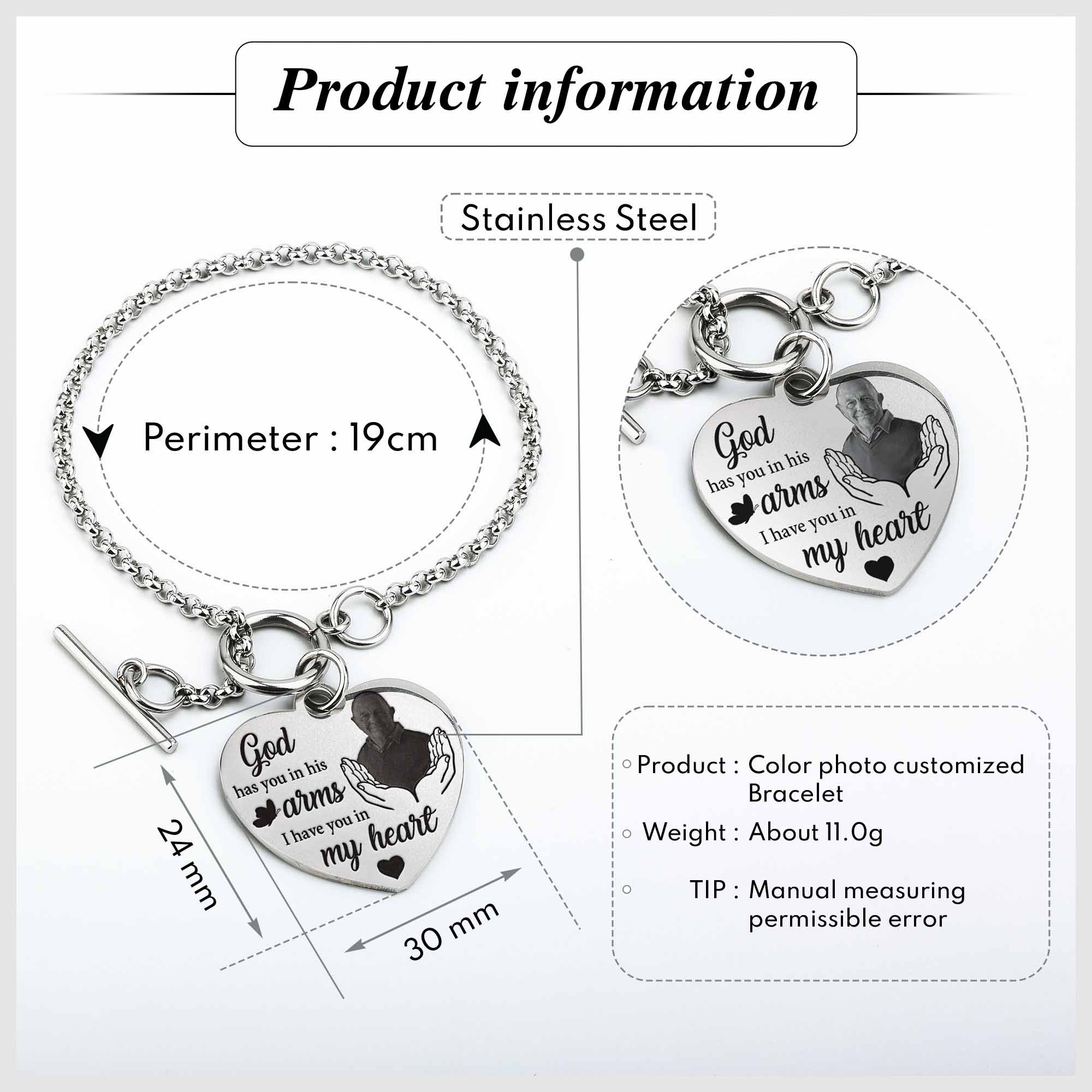 Celebrate the enduring presence of a loved one with our Personalized Photo Heart Bracelet – a heartfelt memorial gift that encapsulates the sentiment, "God has you in his arms, I have you in my heart." In times of remembrance, this bracelet serves as a tangible reminder of the everlasting bond and the enduring spirit of those we hold dear.