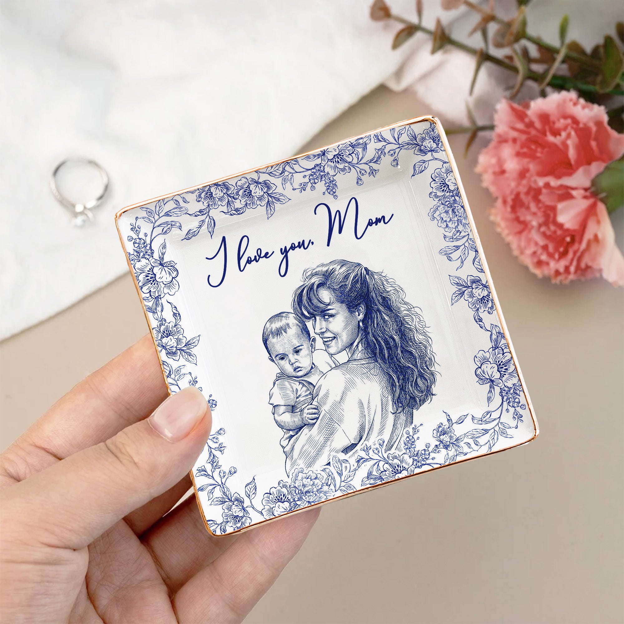 Bring love and sentiment to your mom on a special day with our custom photo ring dish. This unique and purposeful Jewelry Dish is the perfect medium to flaunt those memorable moments that mean the world to your mom. The dish is a blend of sentiments and memorabilia and is expertly crafted with your cherished photo at the center, embedding an invisible message that says "I Love You Mom." This personalized dish is like a memory holder, storing little treasures, especially rings, that are dear to your mom.