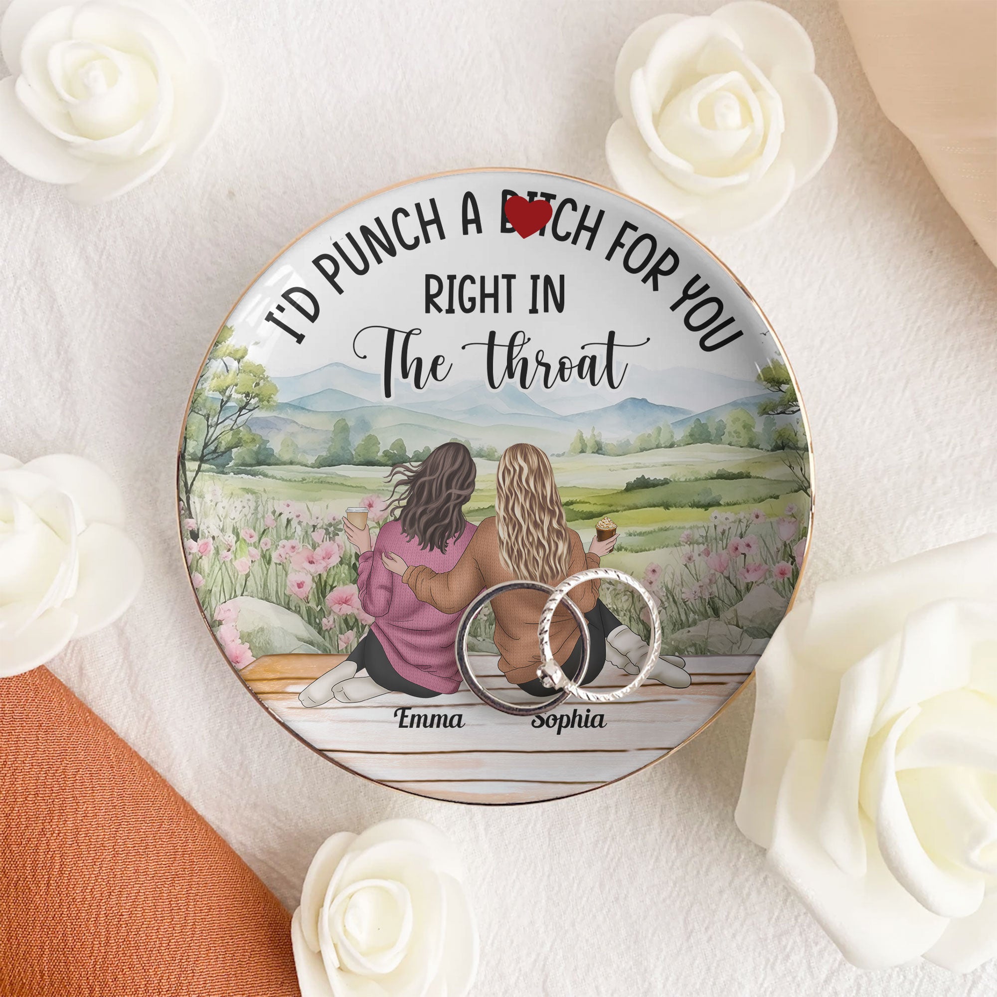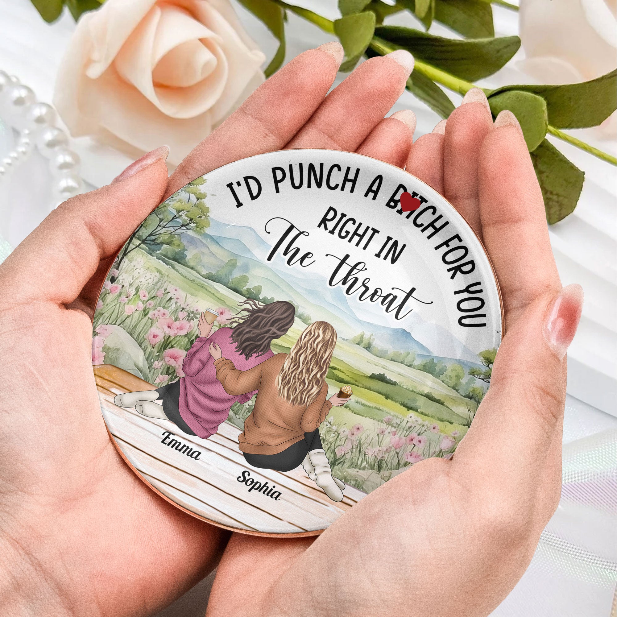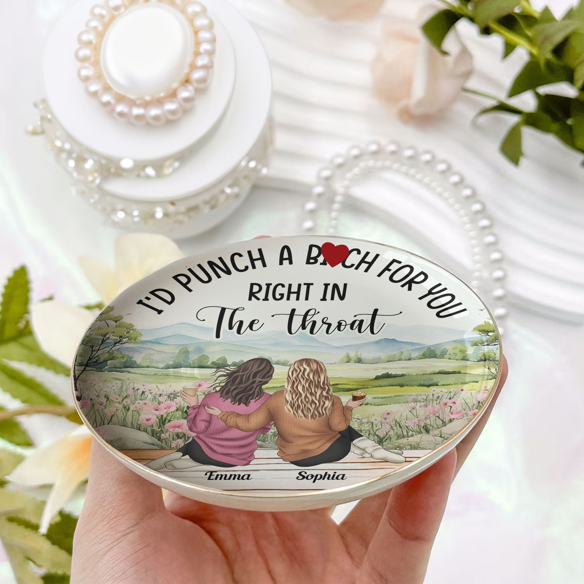 Celebrate your friendship with the "I'd punch a b*tch for you right in the throat" Personalized Jewelry Dish. This charming and thoughtful gift is perfect for best friends, making it an ideal friendship gift for any occasion. Perfect as a birthday gift, Christmas gift, or just to show appreciation, this personalized jewelry dish is a wonderful way to express your love and gratitude to your bestie. Great for women, it’s a unique and memorable gift for your closest friends.