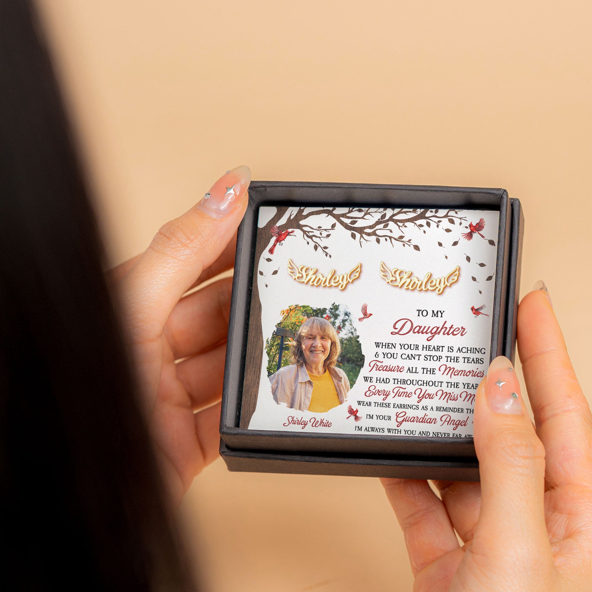 Discover the heartfelt sentiment of our I'm Always With You Never Far Away Memorial Gift, a custom name stud earrings that pairs perfectly to every style. Crafted with love for those valued humans in our lives who treasure bonding and resemblance, these earrings serve as a subtle reminder that their guardian angel is always near.