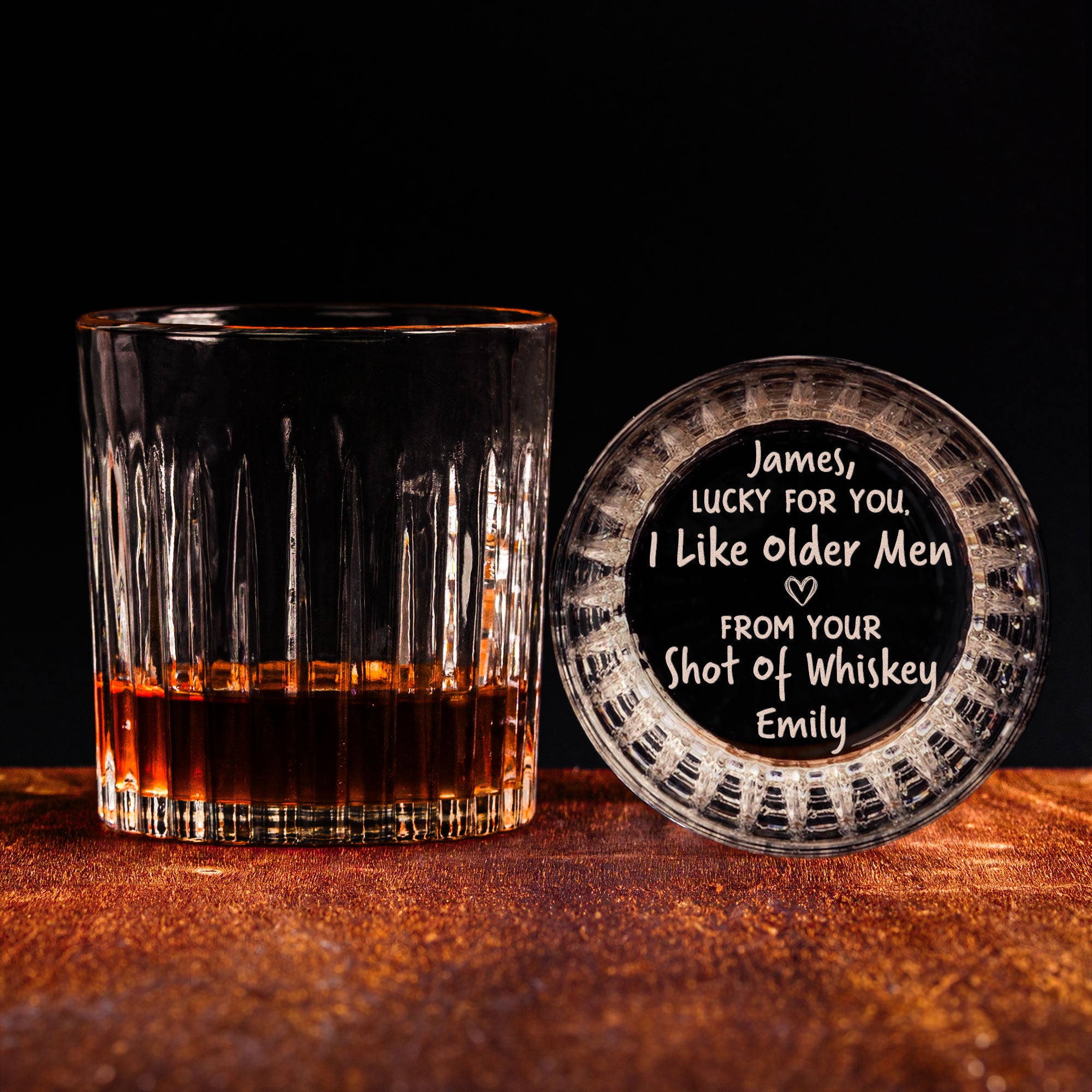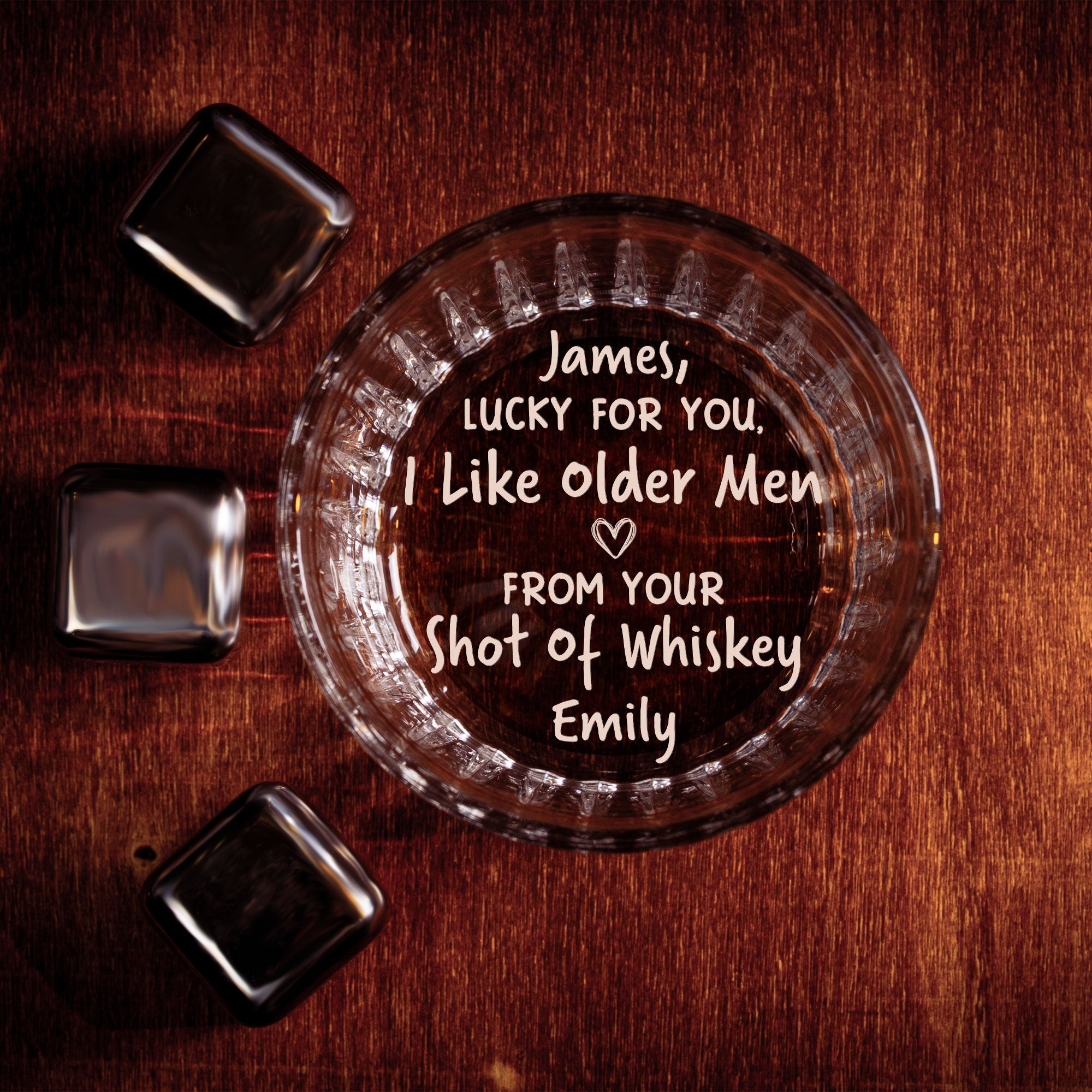 Bring smiles and laughter to your spouse's face with our hilarious engraved whiskey glass - cheekily designed with a playful note for those mature and seasoned husbands or boyfriends who proudly embrace their age. Perfect for your beloved significant other or couples in your life who share a rich sense of humor. The glass is a fantastic present idea for various occasions such as anniversaries, Valentine’s Day, birthdays, Christmas, or any event that calls for some fun. It carries a charming message that subtly alludes to, 'getting older has its perks'.