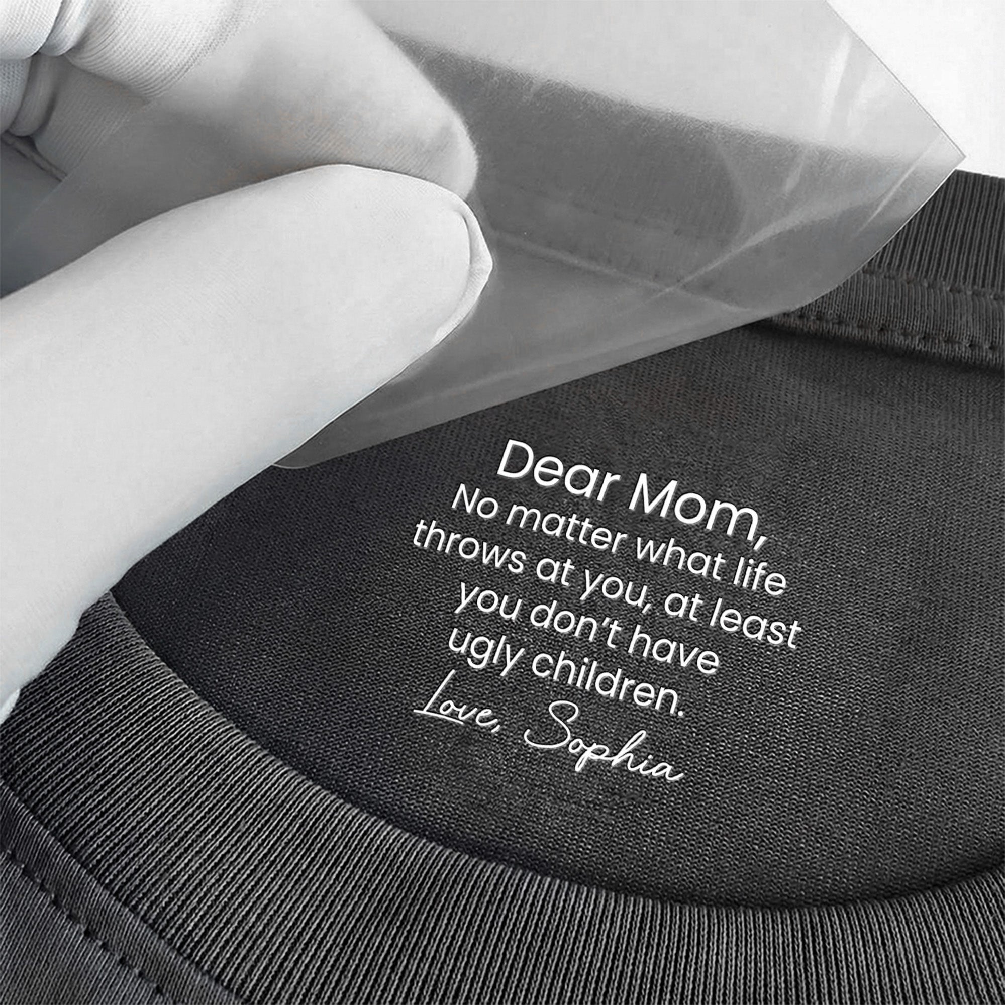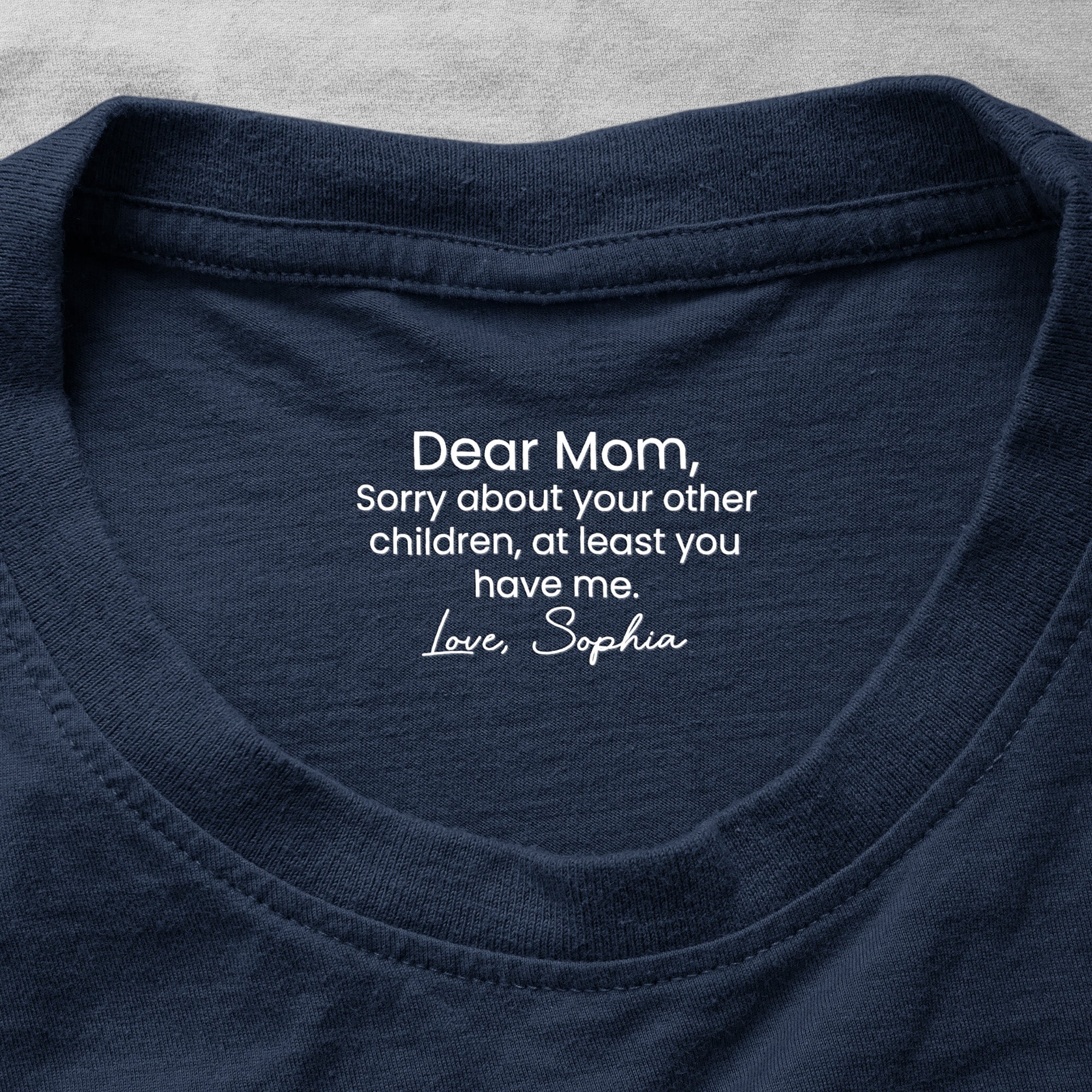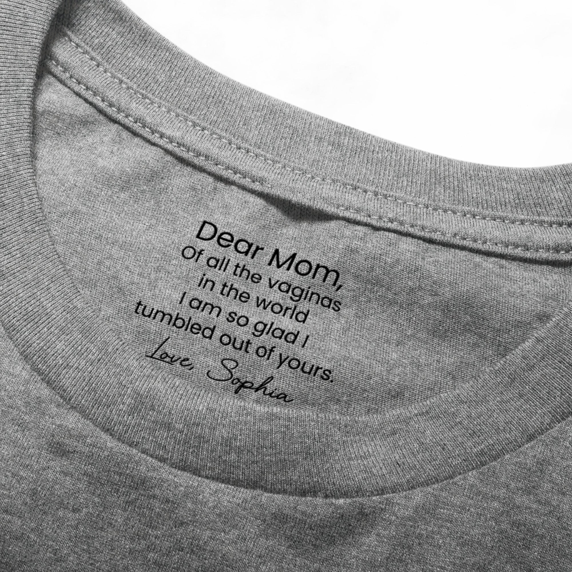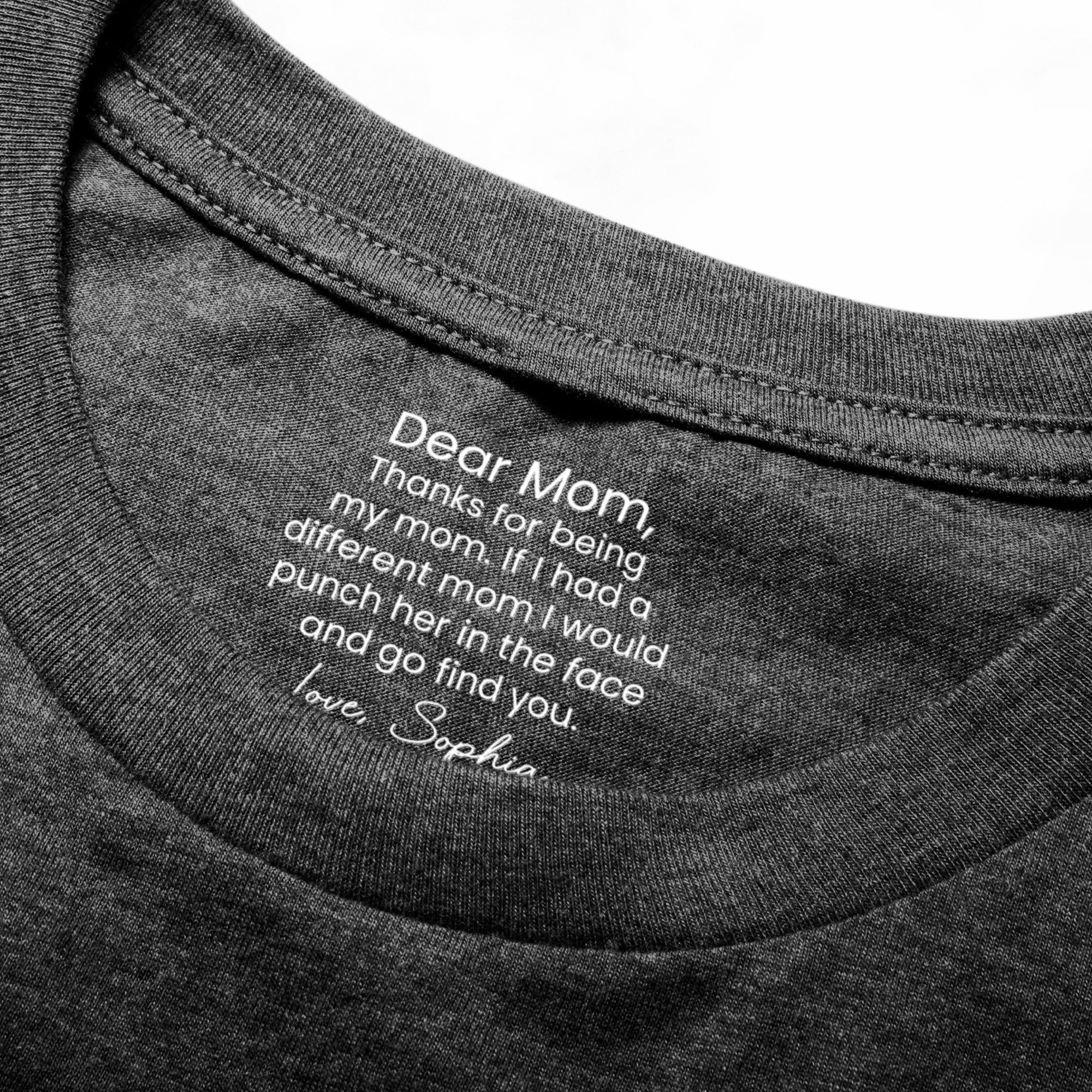 Share a laugh and thank your mother for her fantastic genes with our Shirt With Design Inner Neck with funny hidden messages. The playful message carefully imprinted on the inner neck reveals a quirky and hidden message only the wearer knows. It's a humorous gift reflecting the close bond and resemblance between you and your mom.