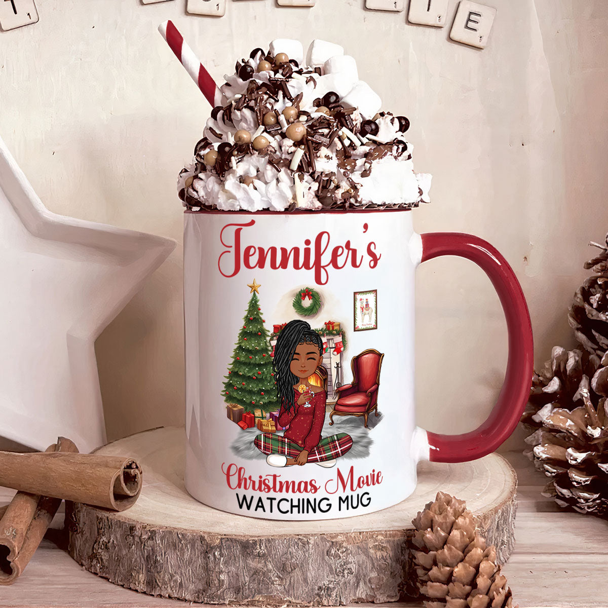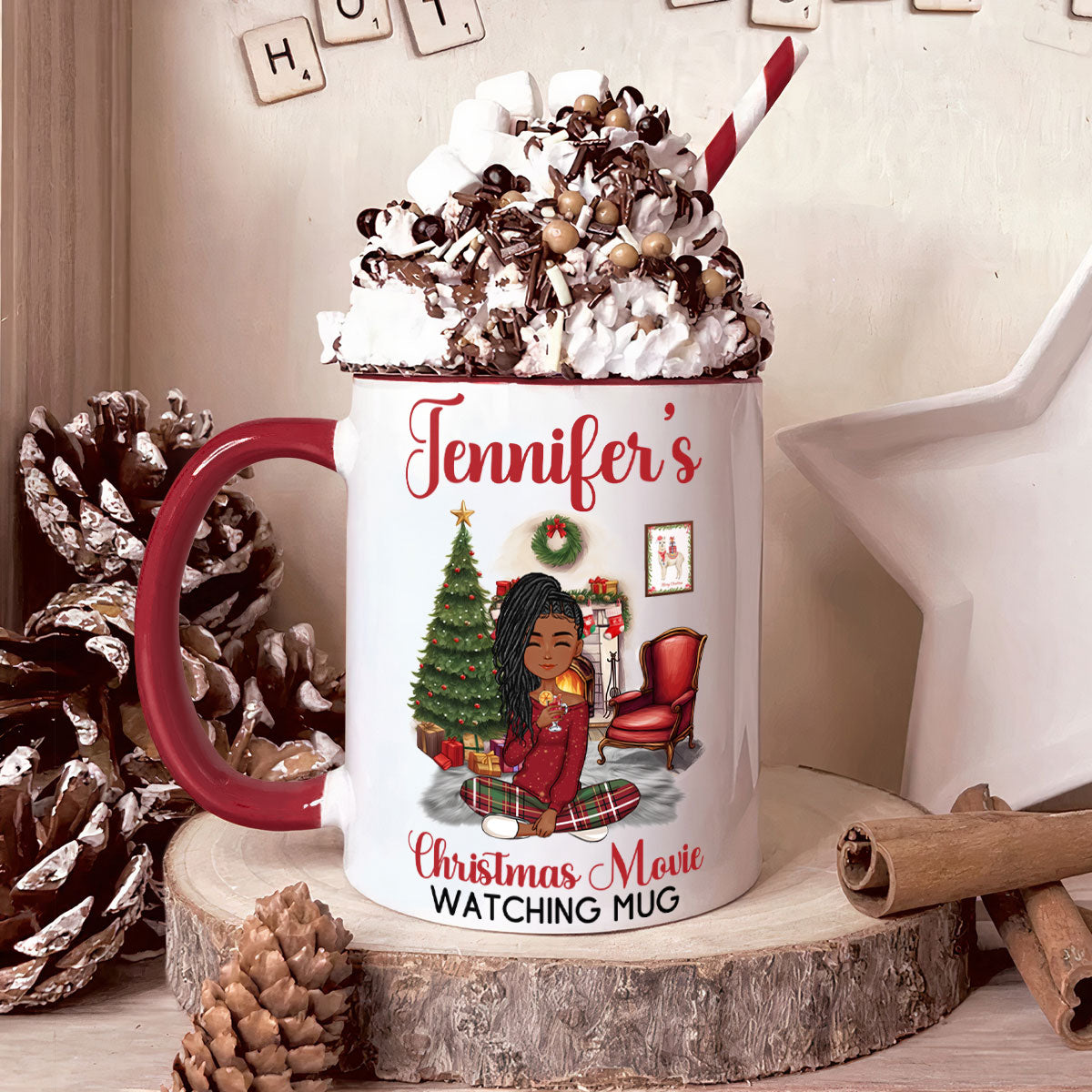Elevate your holiday moments and make your loved ones smile by gifting them this personalized accent mug. It's a thoughtful gift for family, friends, boss, coworkers, mom, daughter, father, partner, and anyone special in your life. This mug transforms your movie-watching experience into a cozy and memorable occasion. Share the joy of the season with a personalized touch that warms the heart.