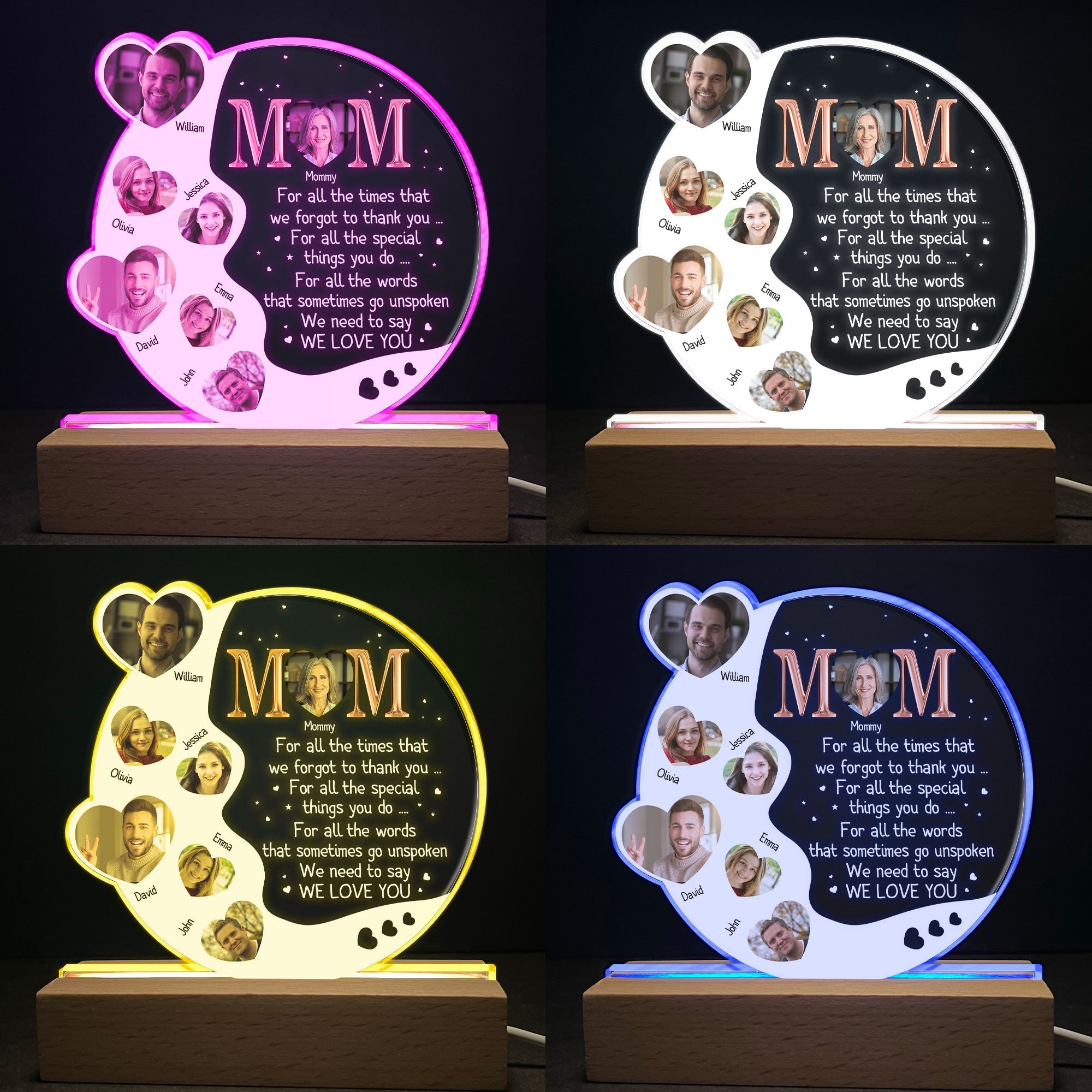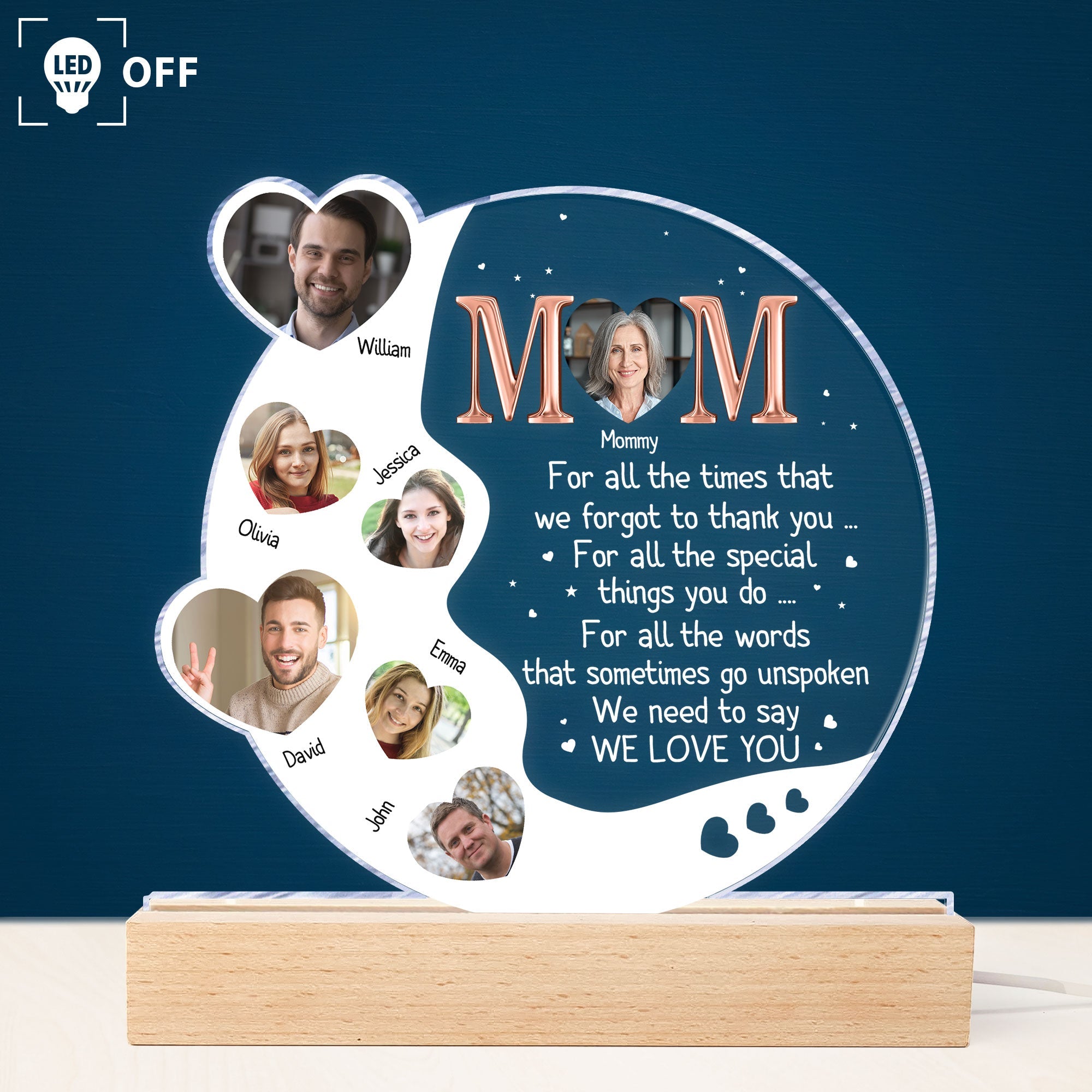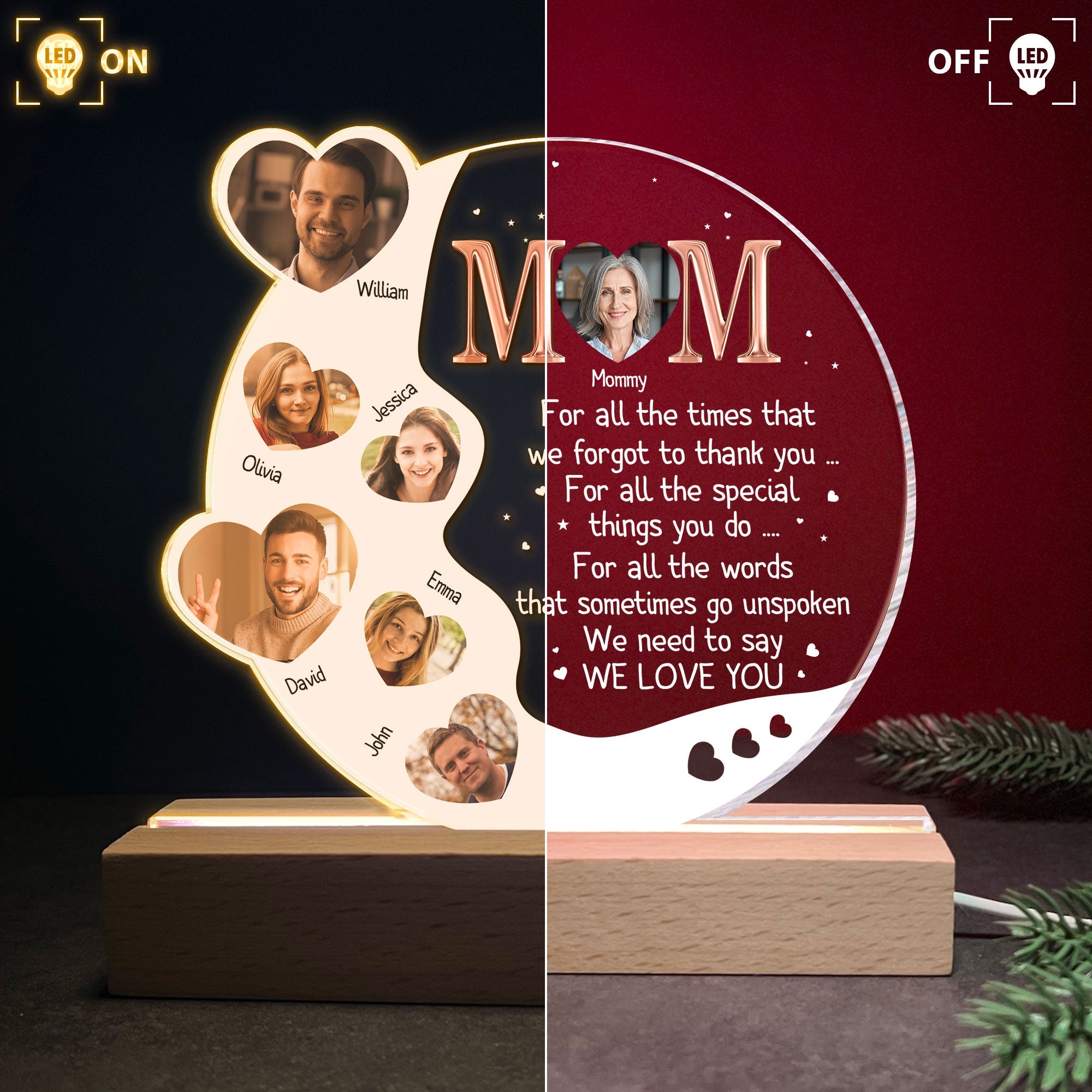 This 3D LED light wooden base is a unique gift for Mom. It's made of wood and has a personal touch. This will make her smile every time she looks at it.