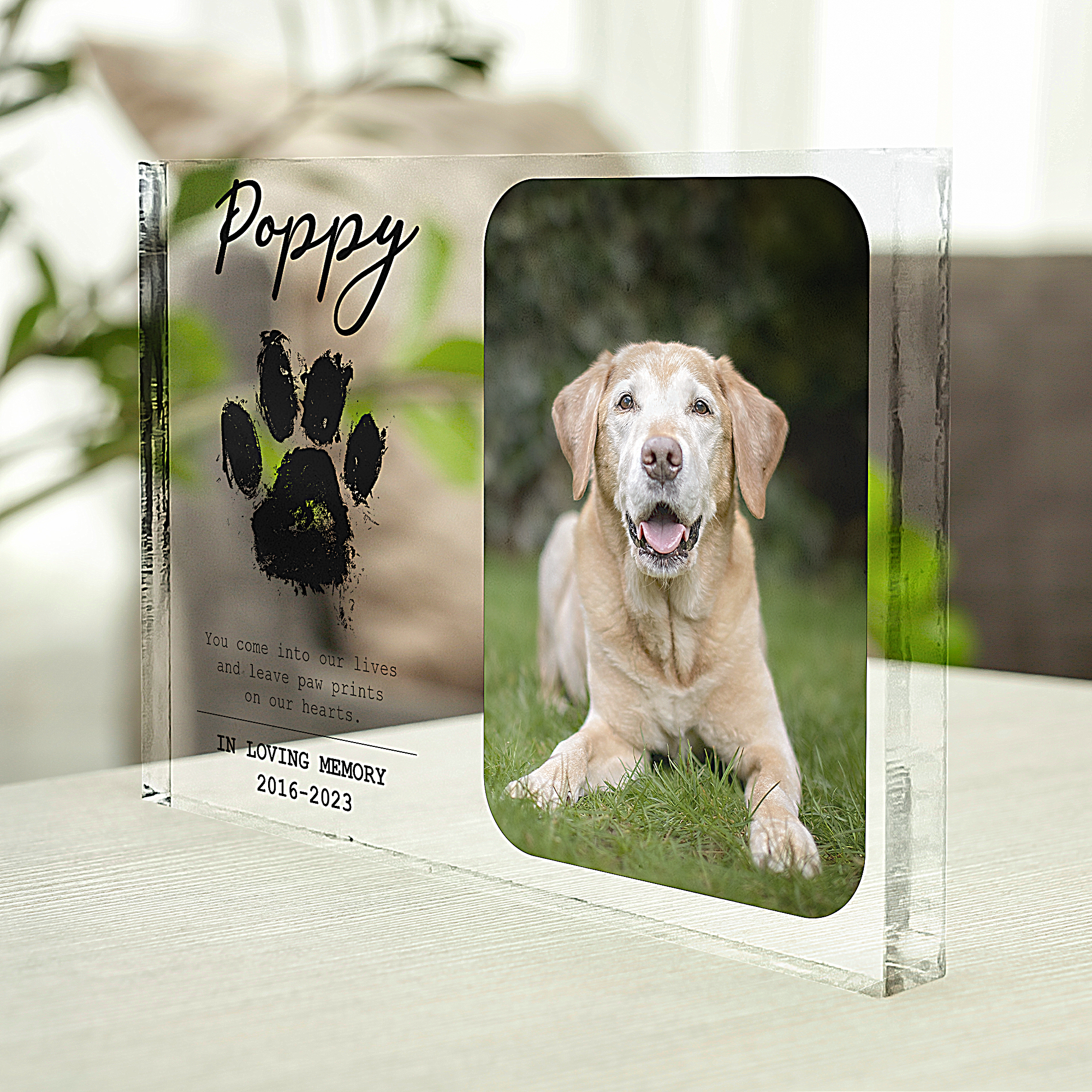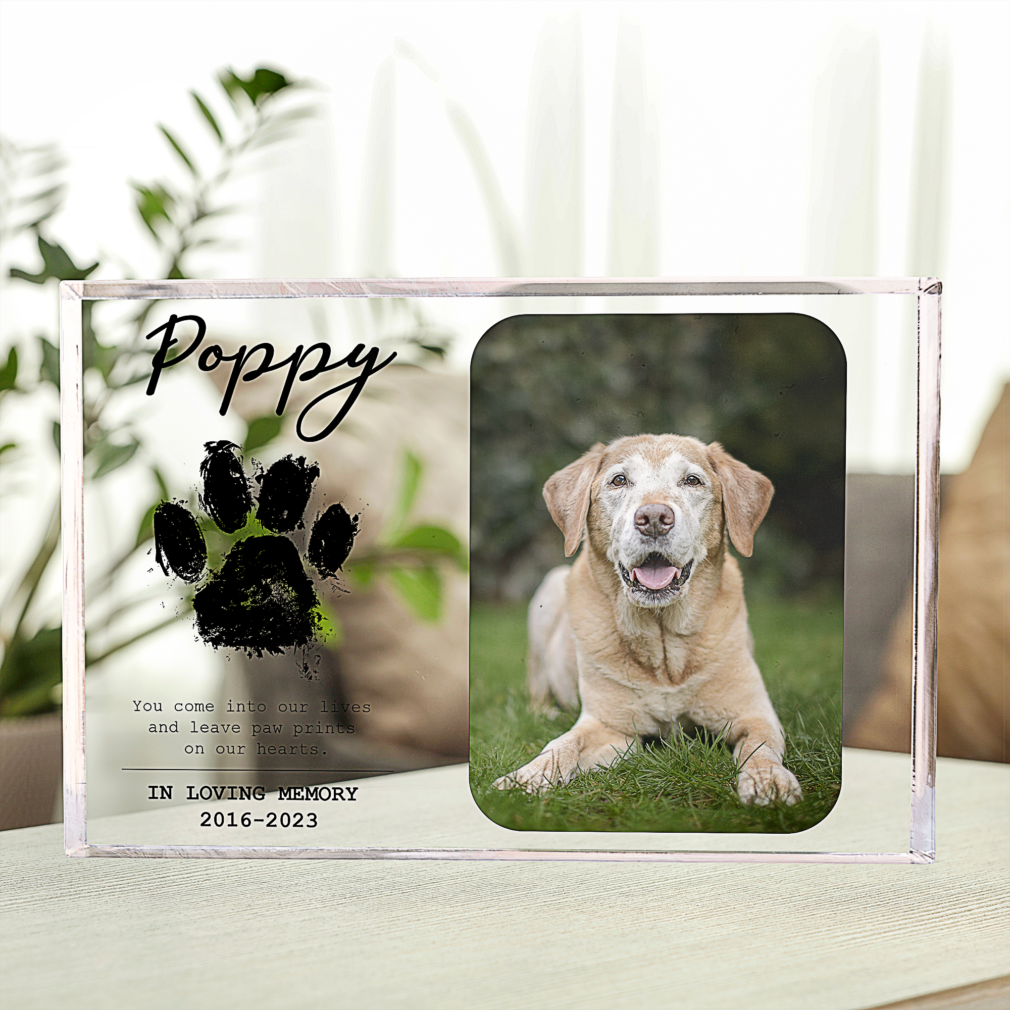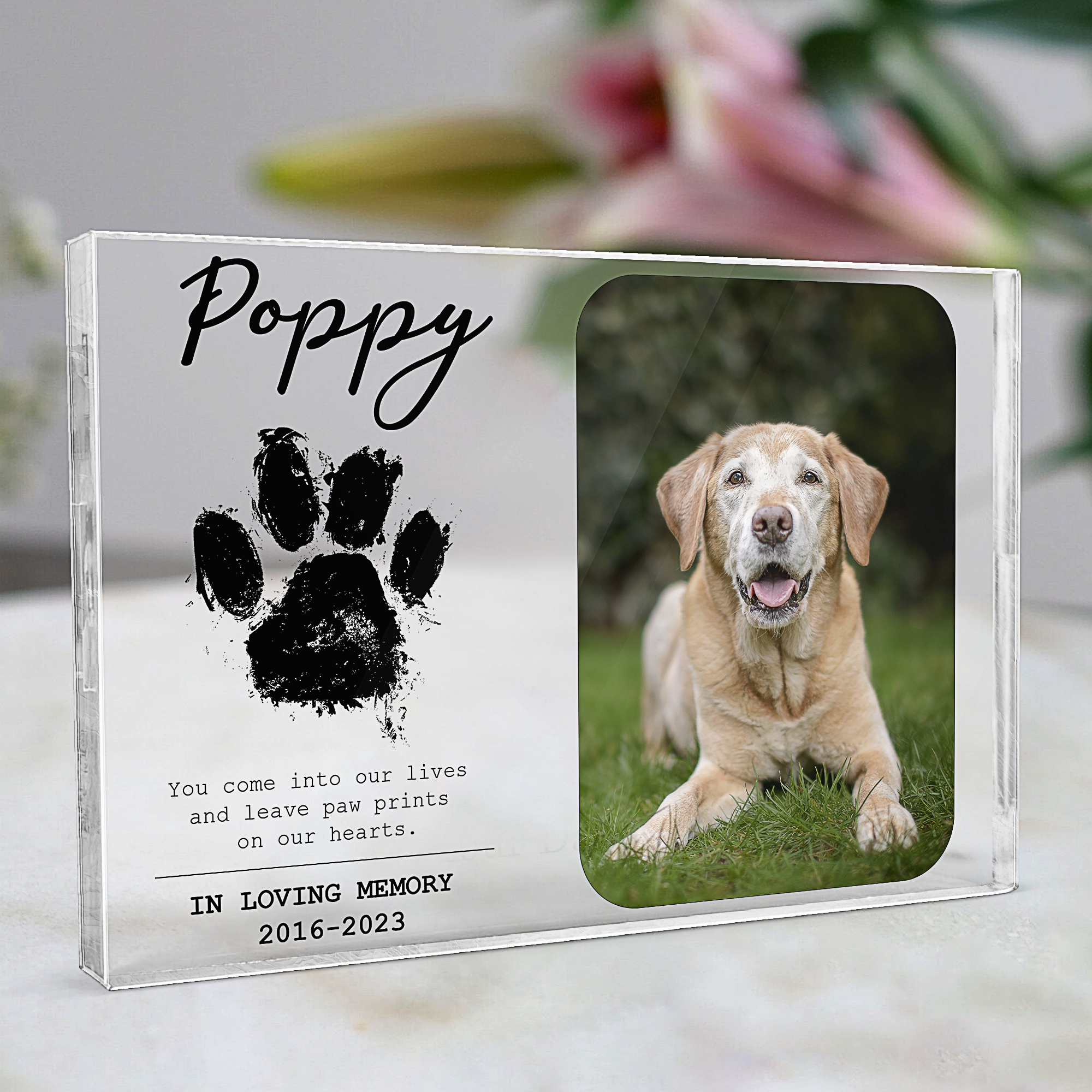 Introducing our heartfelt and personalized product: the "You Come Into Our Lives And Leave Paw Prints On Our Hearts" Rectangle Acrylic Plaque. This touching keepsake allows you to insert a cherished photo of your beloved pet, immortalizing the special bond they share with you. A perfect gift for pet lovers, dog enthusiasts, and cat devotees alike, this acrylic plaque serves as a tender reminder of the love and joy our furry companions bring into our lives, leaving everlasting paw prints on our hearts. Celebrate the unconditional love of your furry friend with this meaningful and touching memento.