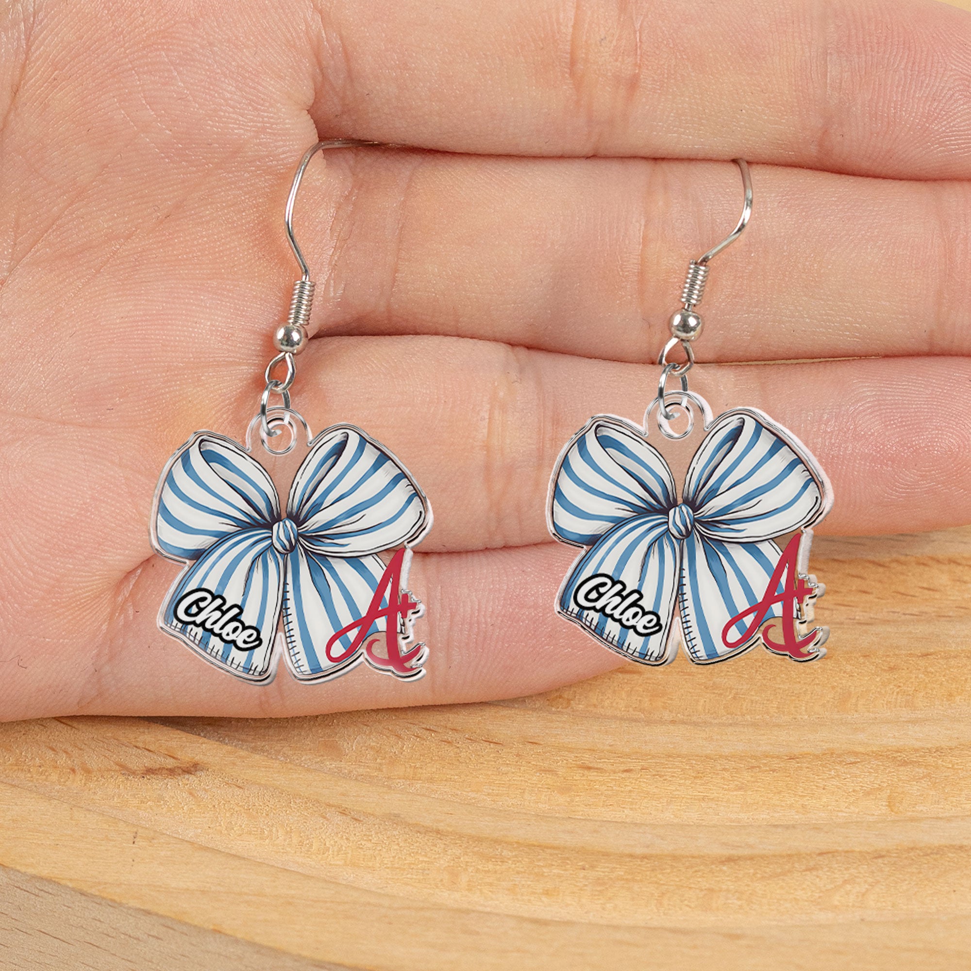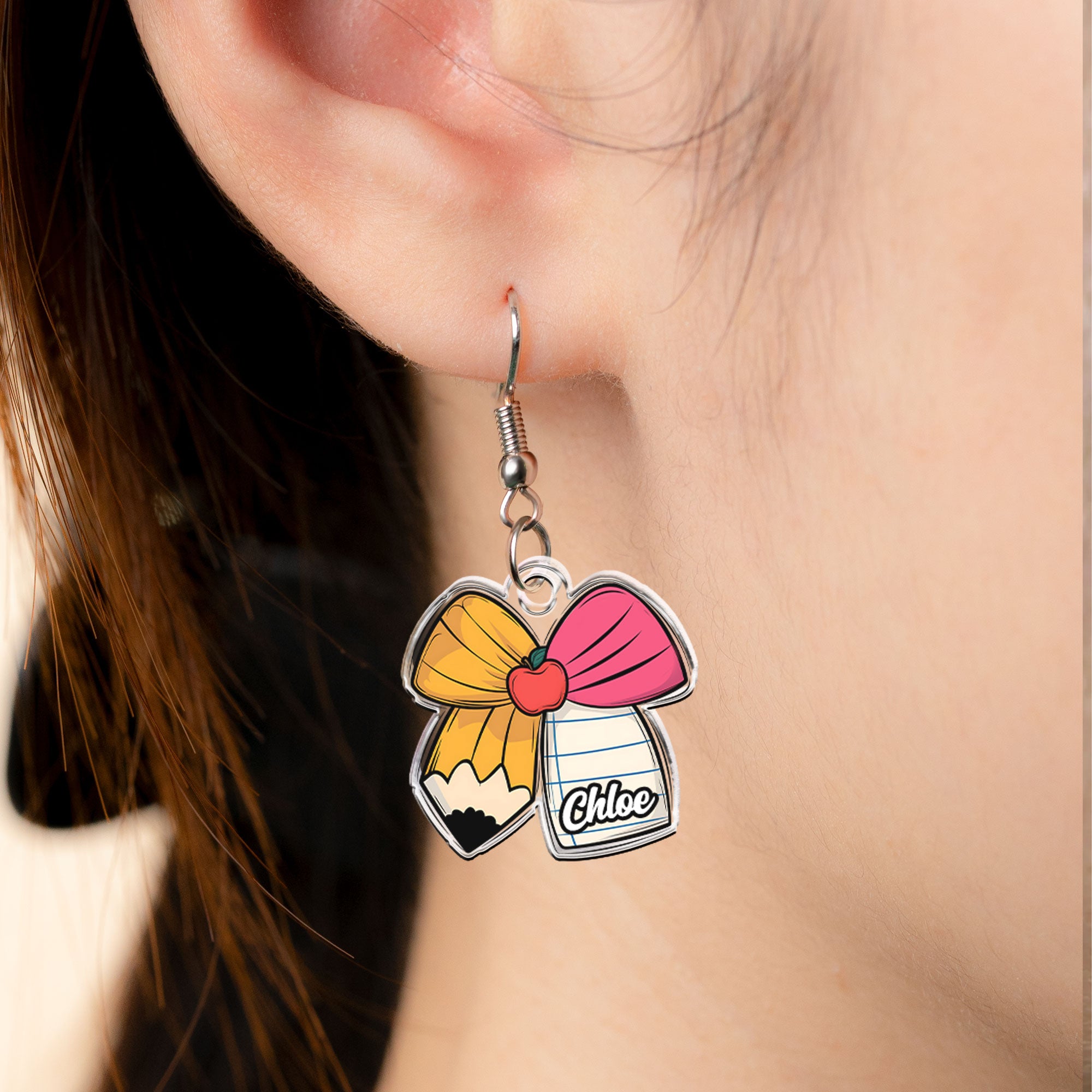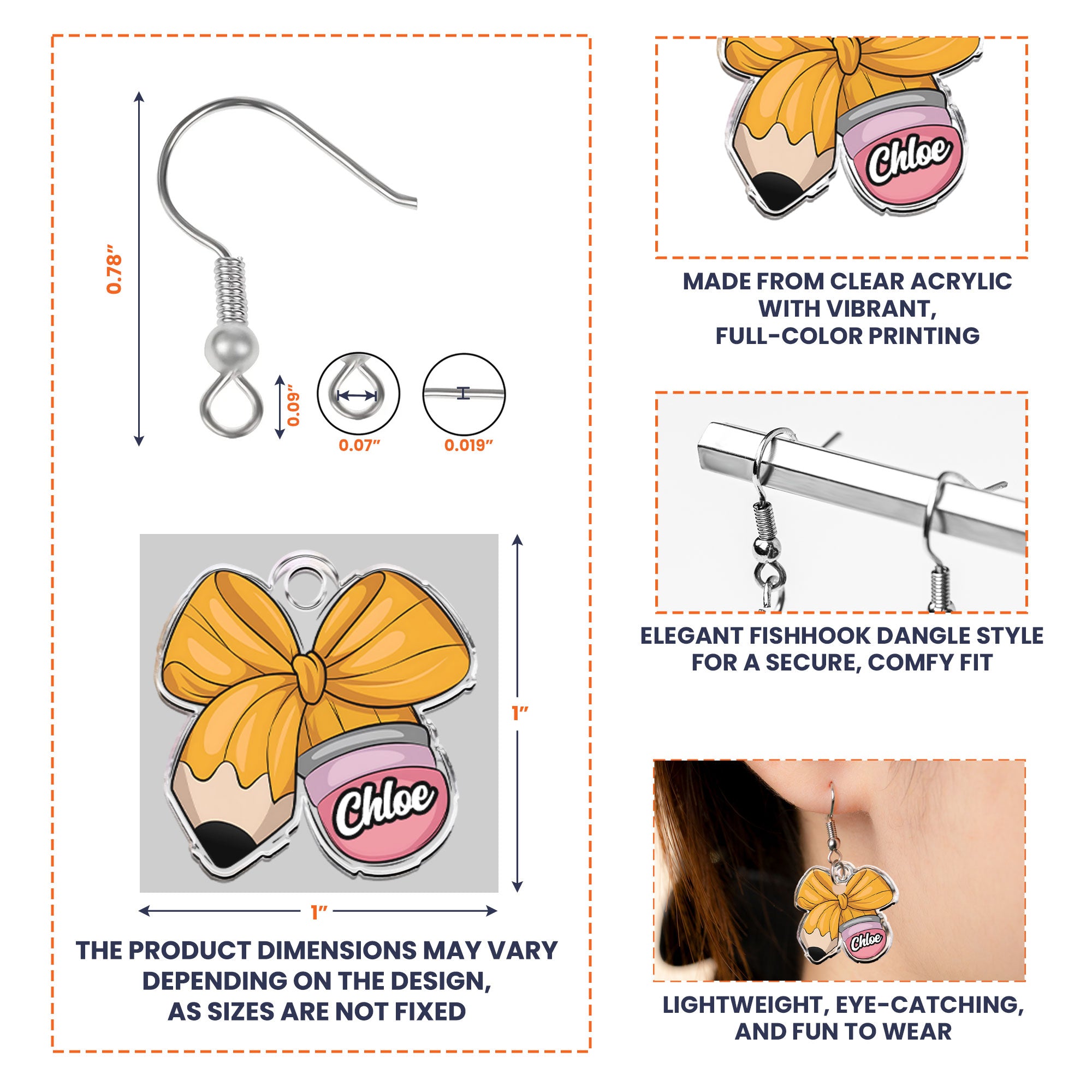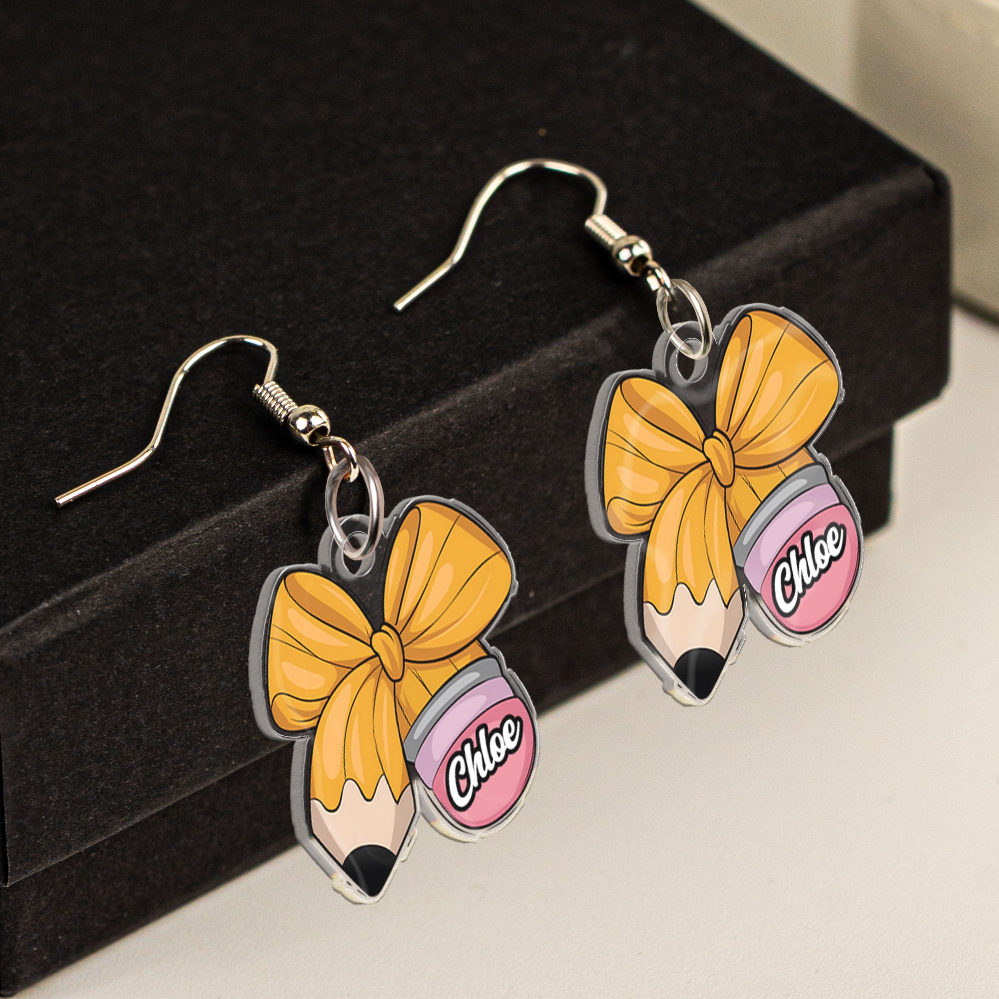 Show your favorite teacher how much you appreciate them with our Personalized Acrylic Earrings - a Teacher Gift Custom Name Pencil Crayon Bow. These unique earrings are an excellent way to highlight the special bond shared with your dedicated educators. They symbolize the strong resemblance between a teacher's guidance and the bright colors a pencil crayon can bring to a canvas. Perfect for teacher's day, birthdays, Christmas, anniversaries, or any occasion; they are designed to help express your gratitude and appreciation in a stylish way.