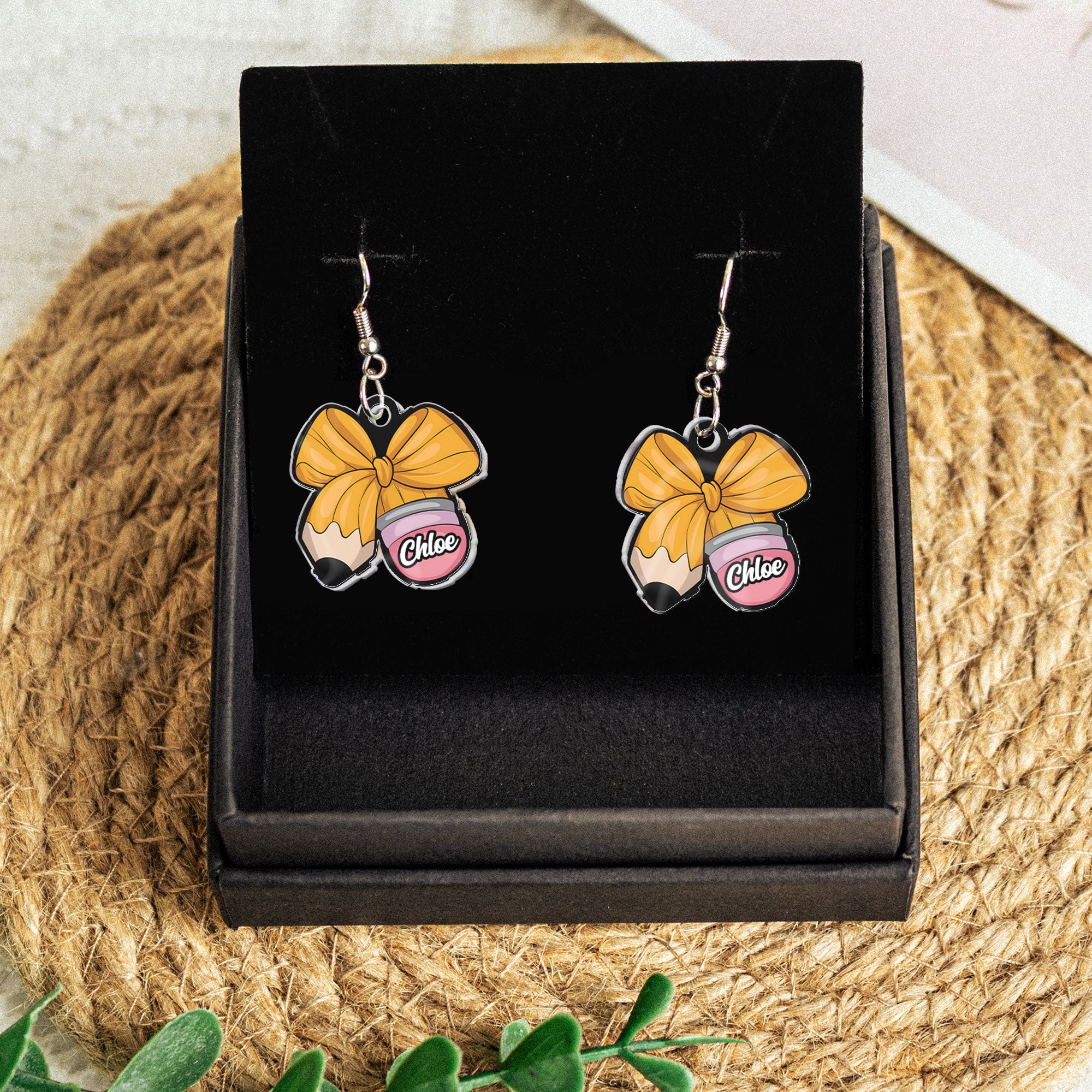 Every feature of these acrylic earrings is crafted with love and attention. The pencil crayon bow design with the teacher's name makes it even more special. What an artistic way to embellish and enjoy anyone's love for teaching! It's not every day that you find a gift that matches the recipient so well and caters to gift-giving so perfectly. Why not make their day a little brighter with a purchase or gift of these charming and commemorative earrings today?