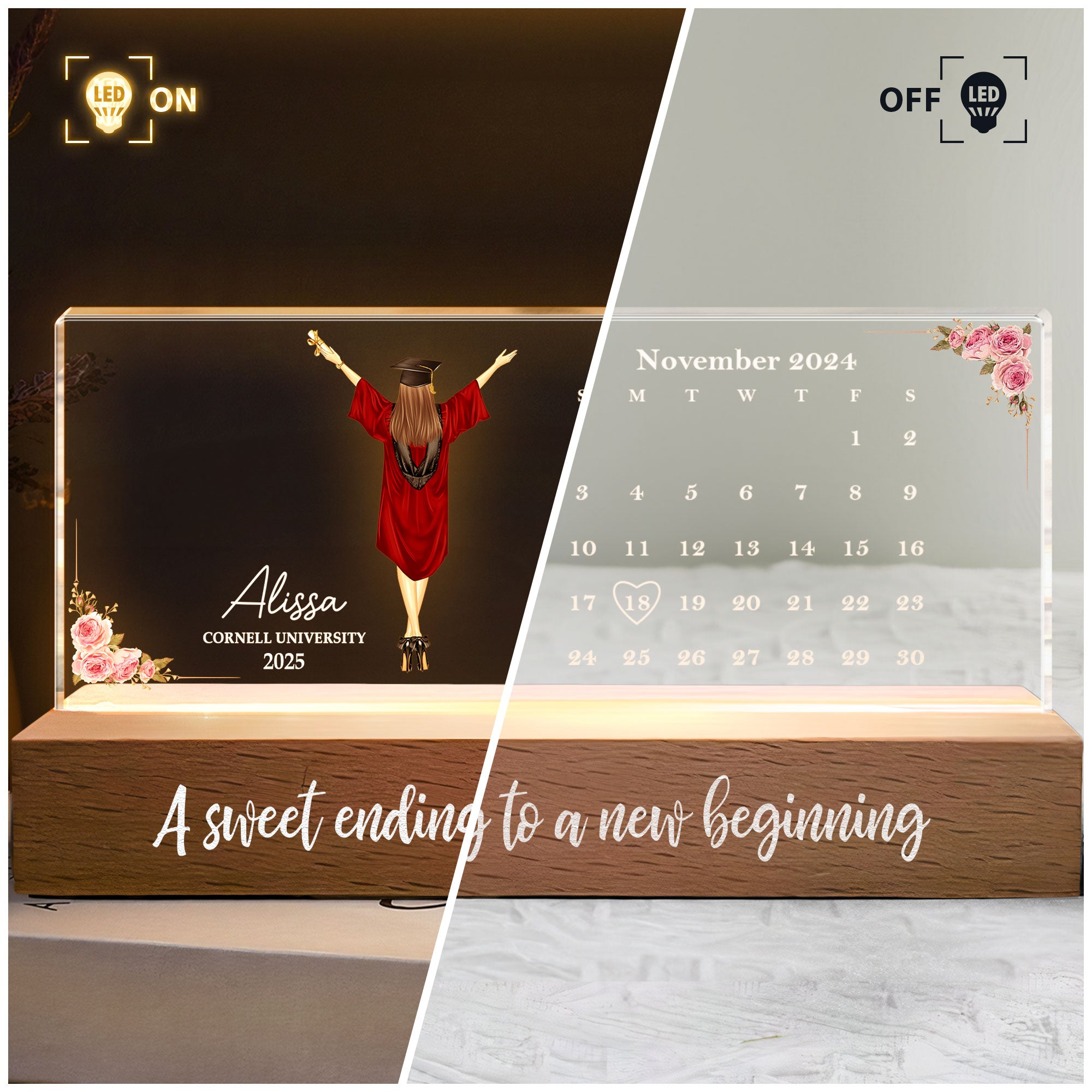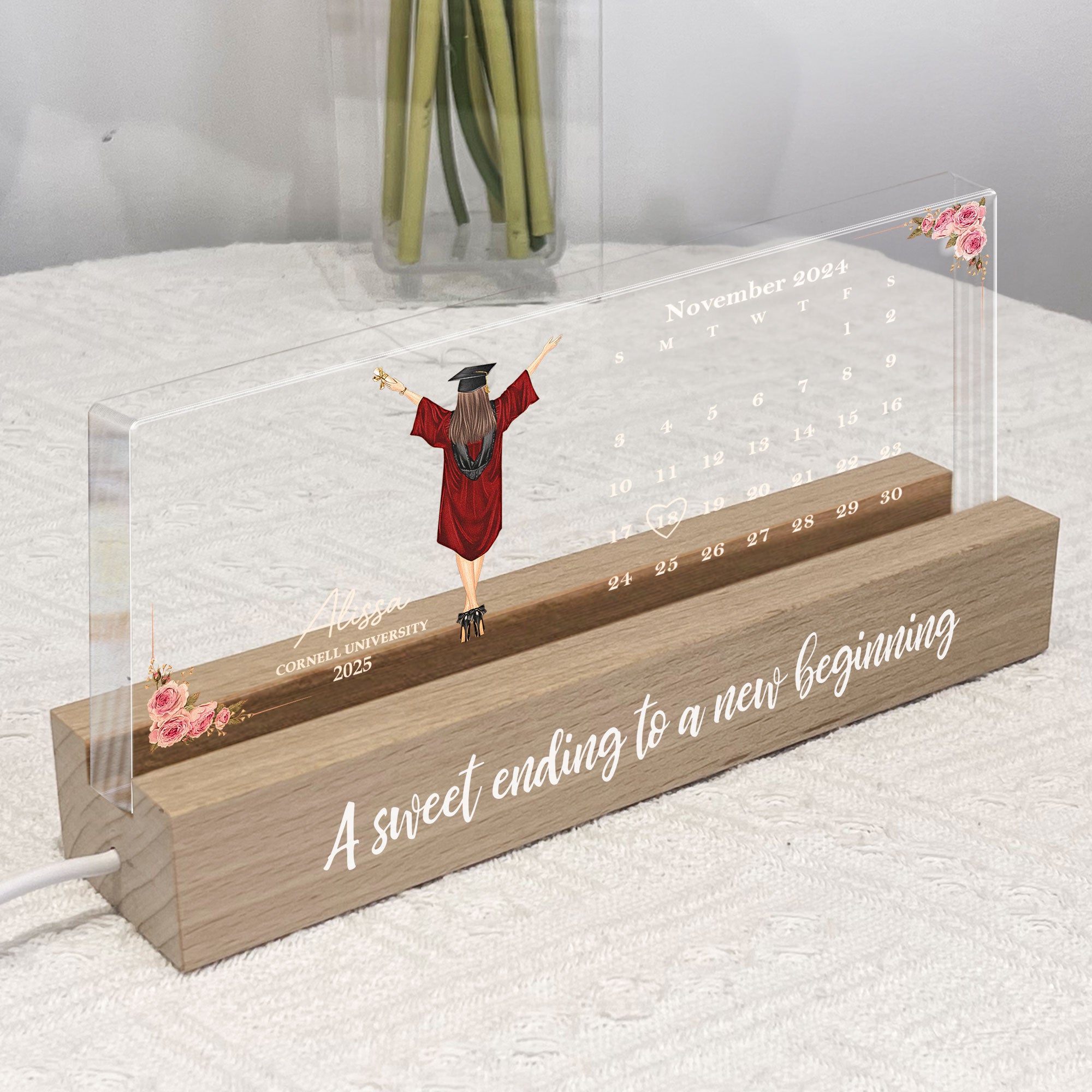 Celebrate a special milestone with this personalized LED night light, perfect for graduations. Featuring calendar highlighting the big day, it’s a heartfelt way to commemorate achievements and inspire future endeavors. The warm glow serves as a daily reminder of how far they’ve come, lighting up their space with love and pride. Ideal for besties, daughters, sons, or anyone you’re proud of, this unique keepsake makes the perfect gift for marking this unforgettable moment.
