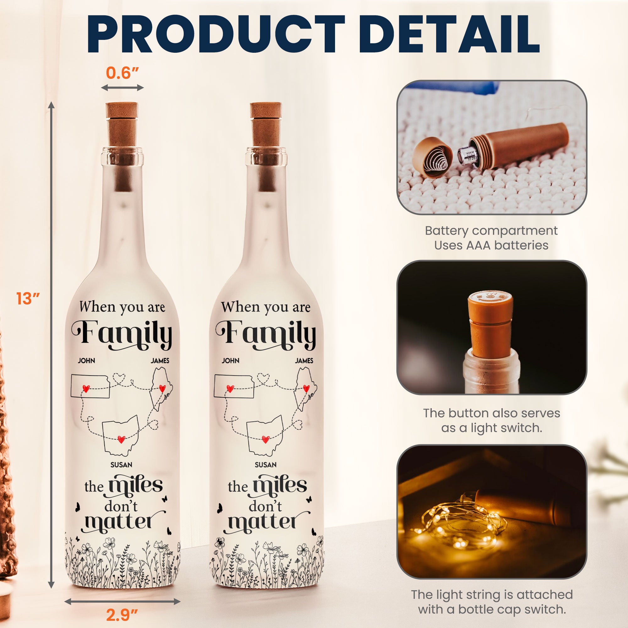 + Cork Lid: Features a realistic cork stopper on top, giving the lamp a charming vintage bottle appearance. A simple switch allows you to easily turn the lights on or off and enjoy the romantic glow of the LED fairy lights.