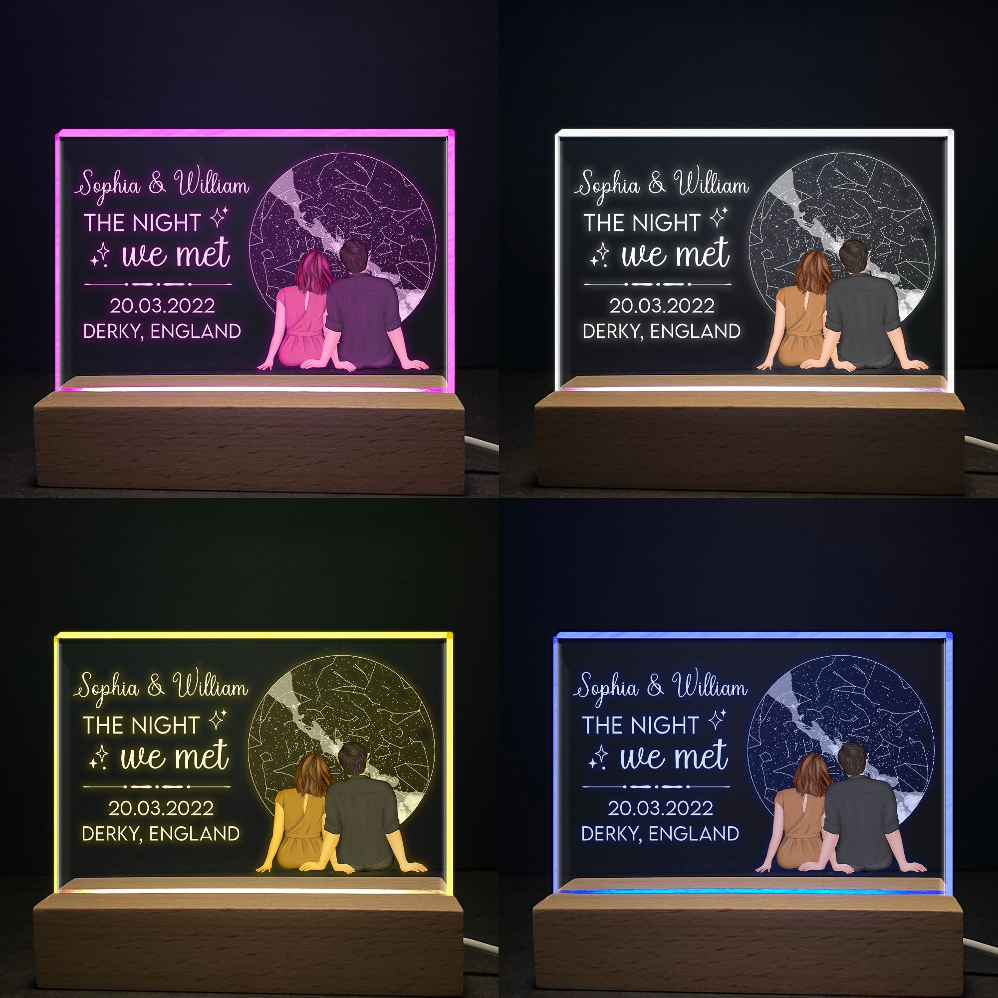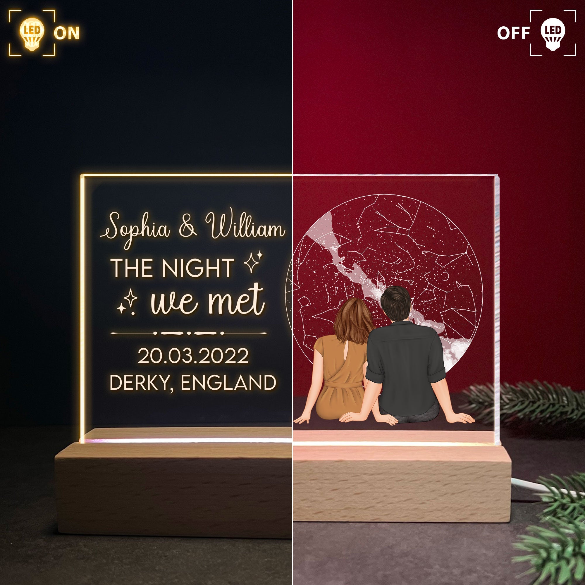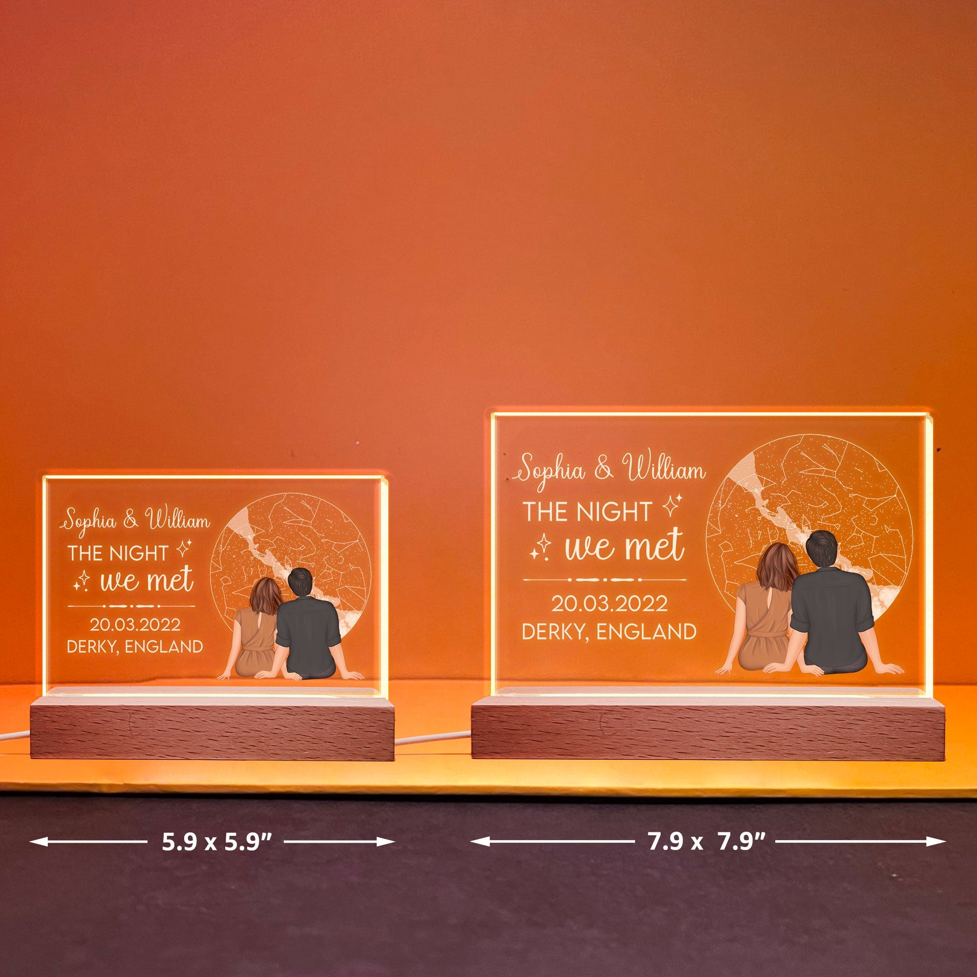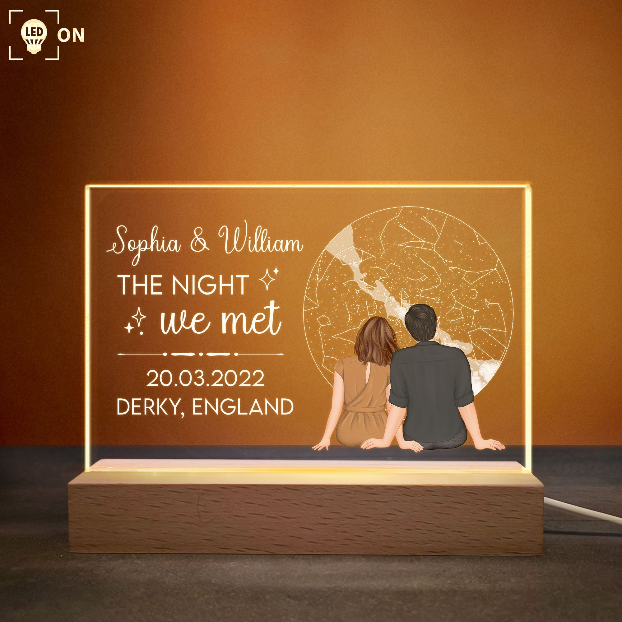 The most meaningful gift you've given. Our beautiful star maps couple night light showing the unique alignment of the stars in a place and time chosen by you. It might be a planned engagement, or it might be an unofficial outing. No matter how it happened, an custom star map lets you look back on where it all began. And while the gift might be for the special someone in your life, it’s a gift you can enjoy, too! Hang your star map in your home so you can always look back at the time when your love was just starting to grow. Perfect anniversary gift, birthday gift, Valentines' Day gifts for couples, husband, wife, boyfriend, girlfriend. A great night light with lights that you can customize every detail as you wish.