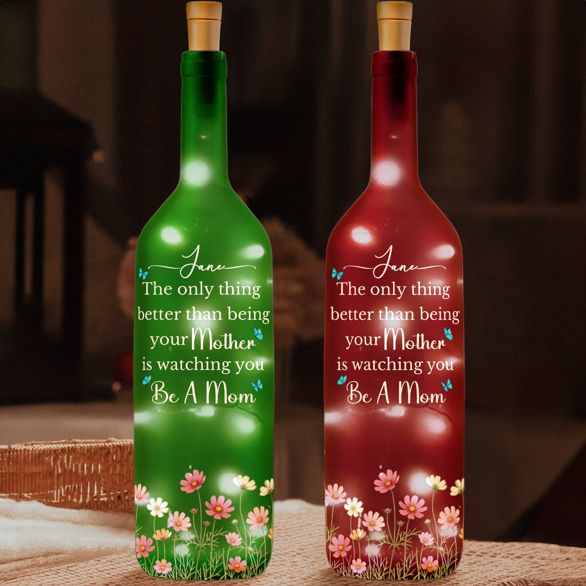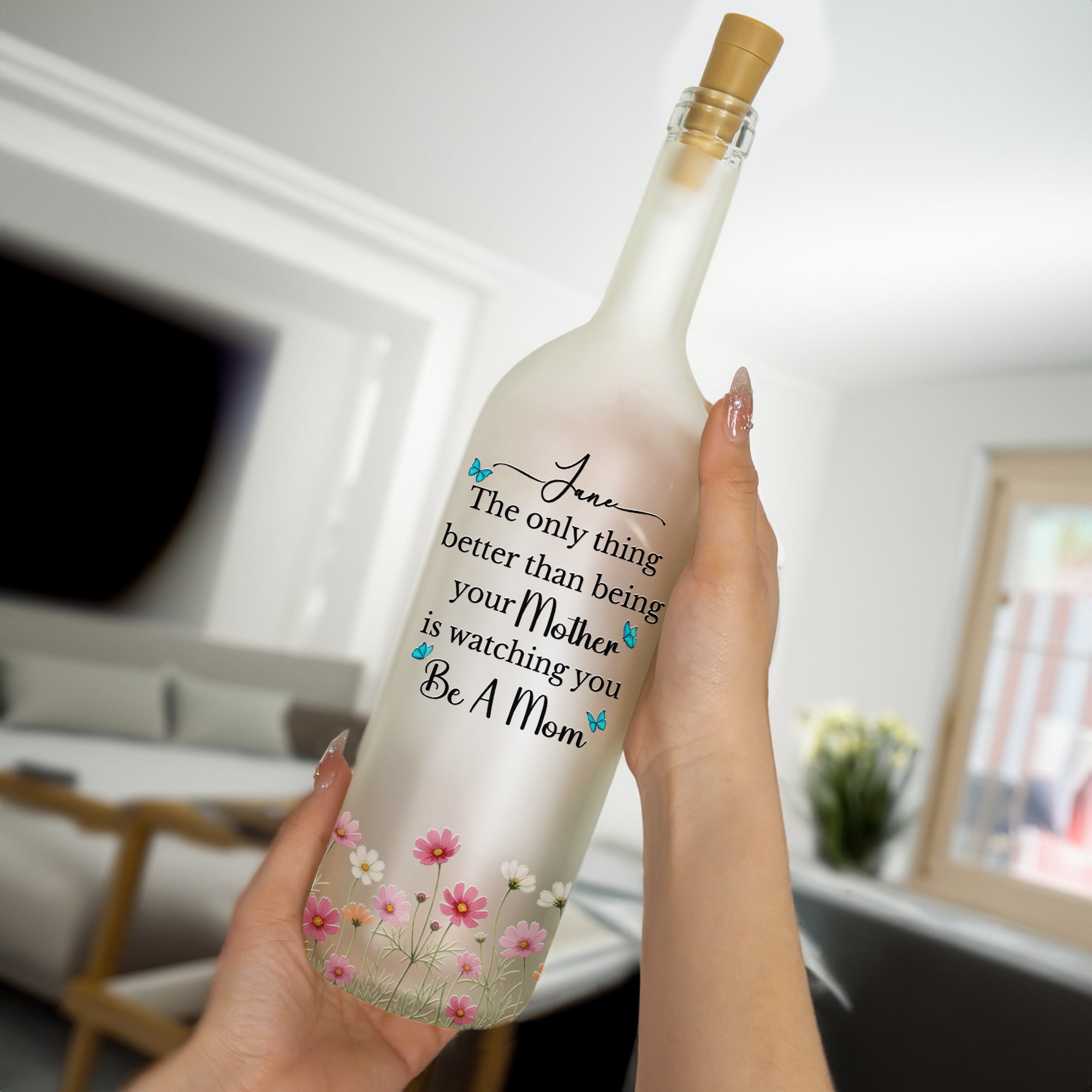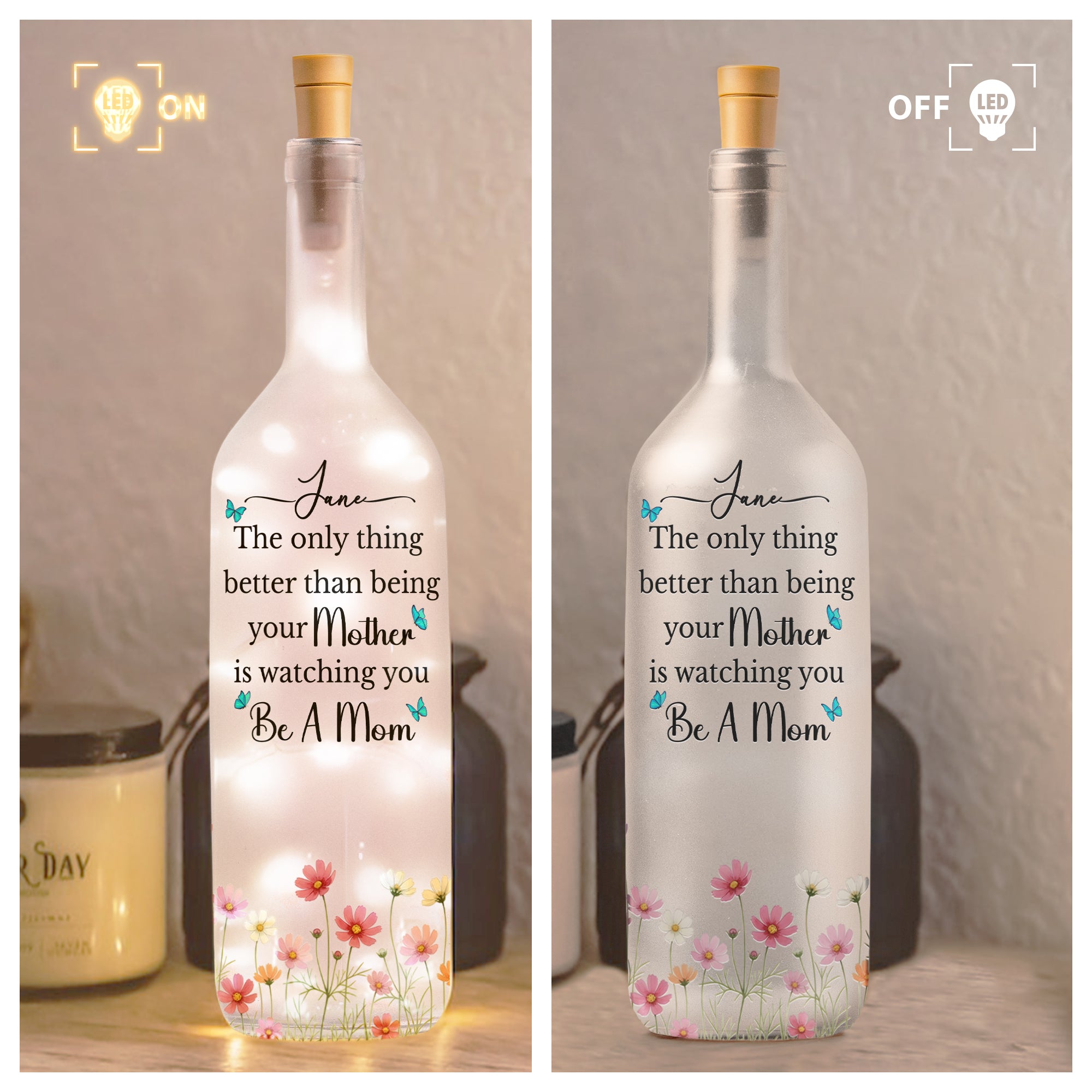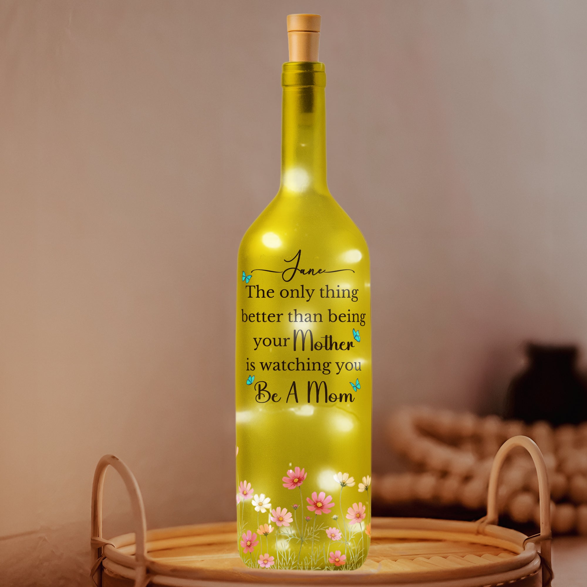 Introducing our touching Bottle Lamp, intricately designed with heartfelt messaging, "The Only Thing Better Than Being Your Mother Is Watching You Be A Mom". This unique gift underscores the powerful connection between mother and daughter, encapsulating the warmth and love that hallmark this precious bond. The personalized lamp makes a statement that goes beyond illumination, casting light on those unspoken sentiments of admiration, respect, and adoration.