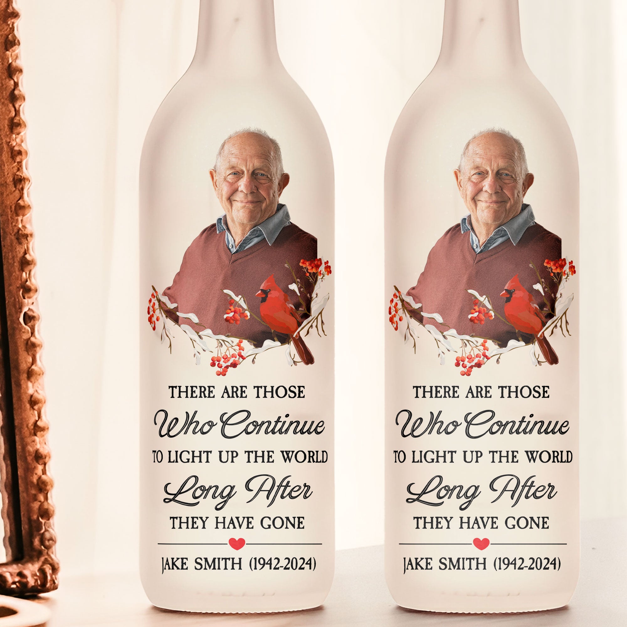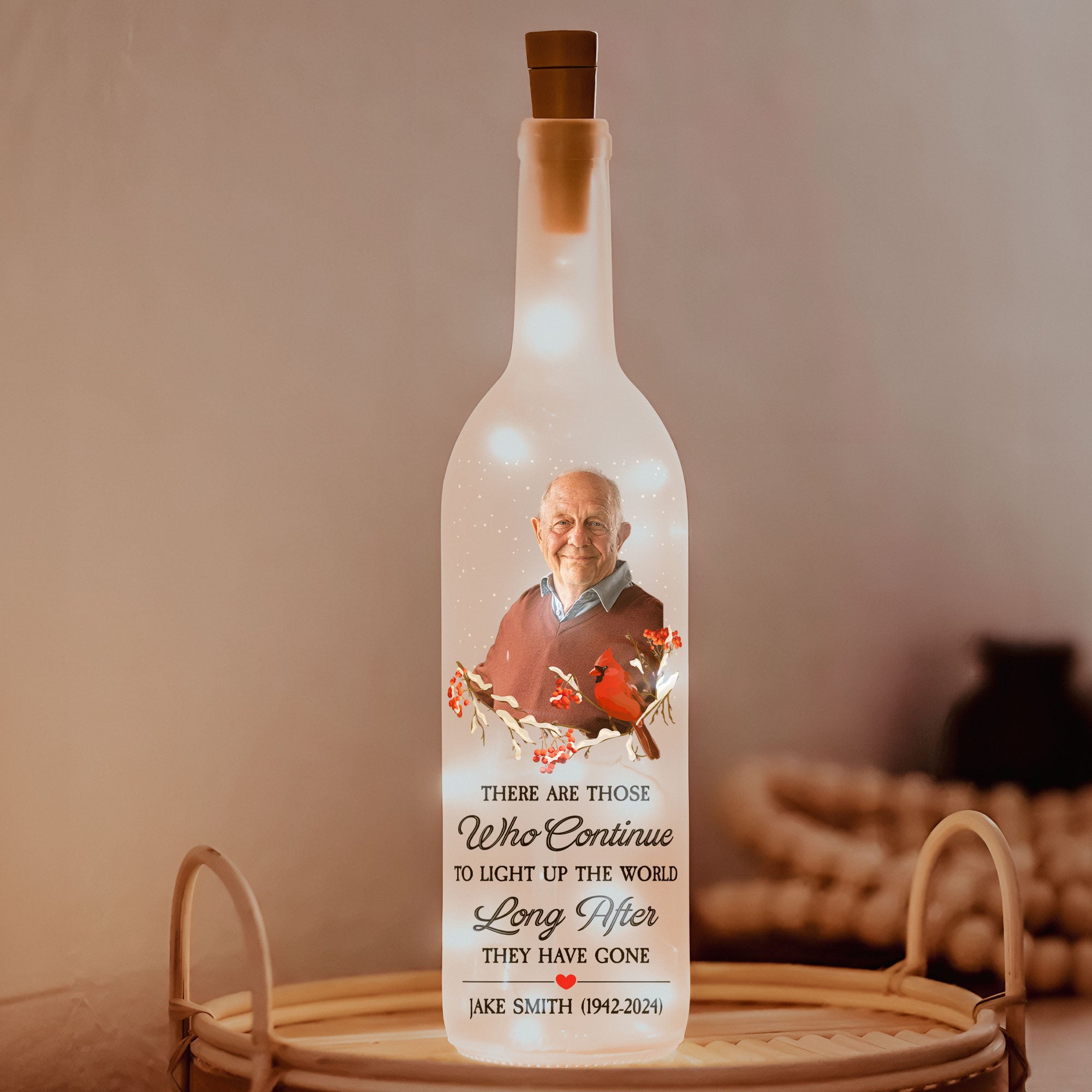 Honor the memory of a loved one with our touching bottle lamp, designed as a heartfelt memorial piece. Featuring the meaningful phrase, “There are those who continue to light up the world long after they have gone,” this lamp serves as a beautiful reminder of their lasting impact.
